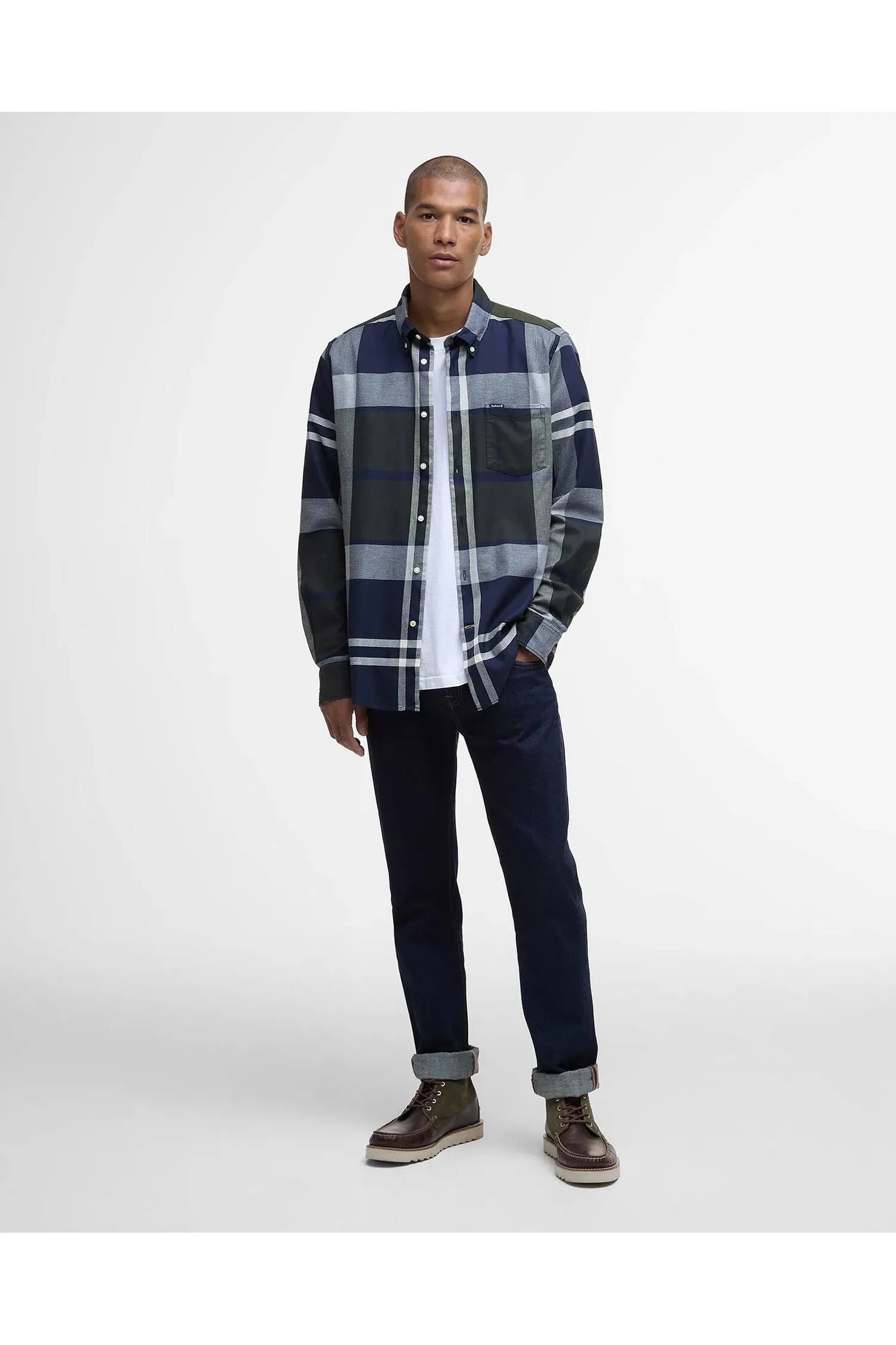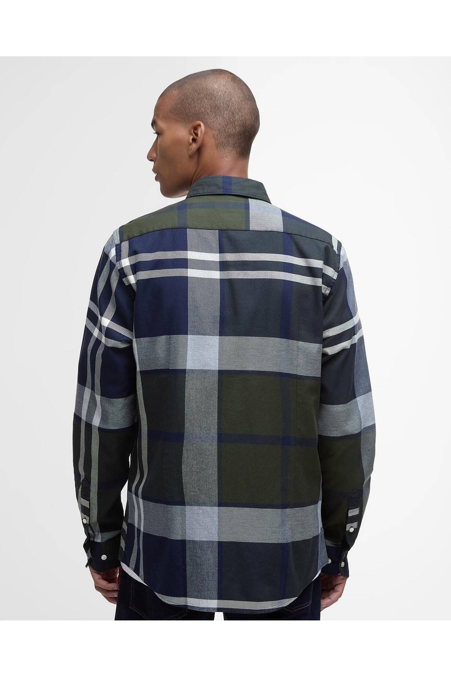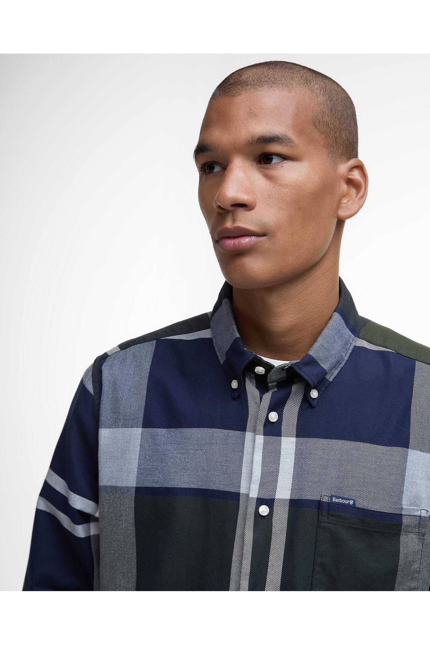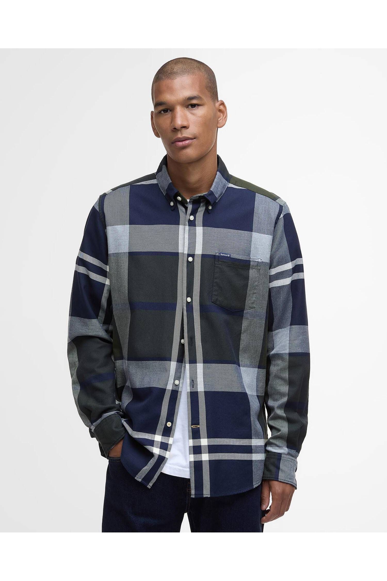 The Barbour Dunoon Shirt is a 100% cotton, long-sleeved shirt featuring a distinct dark green, navy tartan check pattern. Designed with a tailored fit, it includes a button-down collar, adjustable cuffs, and a chest pocket with a branded label.