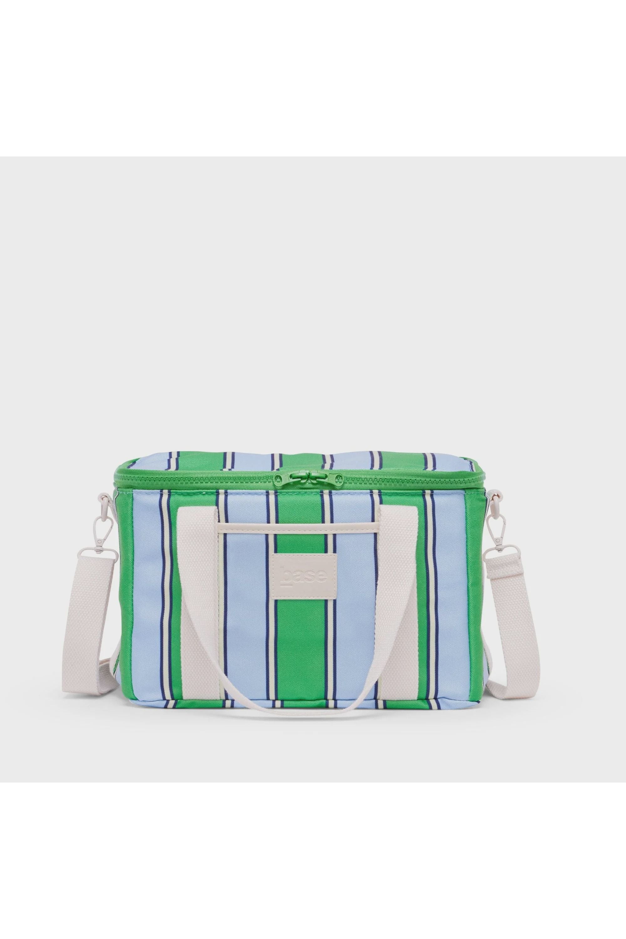 Add coastal cool to your beachside essentials. This compact cooler is made from durable, water-resistant fabric and is perfectly sized to hold bottles, cans, and snacks.