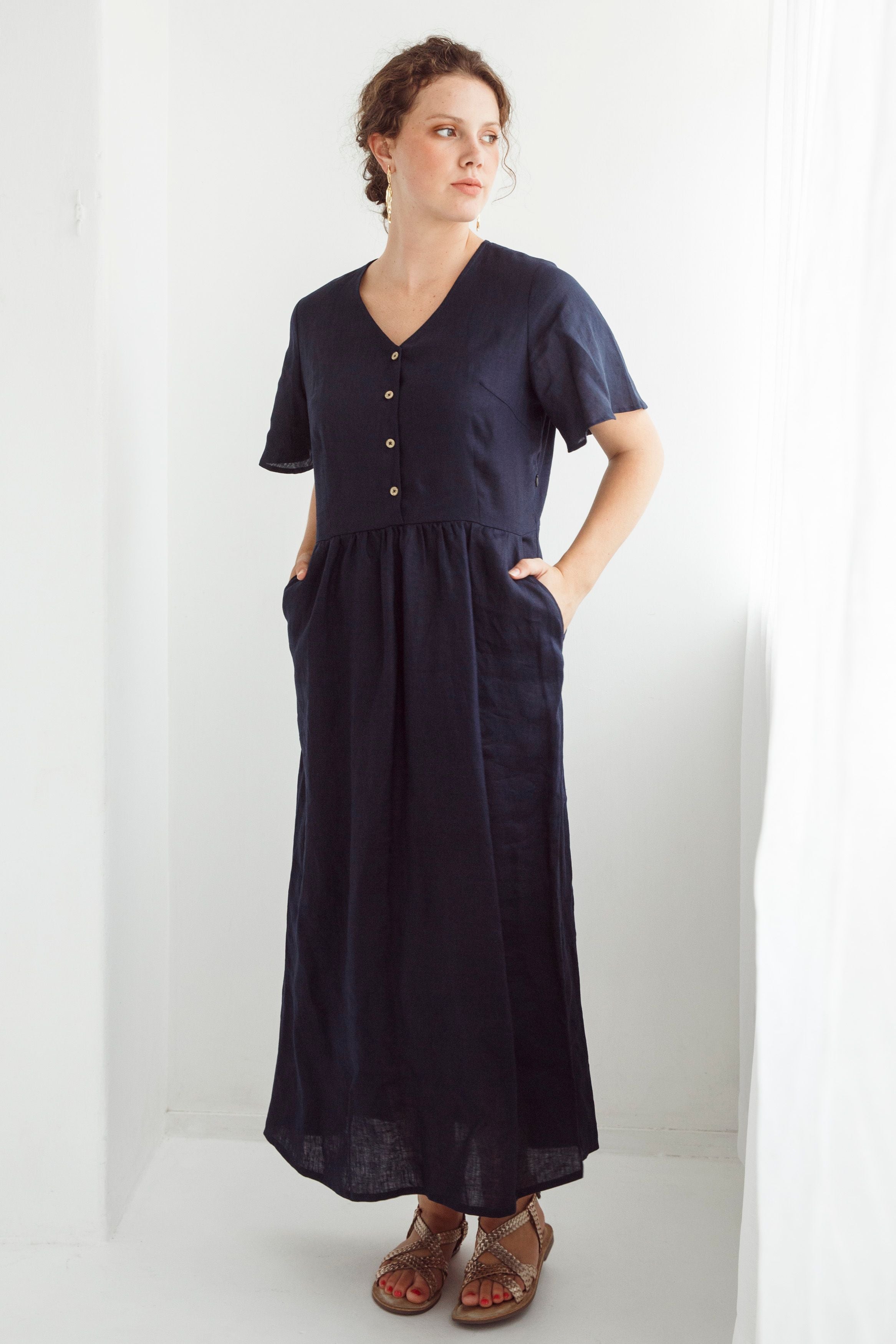 A modern romantic midi, designed for easy elegance. Featuring a button-through bodice with a flattering V-neckline, softly fluted sleeves, and a defined waist that falls into a gently gathered skirt. Finished with angled front pockets for a touch of ease and an invisible side zip for a smooth fit.