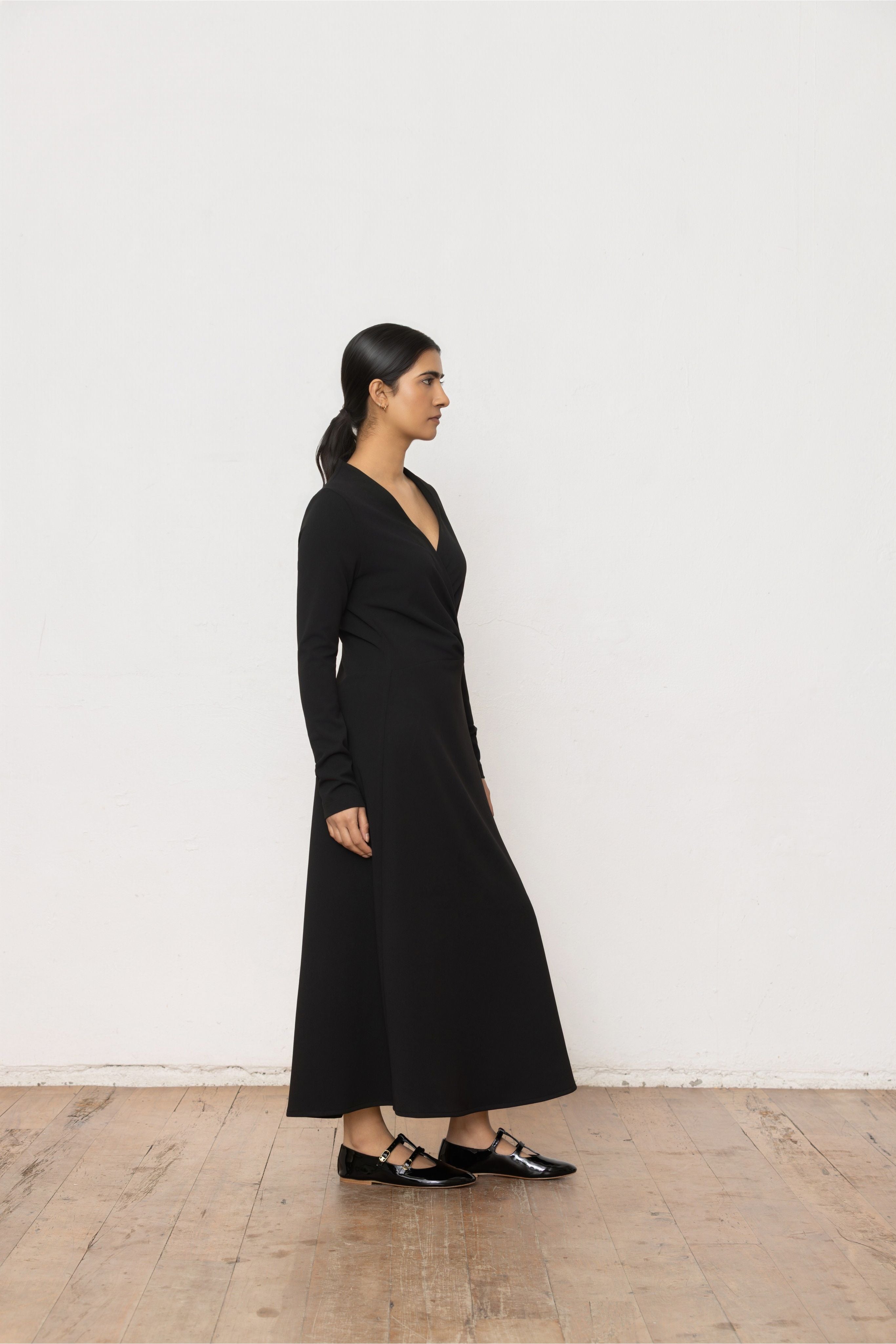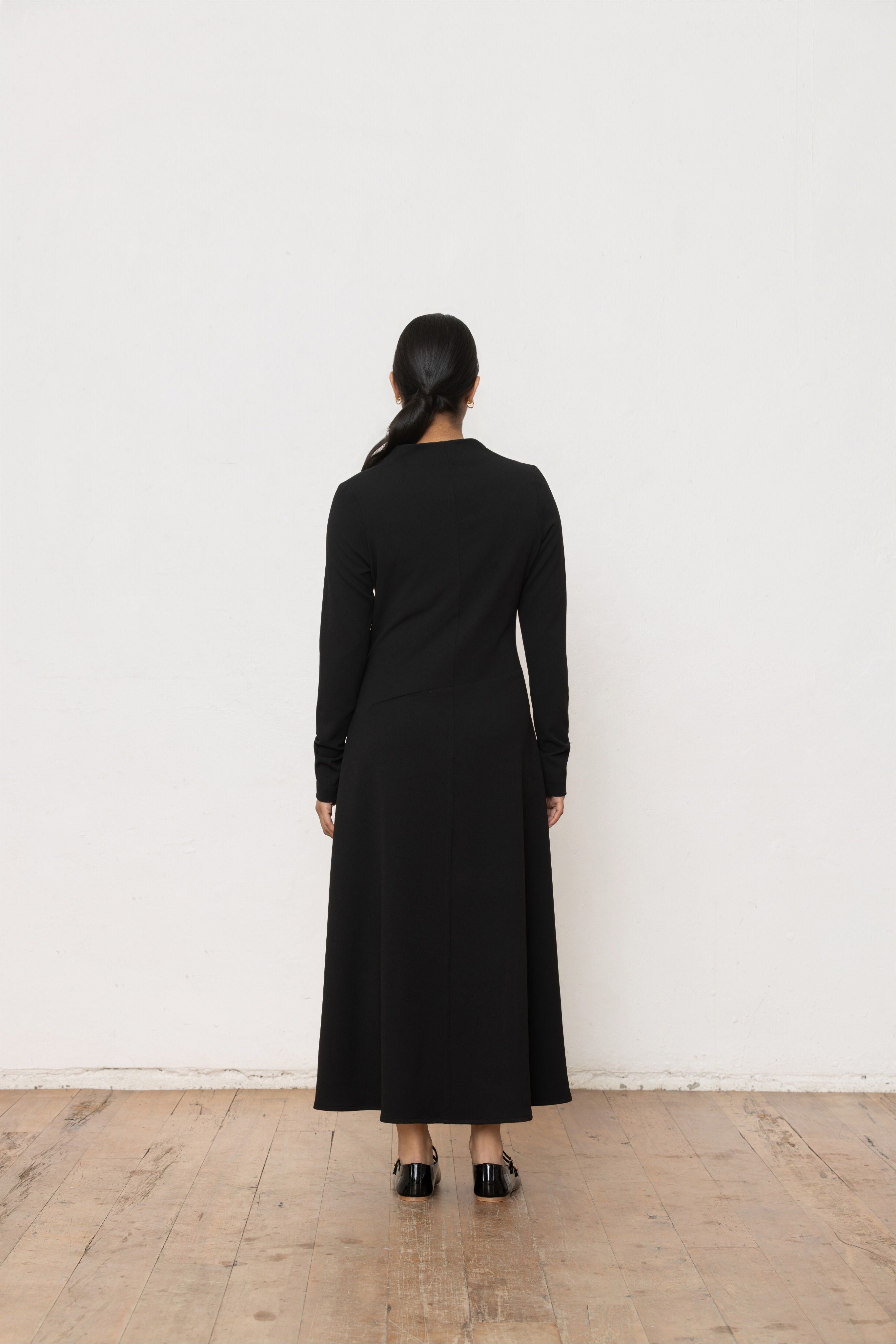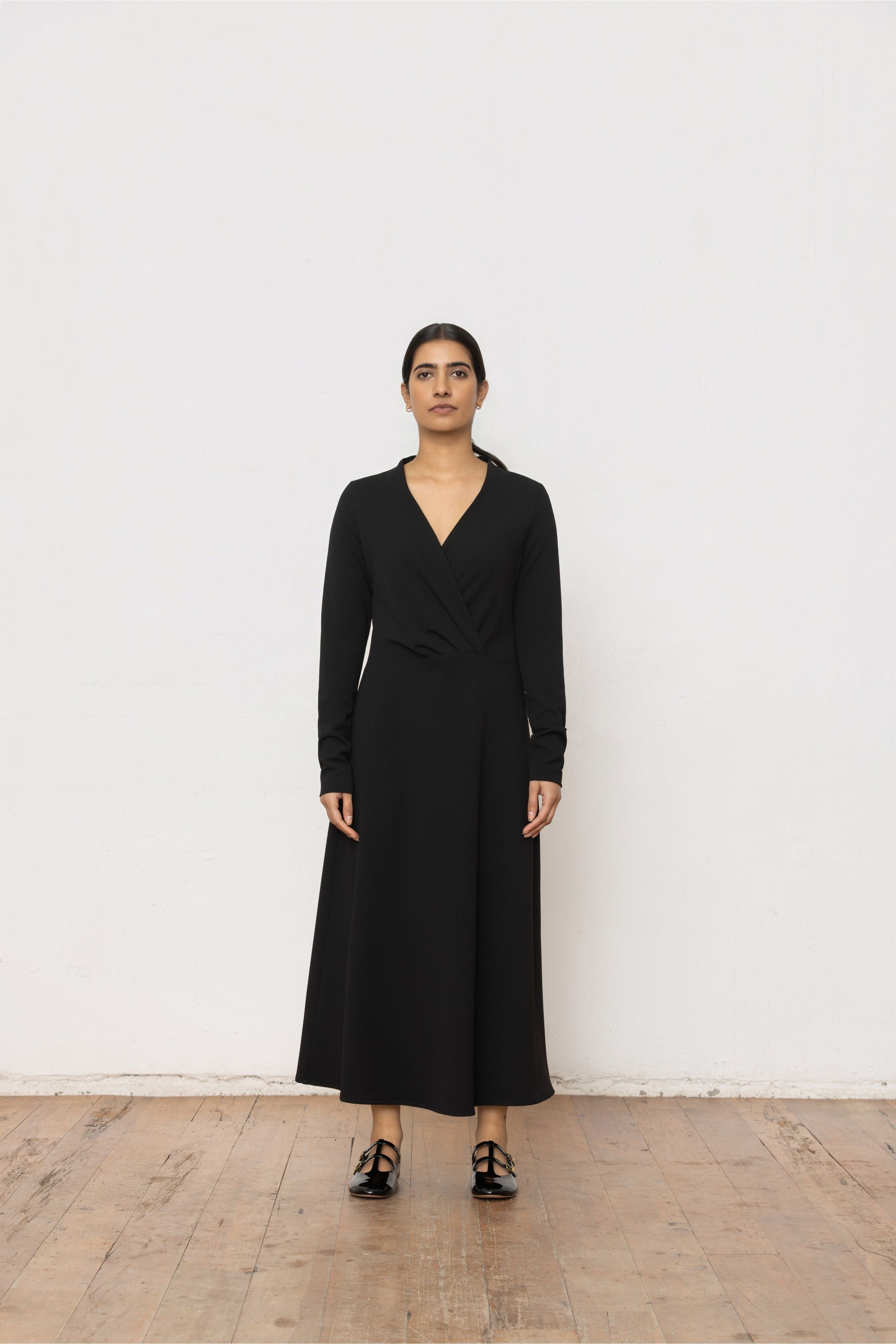 Refined and quietly striking, the Ritual Dress is designed to move seamlessly through occasions. The softly draped crossover bodice creates a flattering V-neckline, balanced by a clean long sleeve and a gently flared skirt that falls to a graceful midi length.
