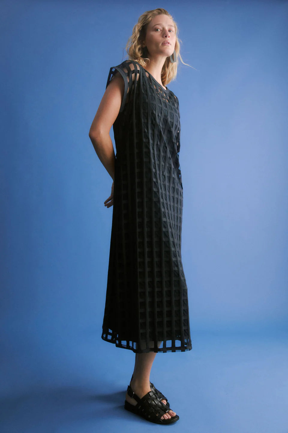 The Grid Burnout Midi Dress is a re-imagining of a favourite ELK style. Crafted from an organic cotton blend fabric, this dress showcases a burnout opaque and sheer grid pattern. Accompanied by a scoop neck slip with thick straps, this unique piece is perfect for any event.