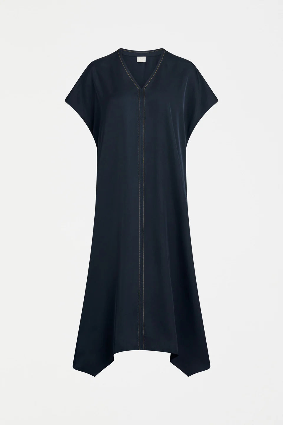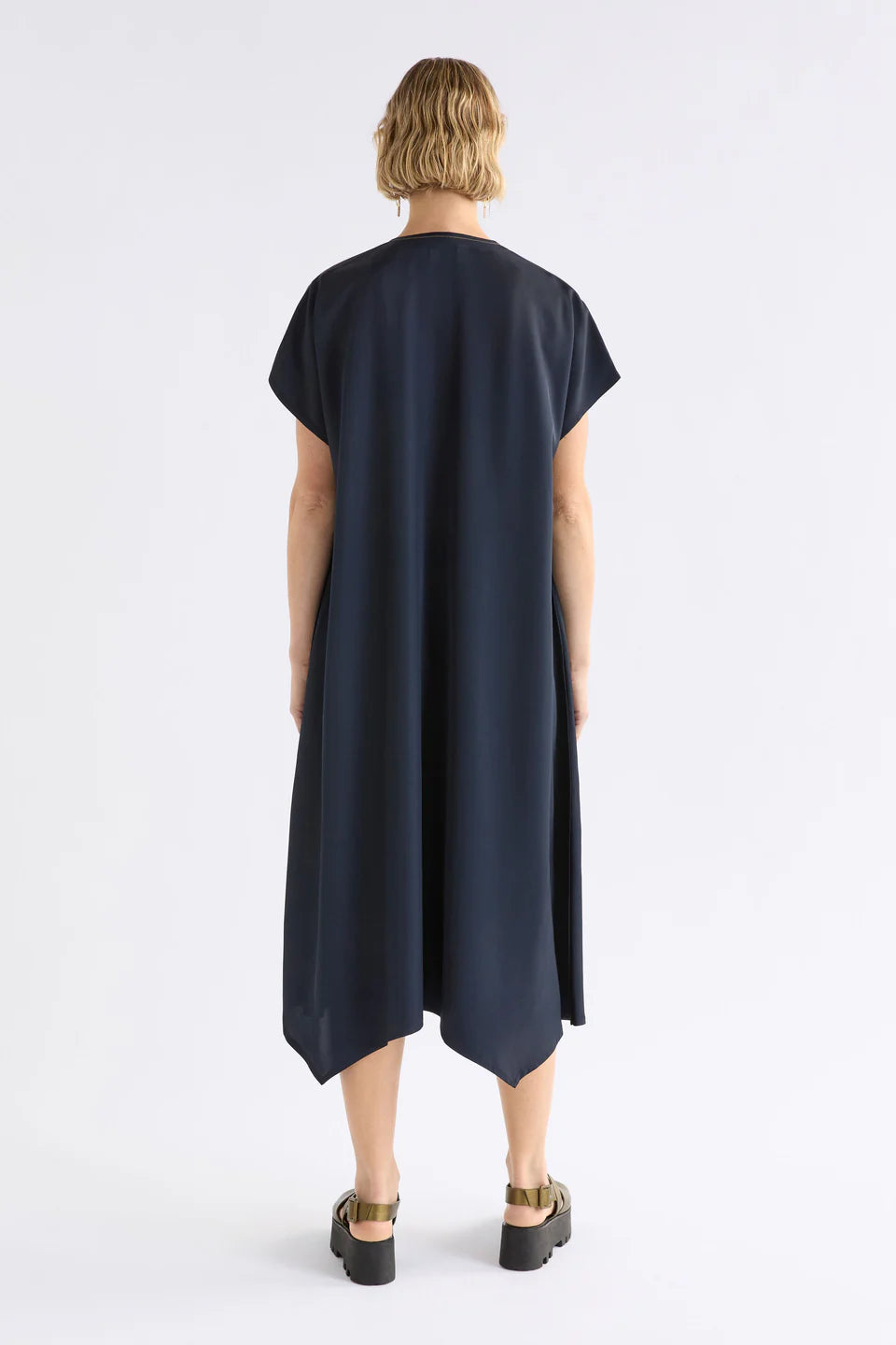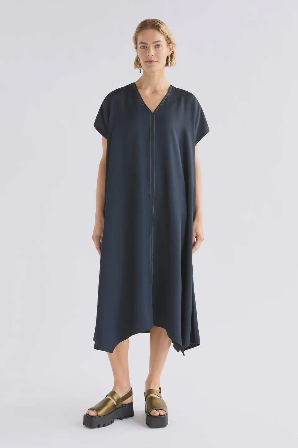 The Hullu Dress combines comfort and sophistication in one piece. This relaxed fit, mid-long dress is crafted from a luxuriously, fluid NAIA™ acetate that offers a cool, structured, silk-like softness, subtle sheen and excellent drape and breathability. Featuring a unique handkerchief hemline, flattering v-neckline, contrasting topstitching for added definition and structure and short bat winged sleeves.