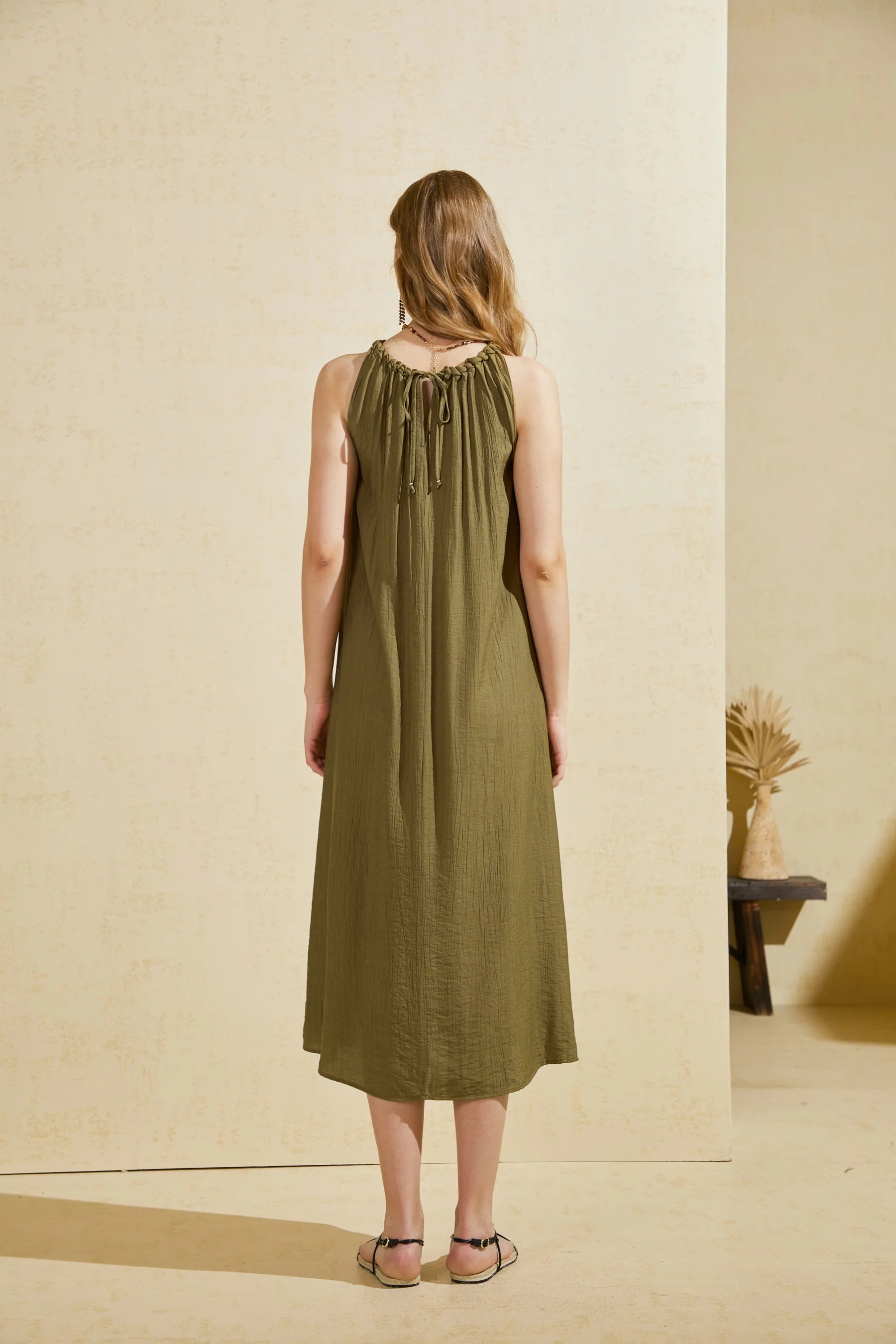 A distinctive gathered halter neckline cinched with a narrow ruched band, creating soft pleats that fall from the collarbone downward. The gathered band is made of small fabric-covered knots or loops, offering a handcrafted, almost sculptural look. A-line, maxi-length silhouette, falling to the ankles or floor. It flows away from the body for an effortless, unstructured fit.