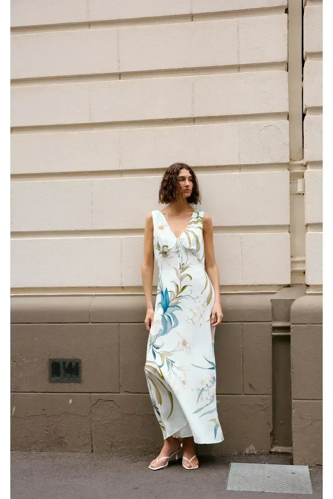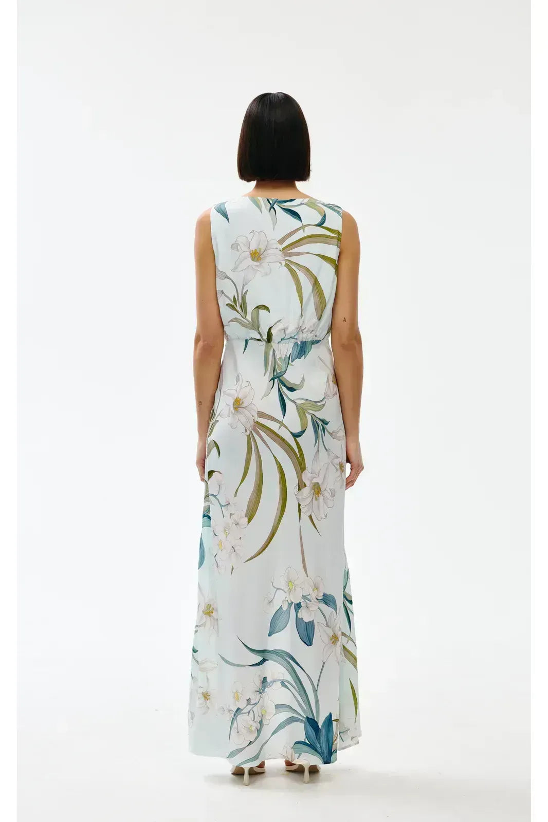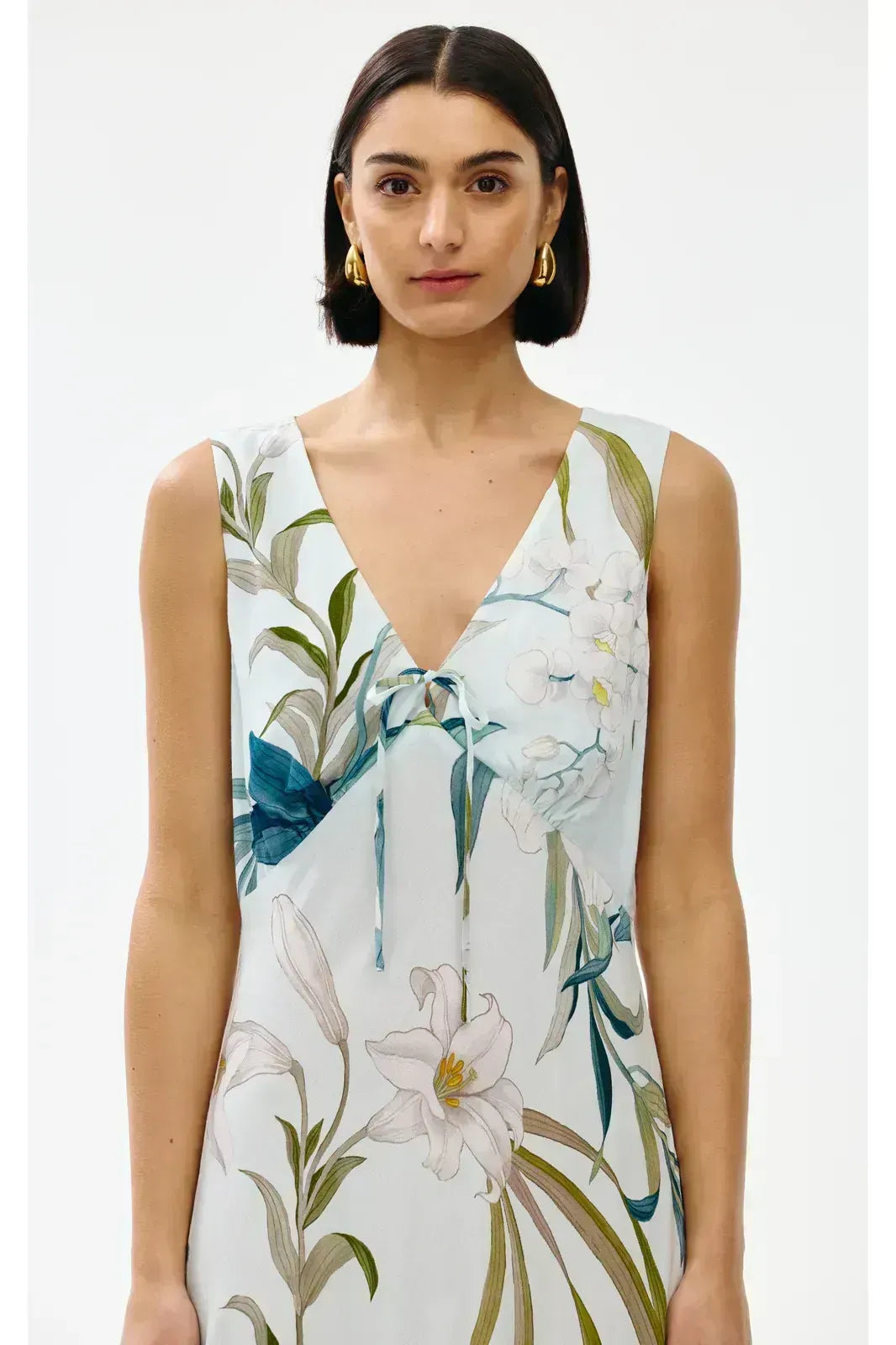 Crafted from a lightweight fabric, this full-length maxi features a soft botanical print and is designed with a flattering V-neckline and a subtle tie detail at the bust with a relaxed silhouette.