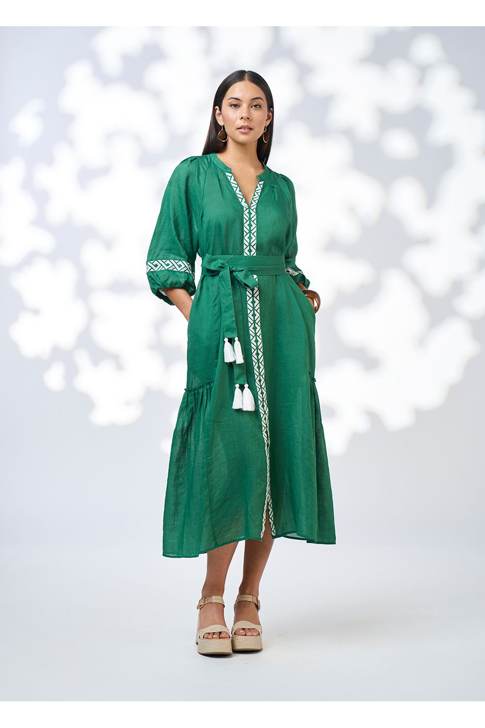 Ramie dress with tuck detailing around V-neckline, with panelled princess seams, and embroidery detailing. Featuring gathered side hem panels and hidden in-seam side pockets. Comes with matching kimono belt.