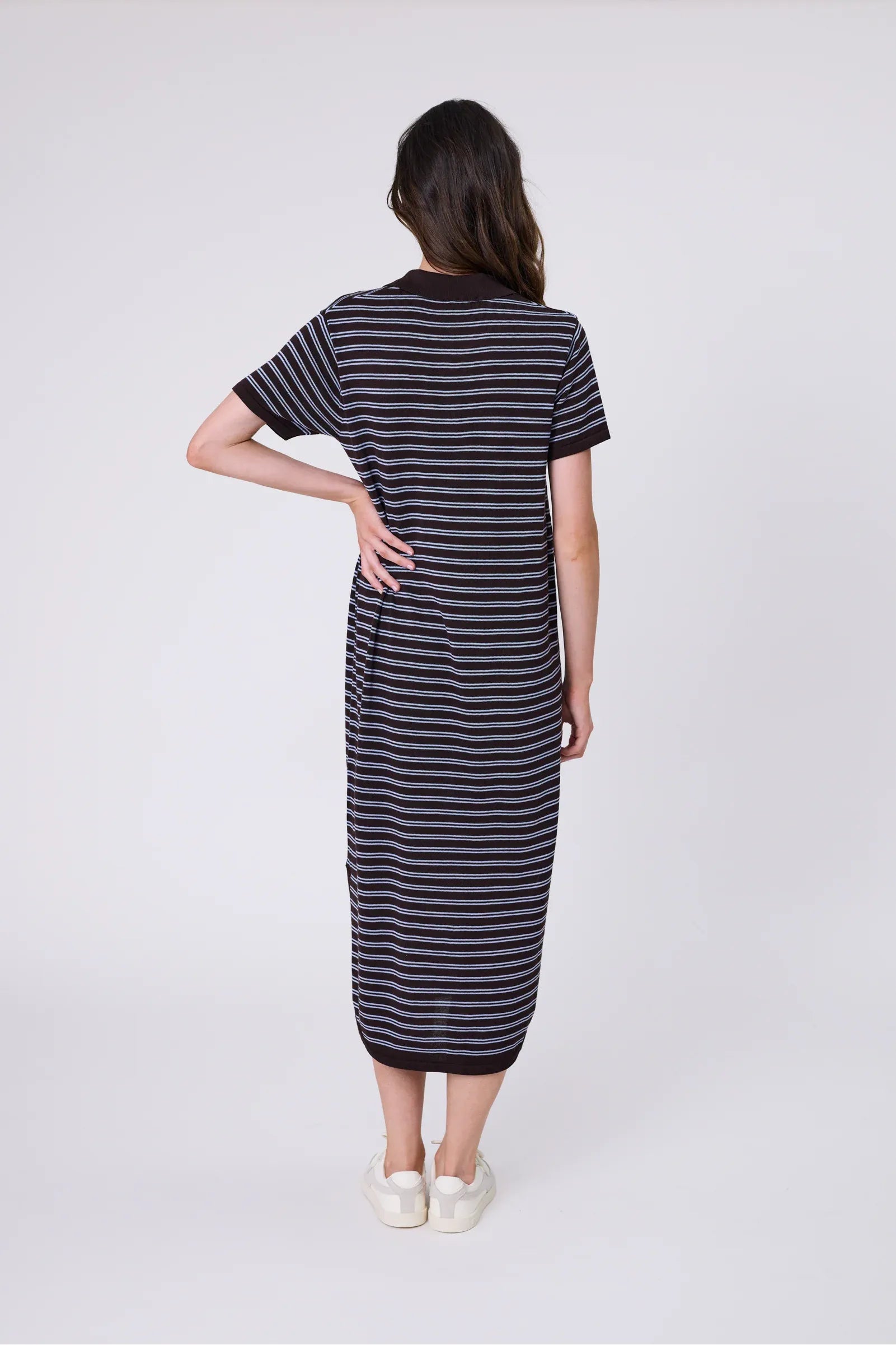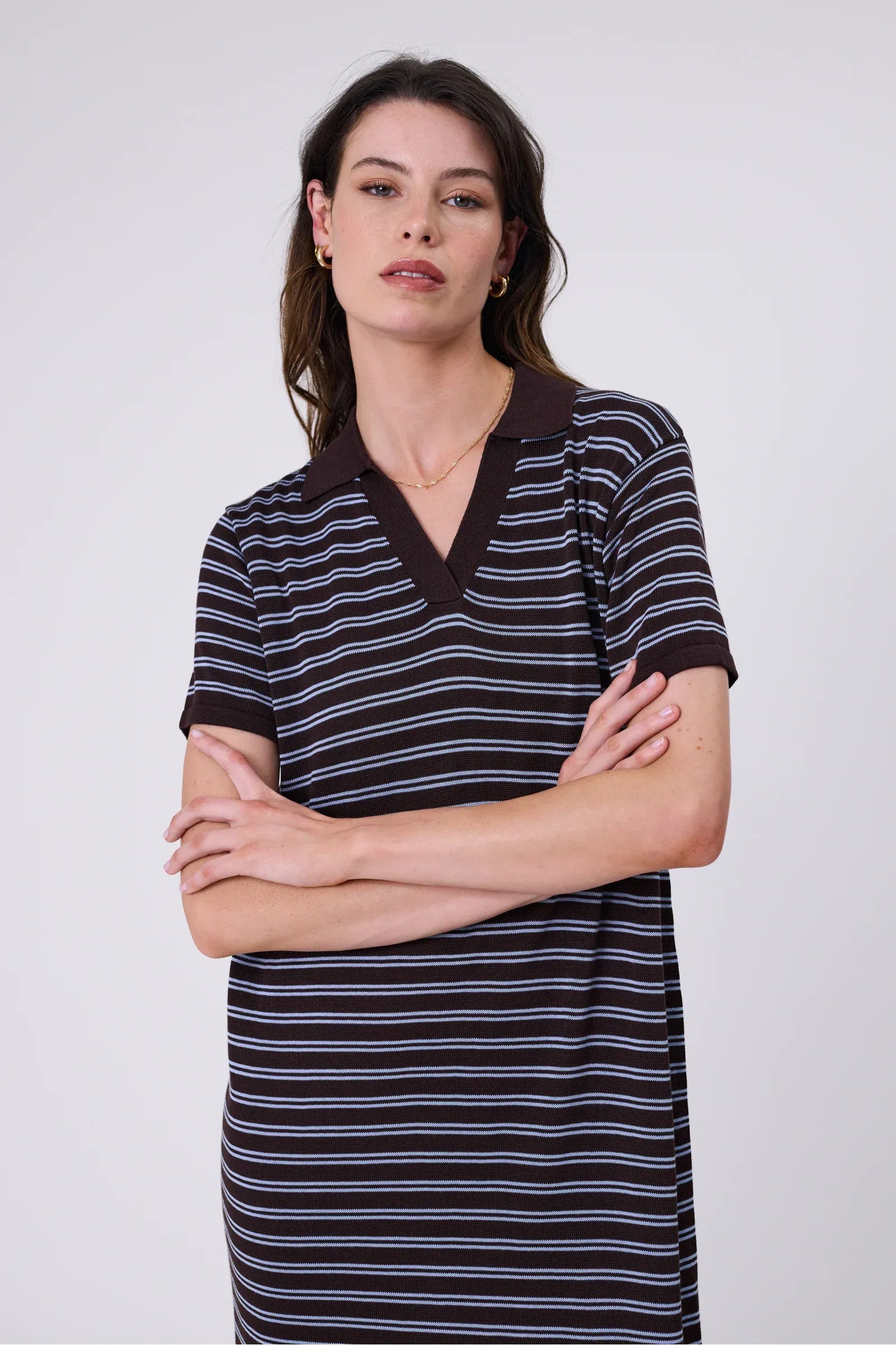 The Chime Knit Polo Dress in Carob Stripe offers an effortless silhouette that balances comfort with style. Crafted in a custom stripe knit with a dark brown base and pale blue stripes, it’s made from a premium cotton-modal blend that combines the strength and breathability of cotton with the silky softness and drape of modal. The result is a lightweight, durable yarn that feels smooth and luxurious against the skin. Designed with a relaxed fit and straight cut, this polo tee dress falls to a midi-to-maxi length, finished with short sleeves, a quarter placket, side splits and a curved hem for added movement and shape. Style it with a cap and sneakers for errands on the go, or switch to sandals for a beach-to-brunch ready look.