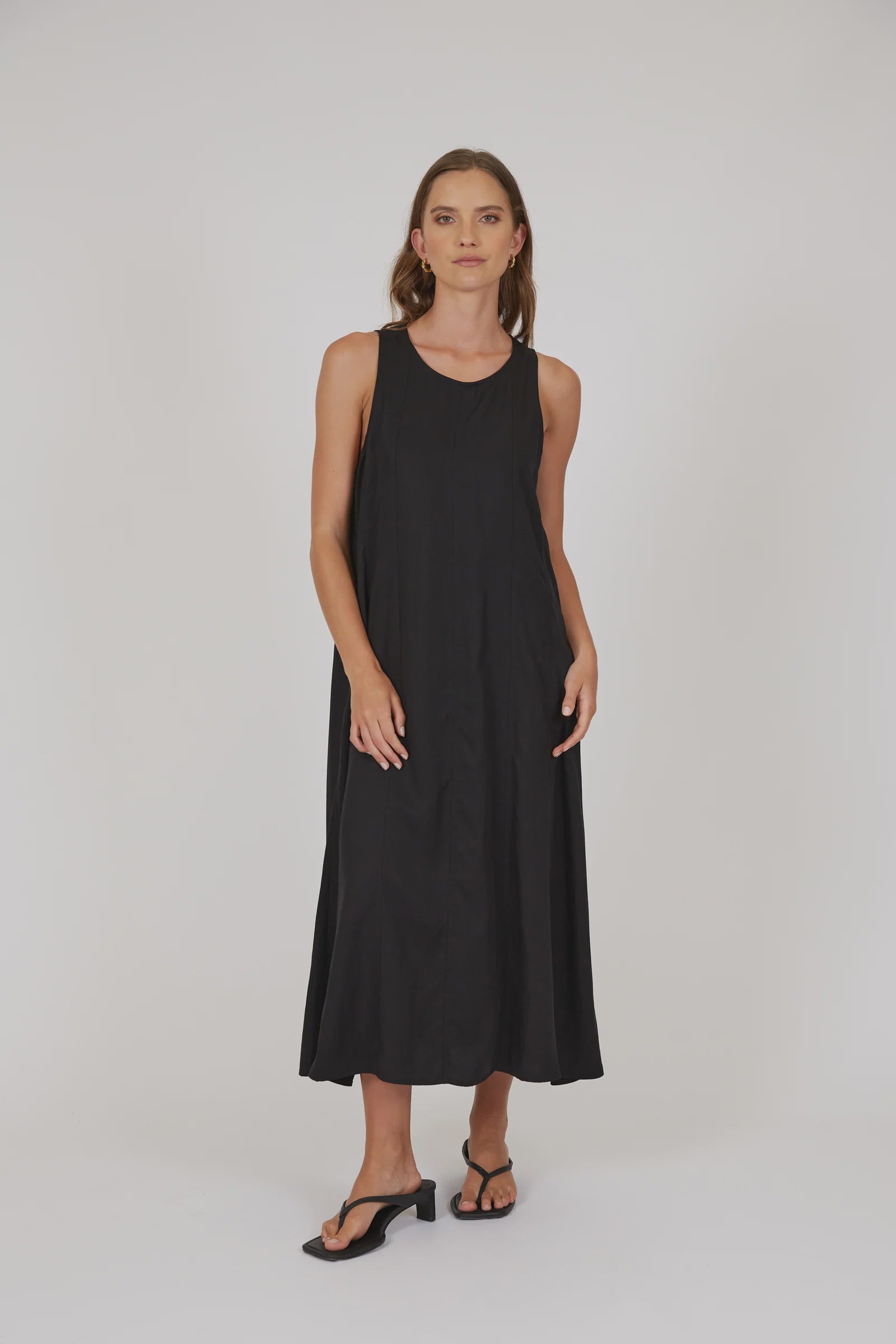 The Palma Dress is your effortlessly polished summer staple - relaxed, flowy, and designed to drape beautifully with every step. Crafted from 100% Tencel for a soft, silky feel, this midi-to-maxi style moves seamlessly from day to night. The sleeveless design and crew neckline create a clean, modern look, while the back keyhole closure and statement fabric bow add a refined touch. Style with slides and a raffia bag for brunch, or elevate with heeled sandals and a clutch for event season.