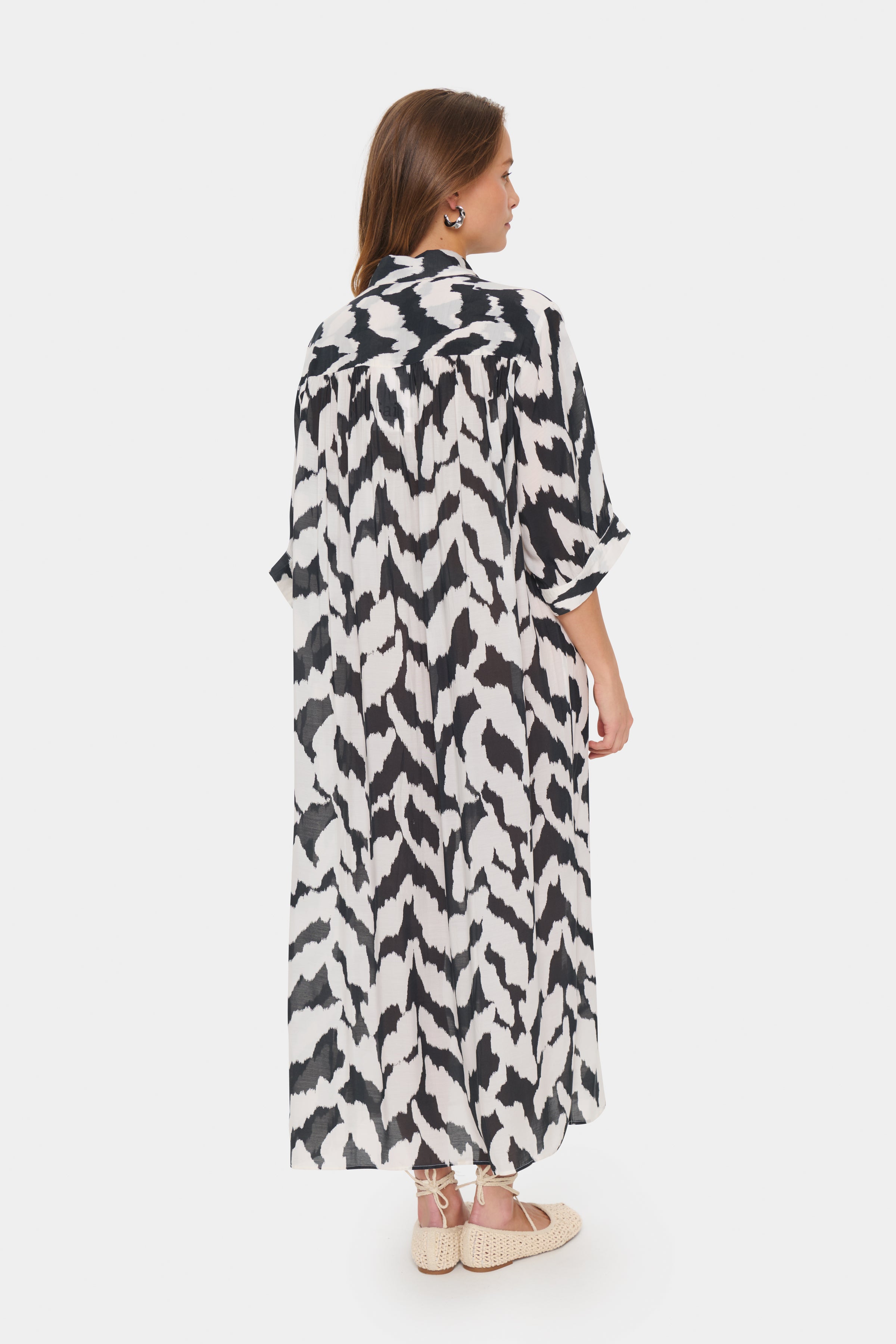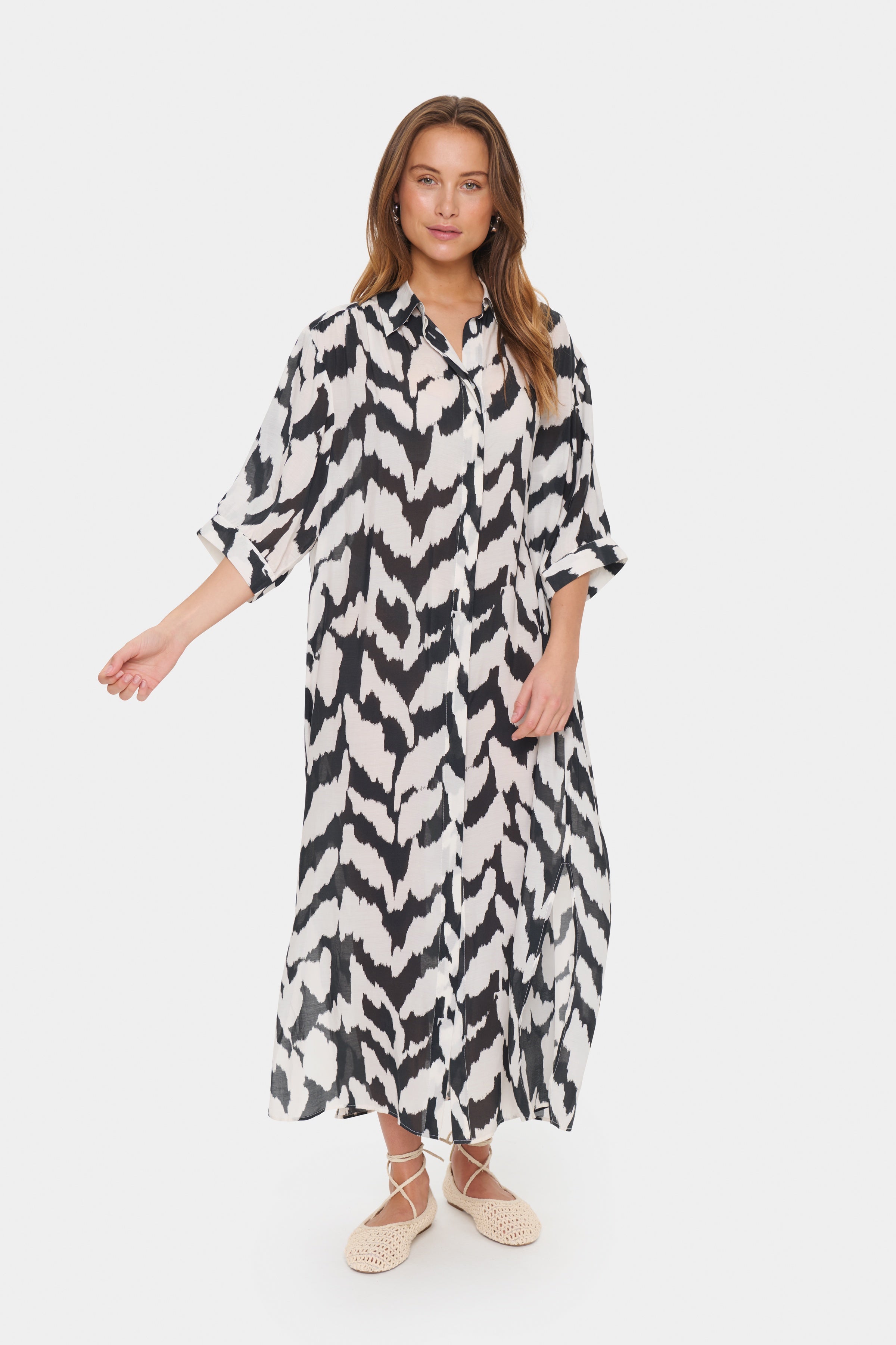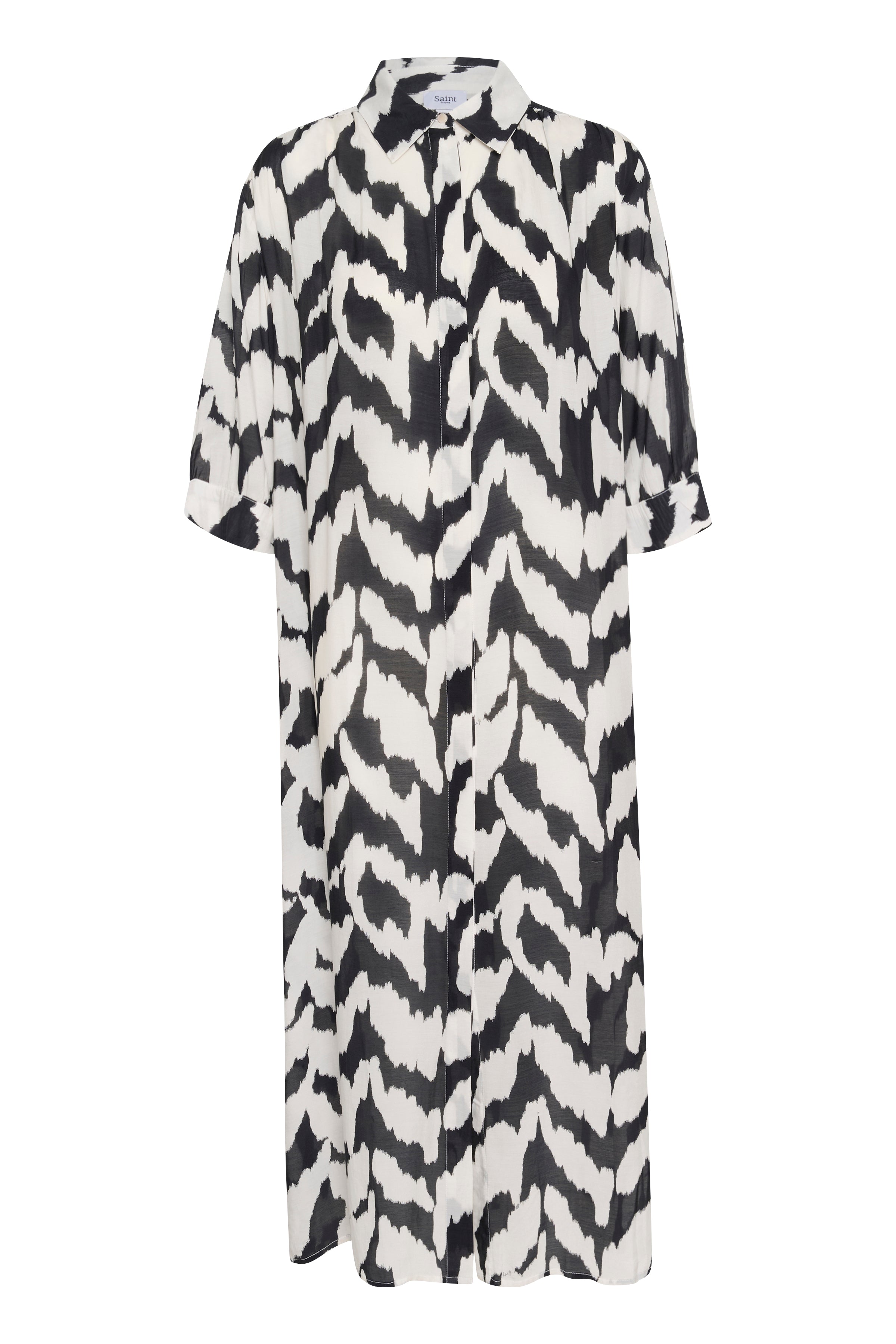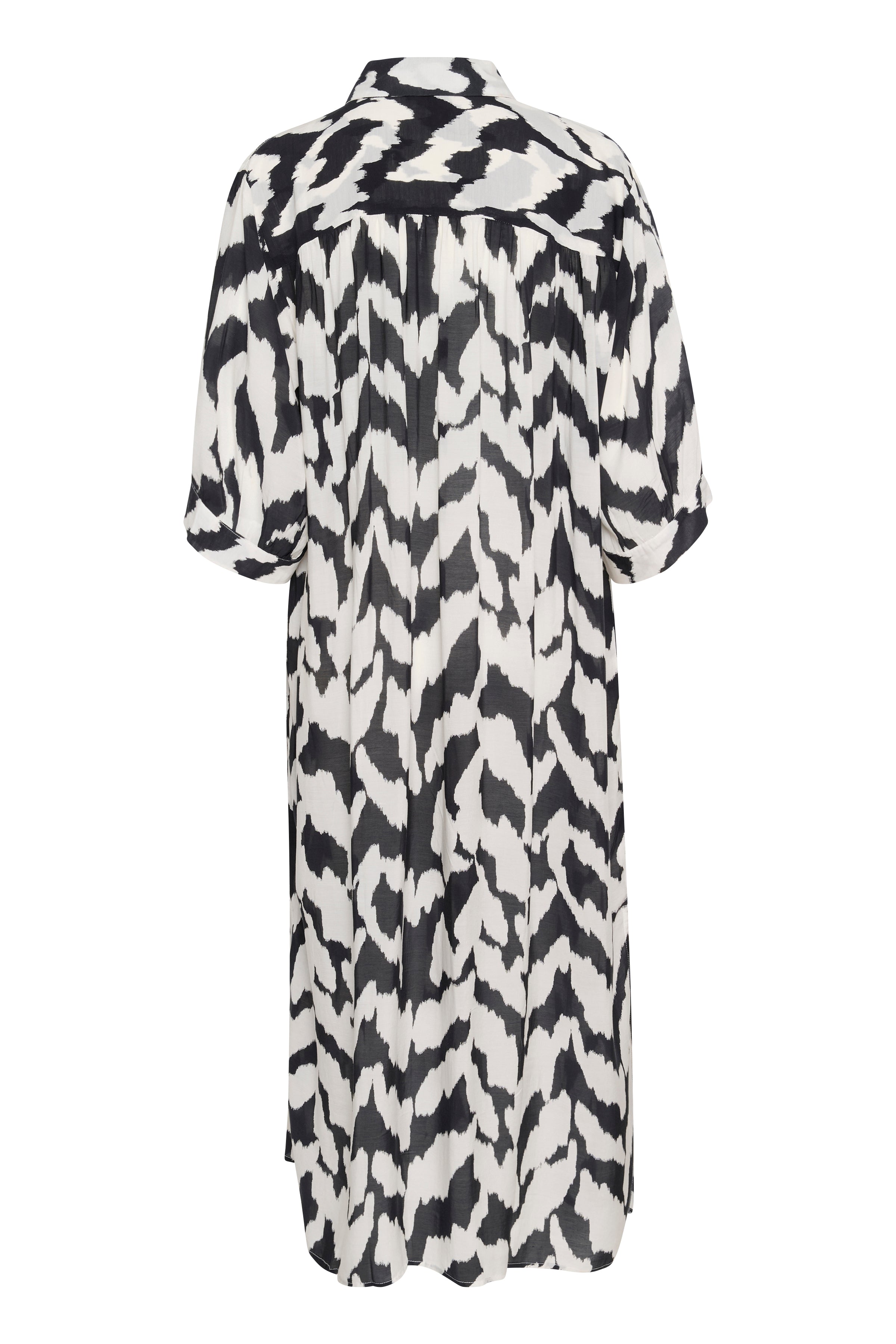 Loose-fitting midi shirt dress in a black and off-white abstract print. Designed with a classic collar, short sleeves, and full button-down front. Made from a soft woven fabric with a straight silhouette.