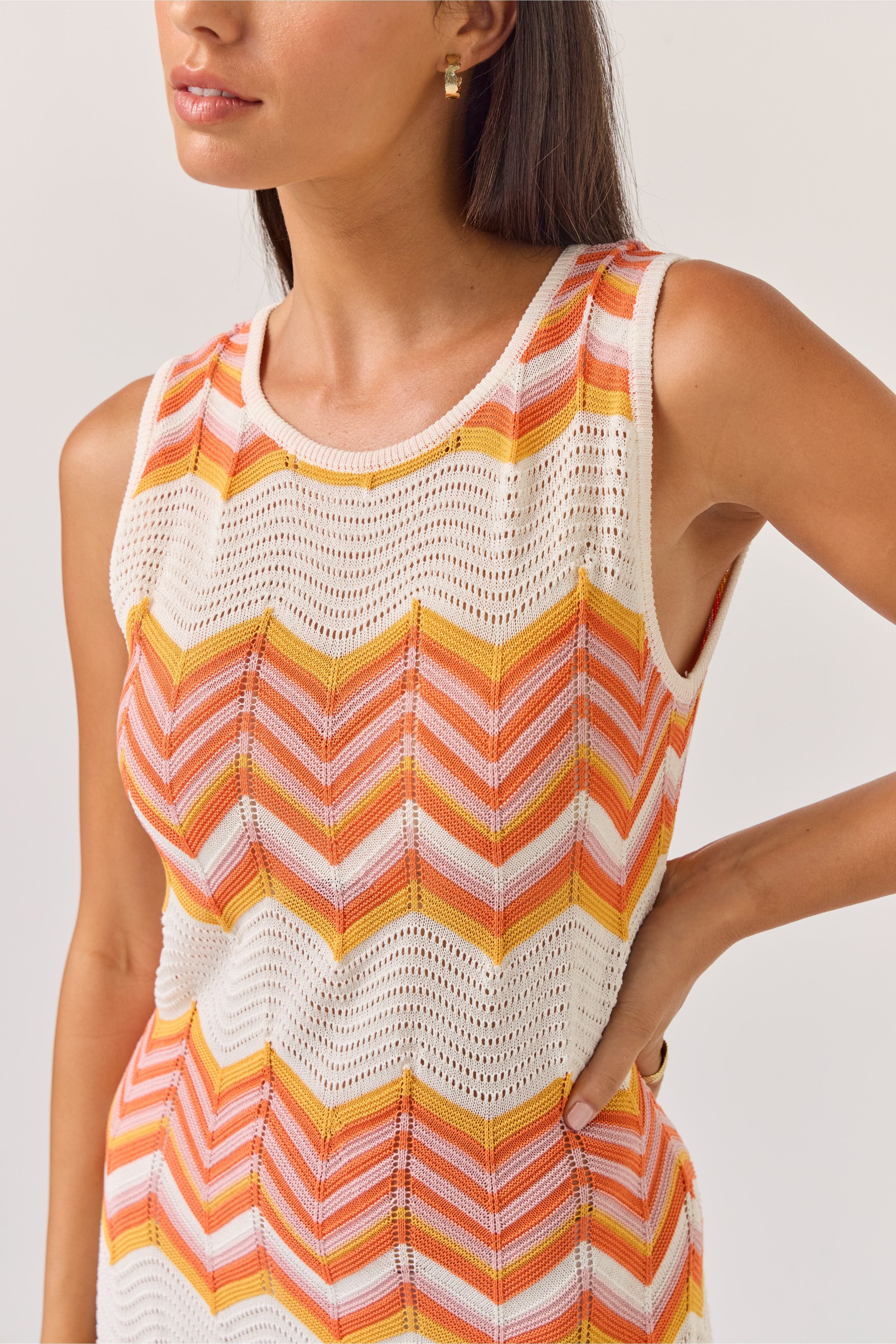 Wow wow wow. A knitted chevron tube dress, this striking shape skims the body, falling slimly to the ankle. Bringing all the nostalgia for summers gone by but in a brand-new modern shape, this beauty is perfect for holidays, BBQs, beach days, and poolside.
