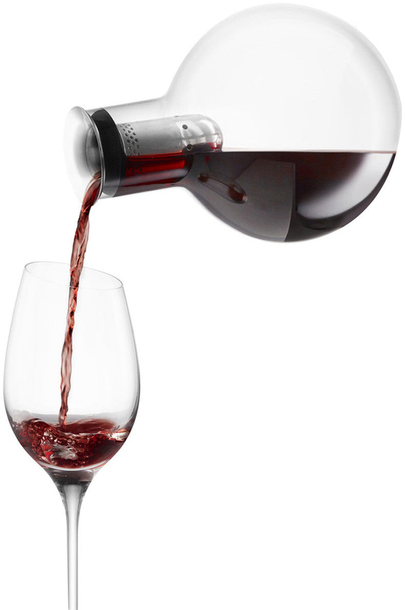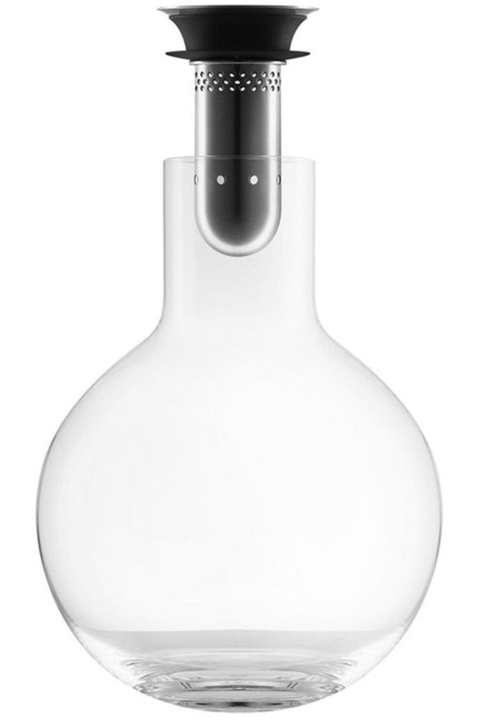 When wine is poured into the carafe, it first runs through small holes in the integrated funnel, then down the inside walls of the glass.
