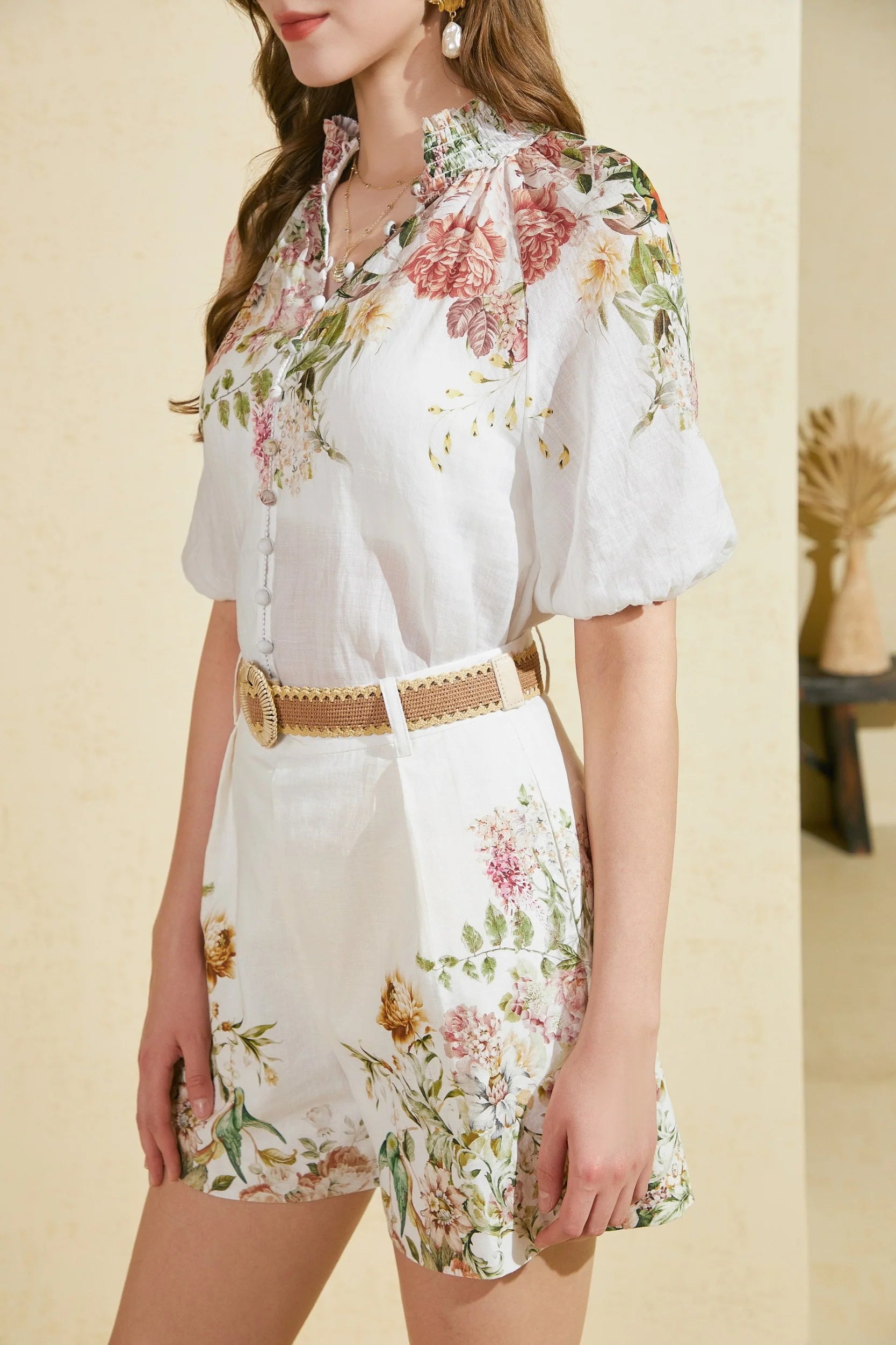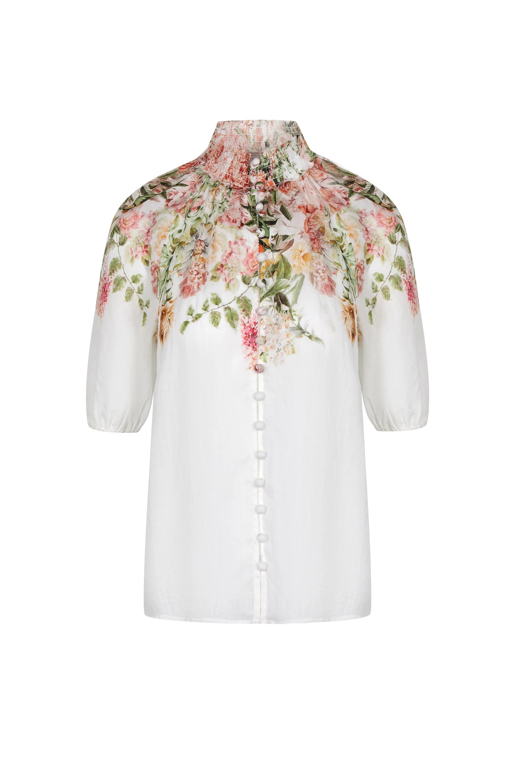 Nathan blouse features a beautifully crafted women's blouse, made from a blend of Tencel and linen — two breathable, lightweight, and eco-friendly fabrics that drape softly while offering a crisp, natural feel. The blouse is predominantly white, serving as a fresh and clean canvas for a delicate floral print. The floral motif, rendered in soft, watercolour-like shades of blush pink, peach, lavender, cream, and green, blooms across the upper bodice and shoulders. This creates a romantic and airy aesthetic reminiscent of an English garden in full bloom.