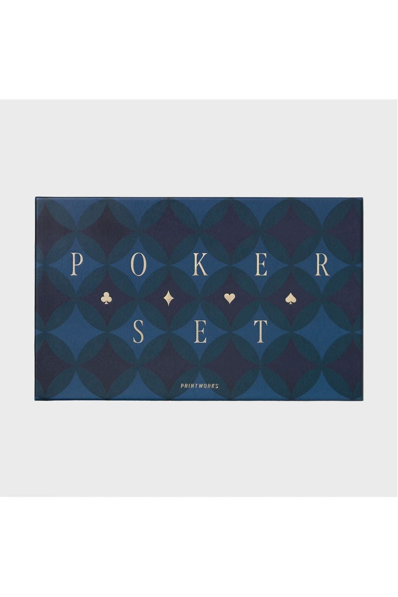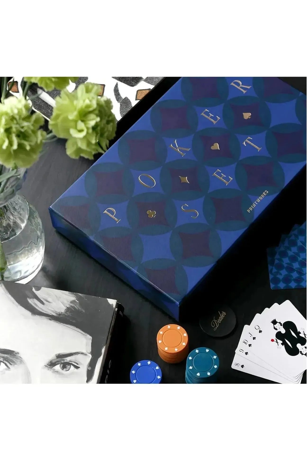 The Art of Poker set showcases a beautiful diamond pattern in vibrant deep blue and dark green, enhancing your game nights with a touch of sophistication.