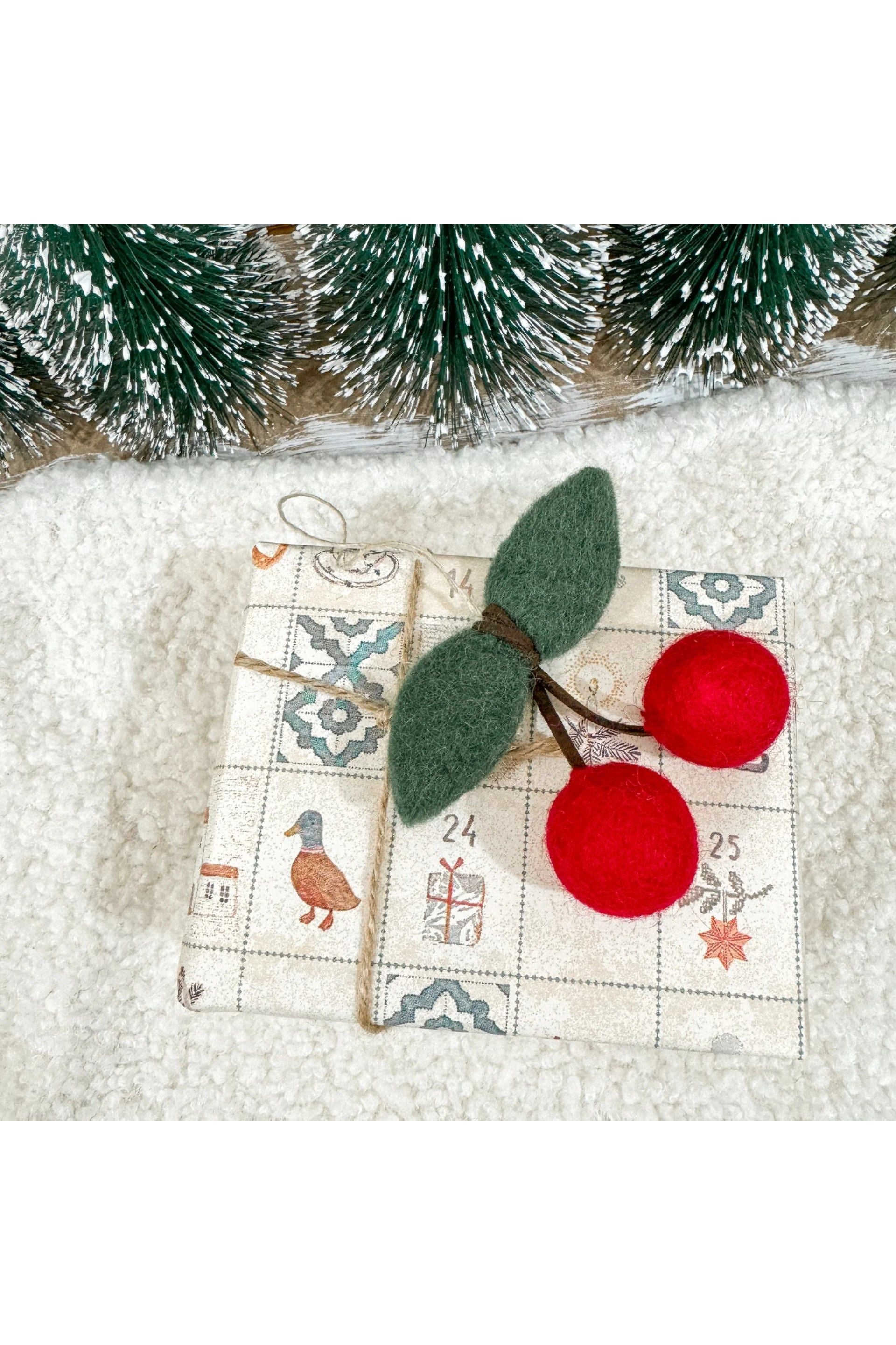 Featuring two plump red cherries on soft green felt stems, this eco-friendly ornament brings nostalgic Christmas warmth to your tree, garland or seasonal styling.
