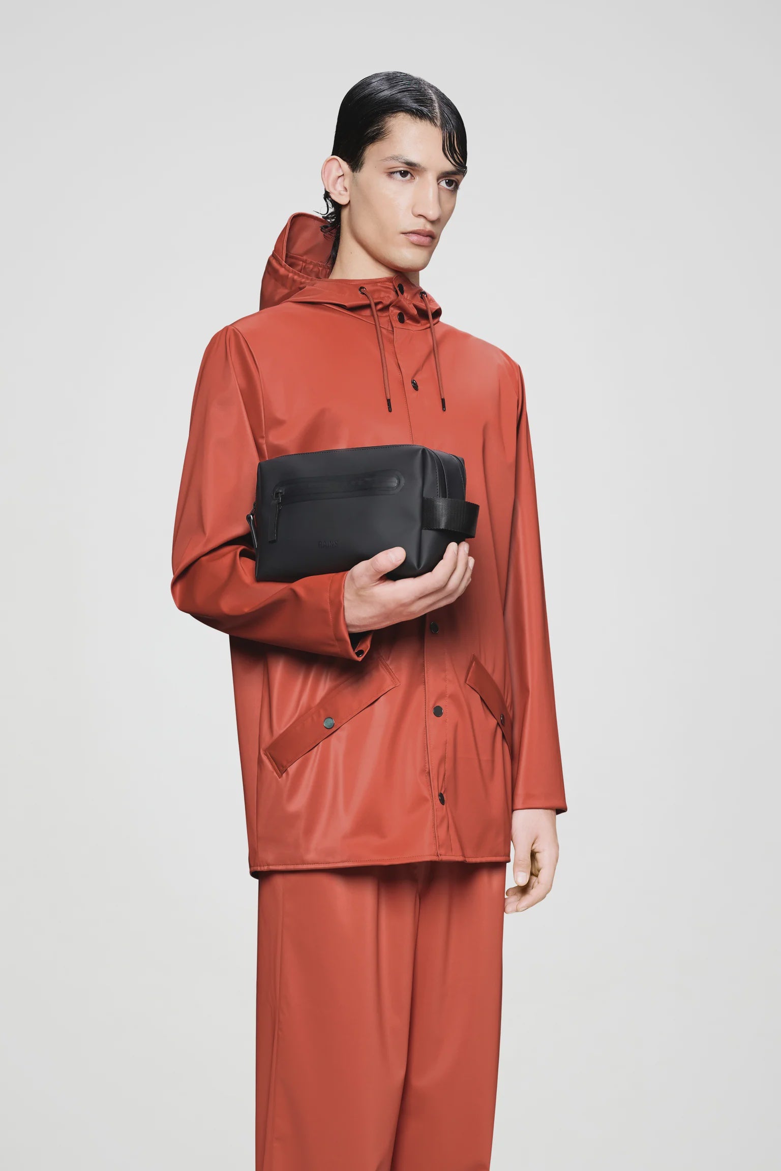The design is cut from Rains’ signature waterproof PU fabric—engineered for durability, a smooth feel, and reliable protection in wet conditions.