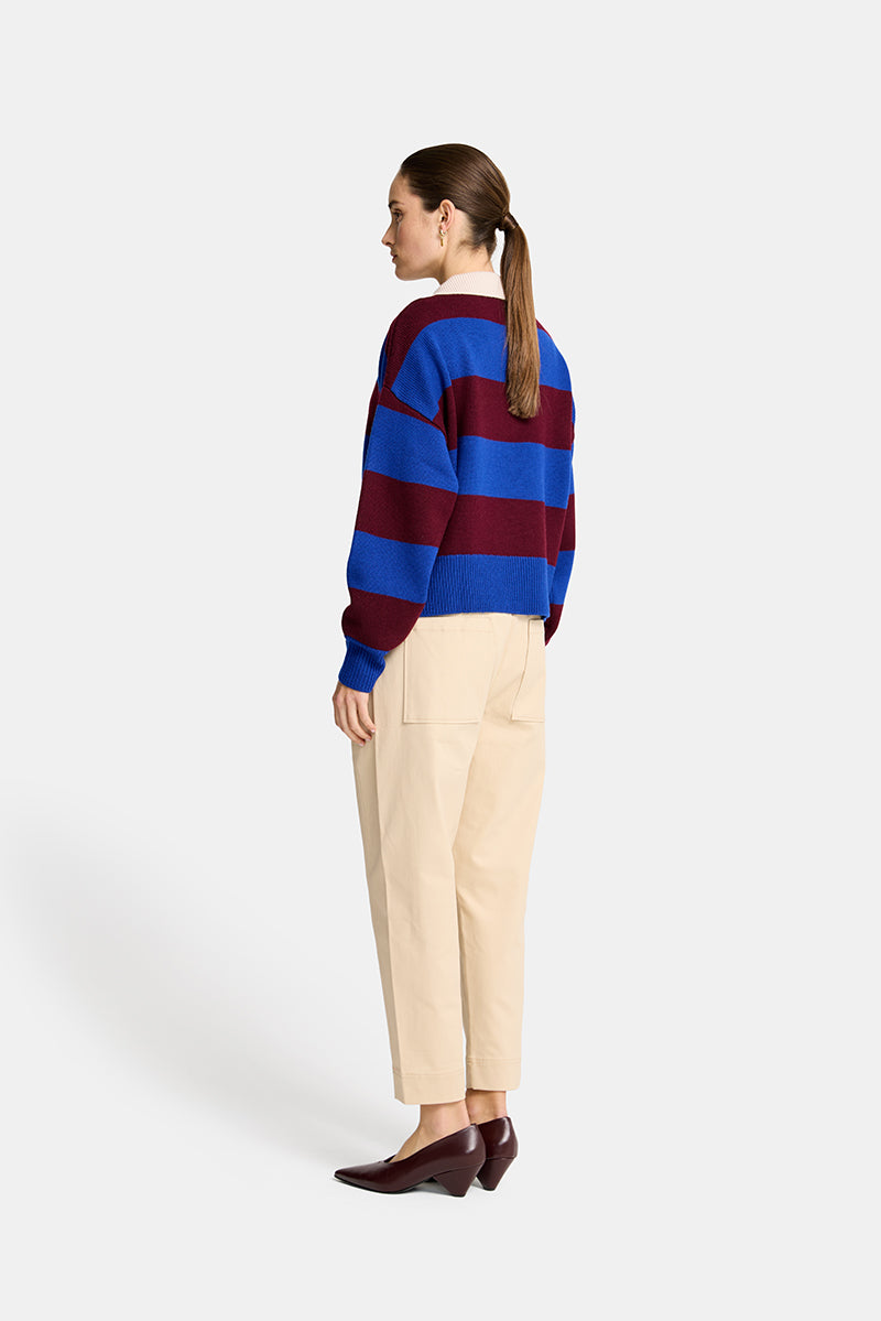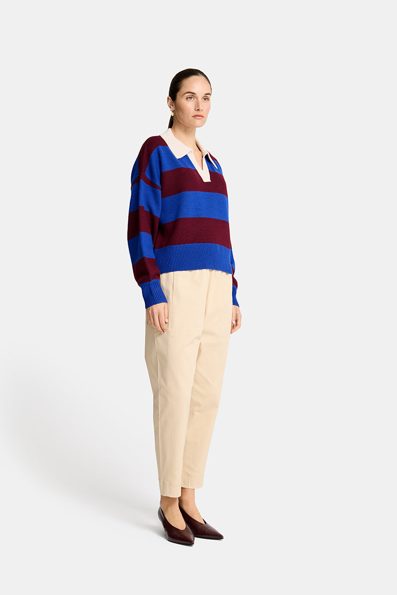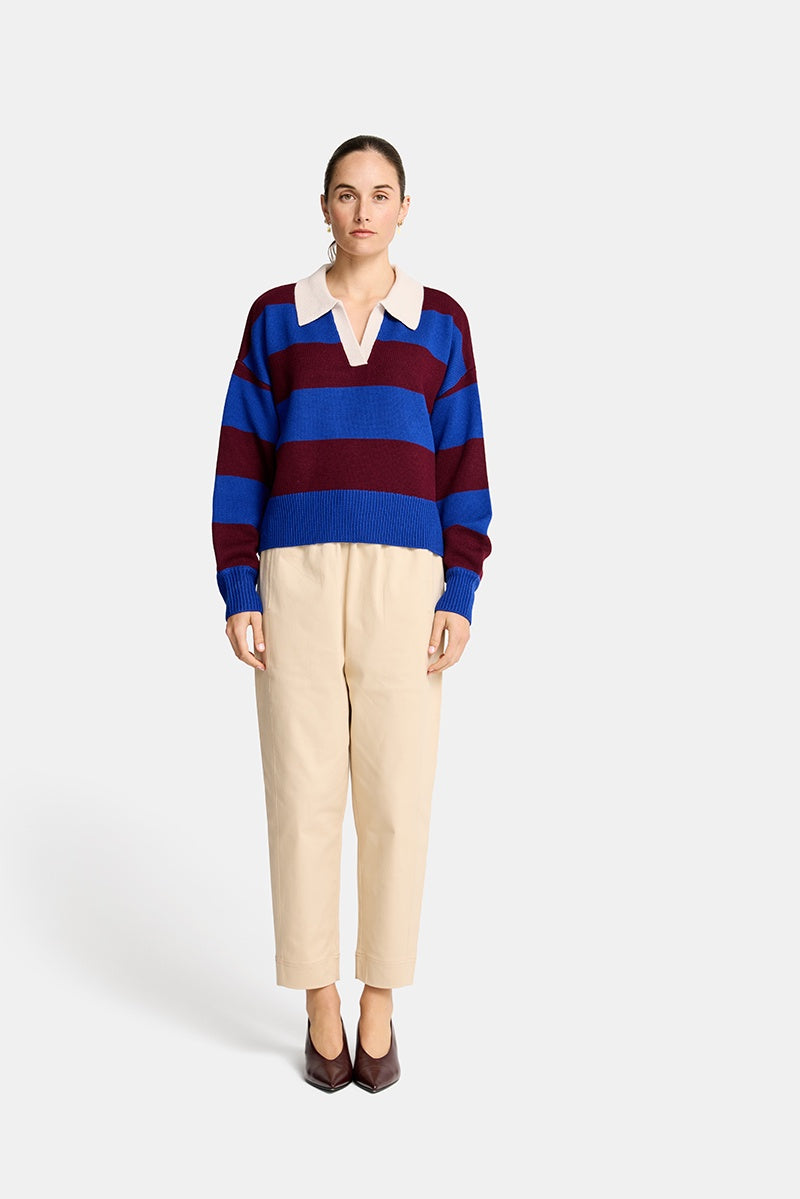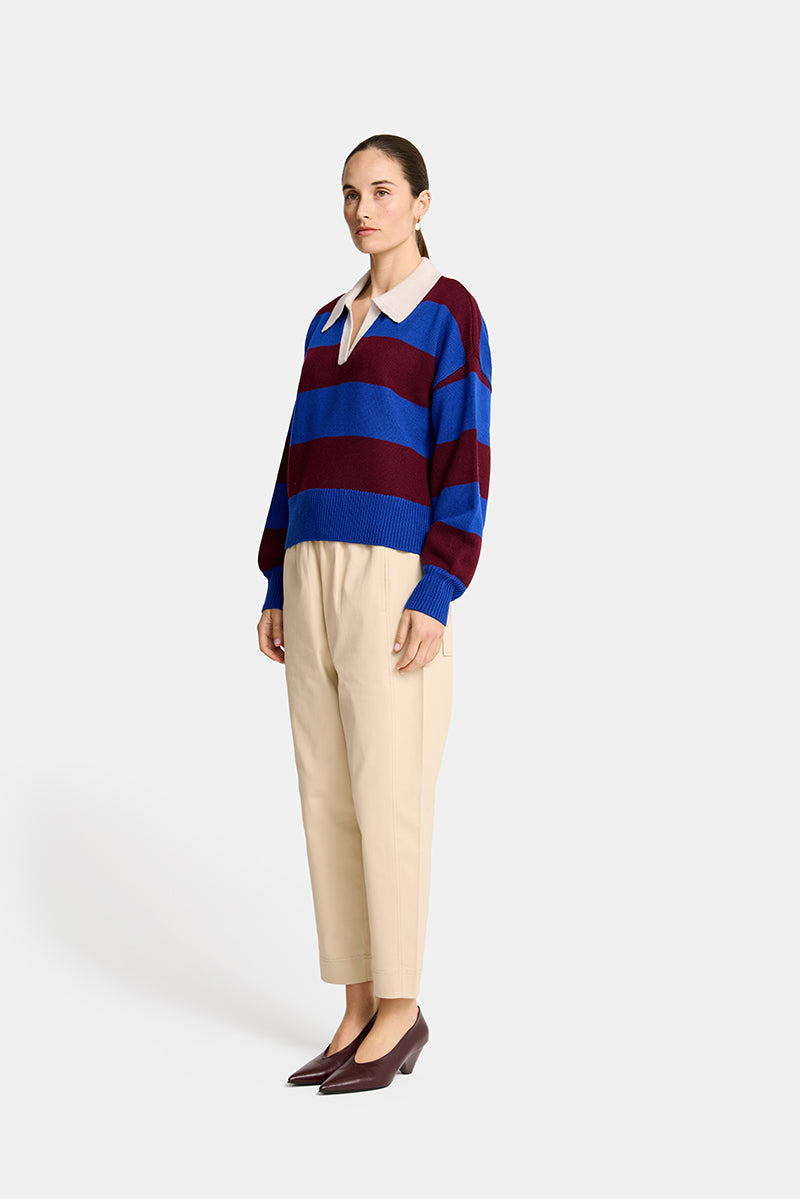 Designed with bold horizontal stripes, the sweater balances relaxed ease with confident detail. A contrasting collar and open neckline introduce a subtle, sport-inspired influence, while ribbed trims at the cuffs and hem provide gentle structure and shape. The relaxed fit allows for effortless layering, creating a look that feels both contemporary and timeless.