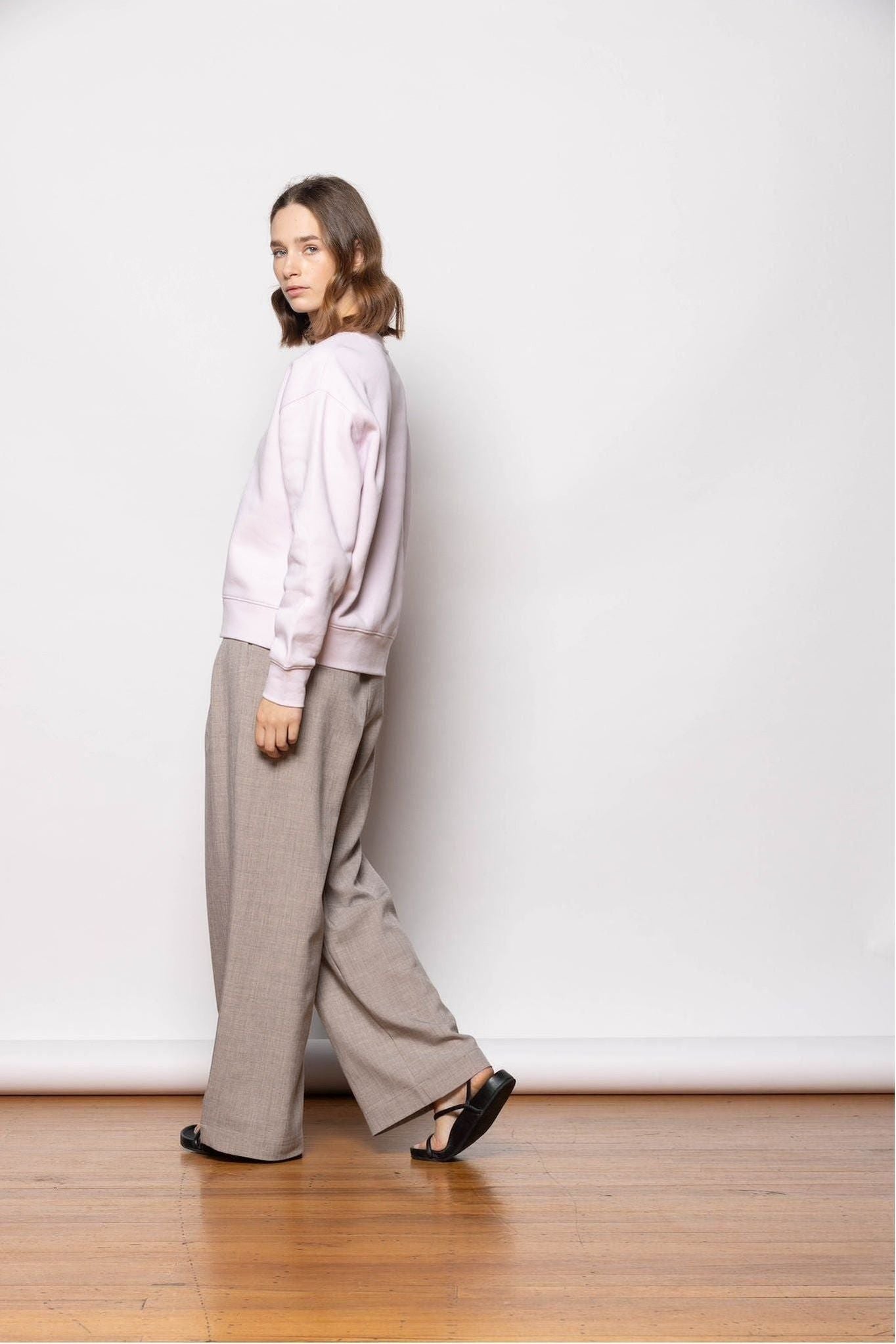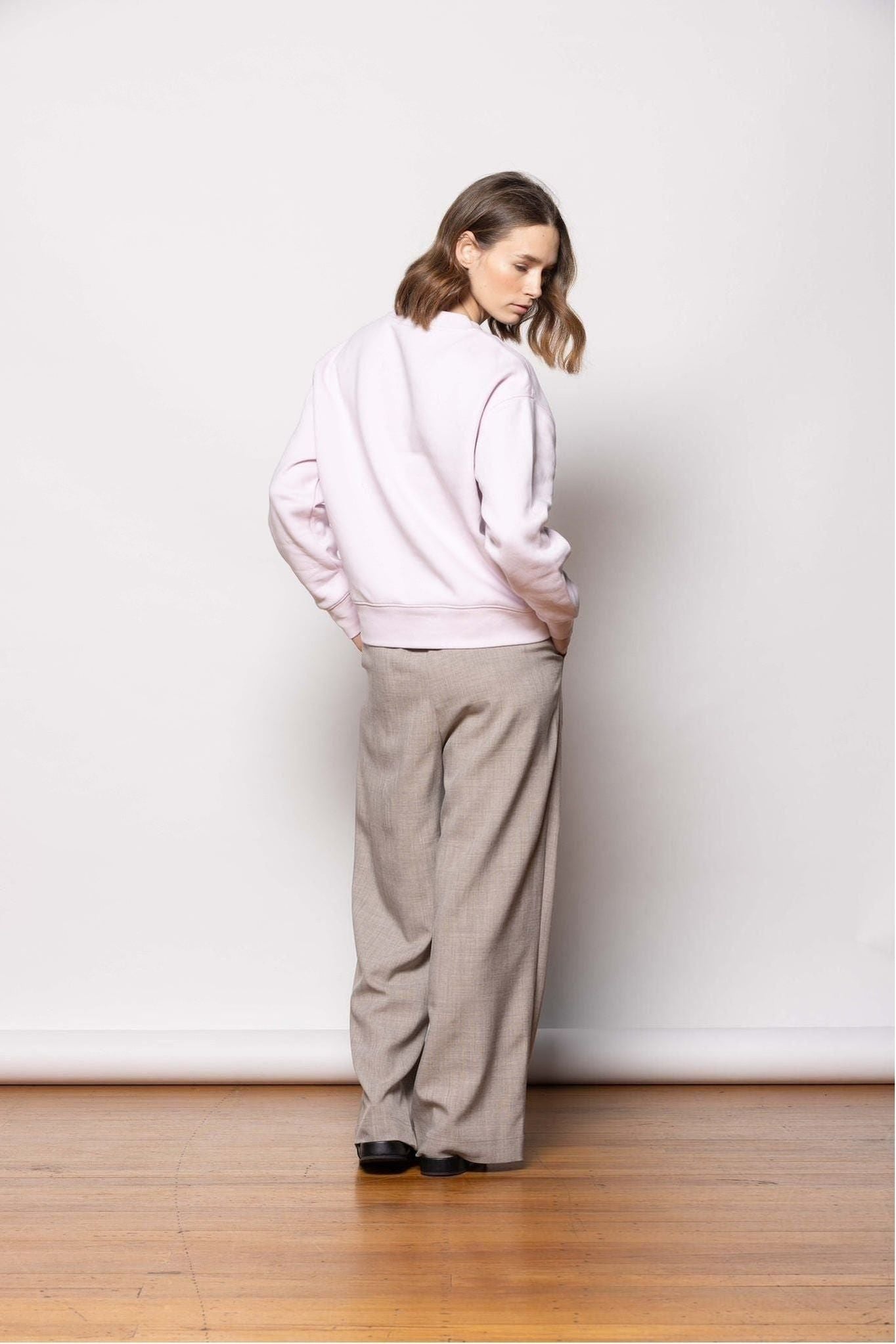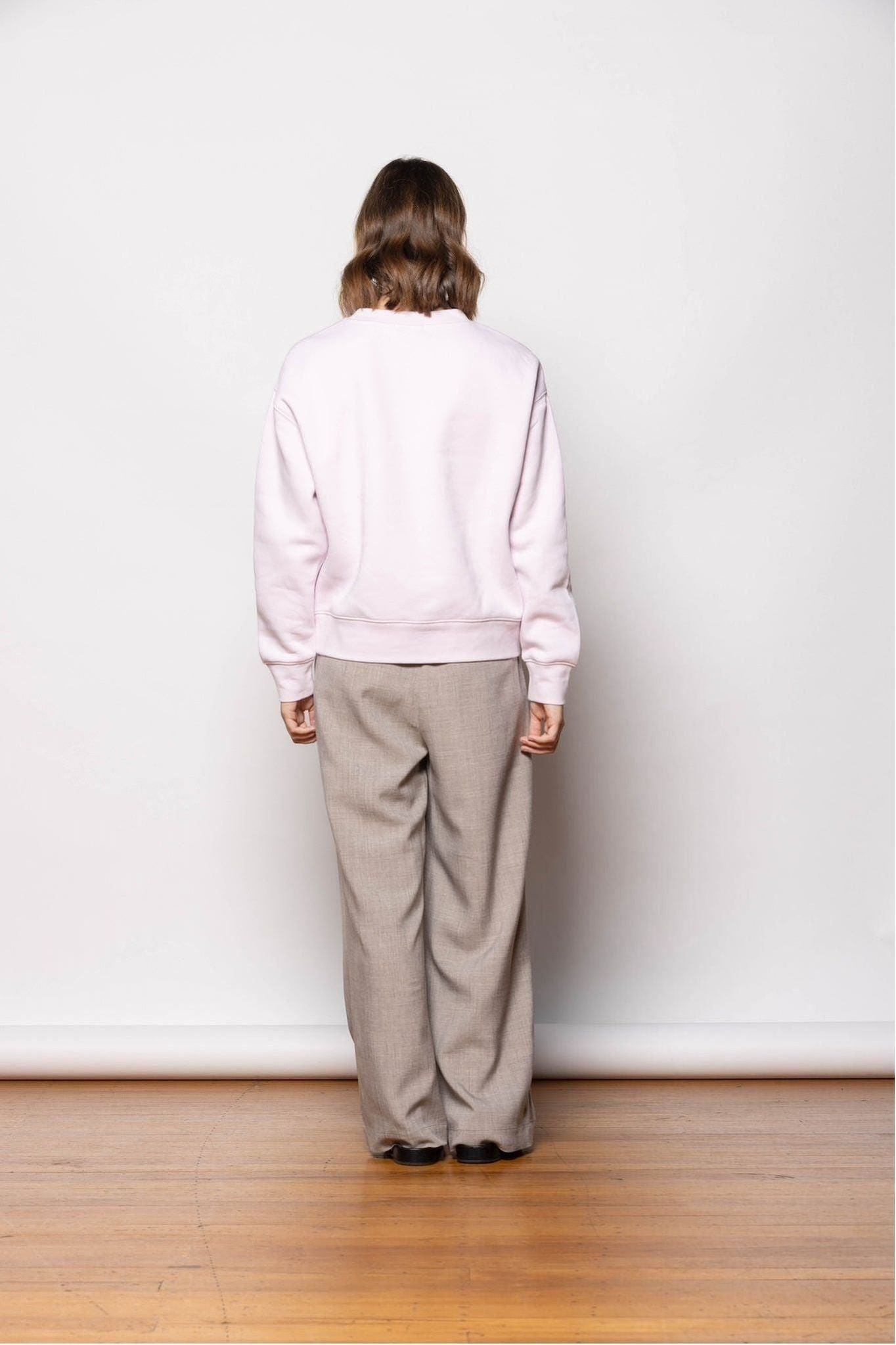 The Nice Day Sweatshirt in lilac features a large white print complemented by subtle front text, offering a stylish yet understated look. Designed with a round neck and long cuffed sleeves and hem, it provides a comfortable, relaxed fit at a medium length, making it an ideal layering piece for everyday wear.