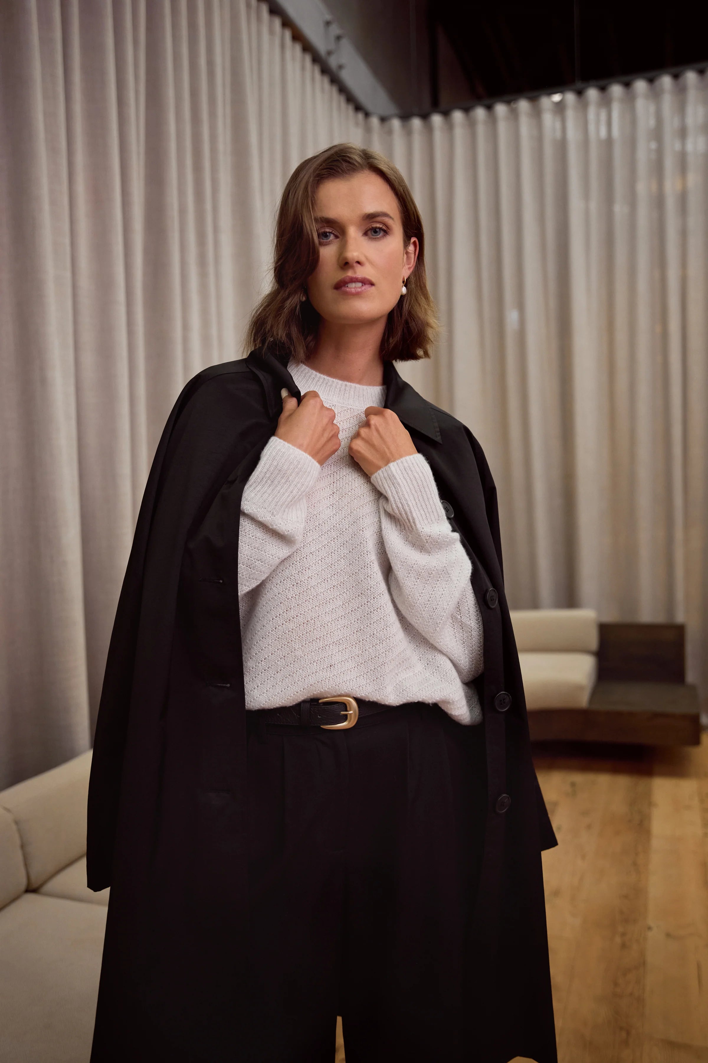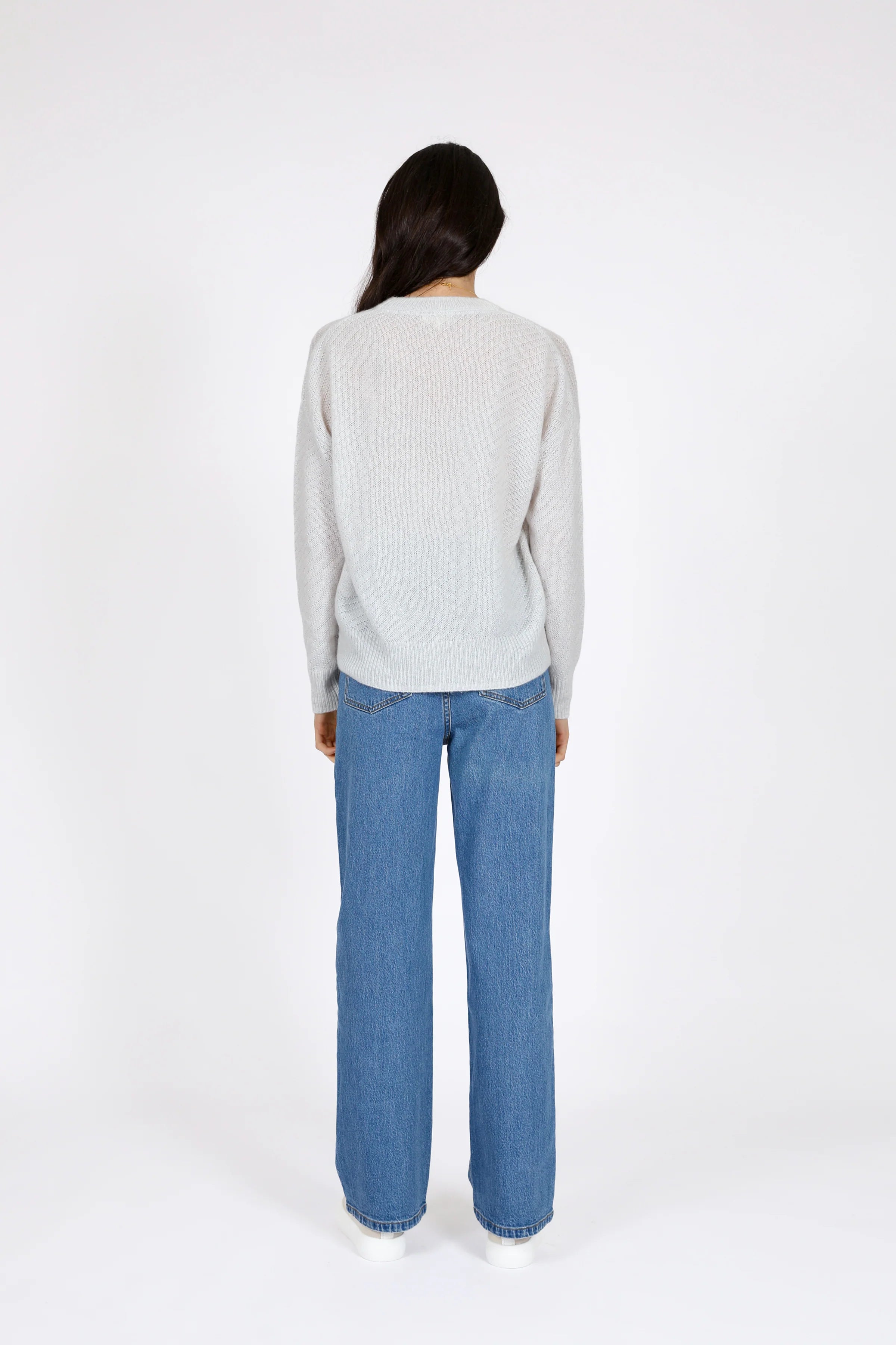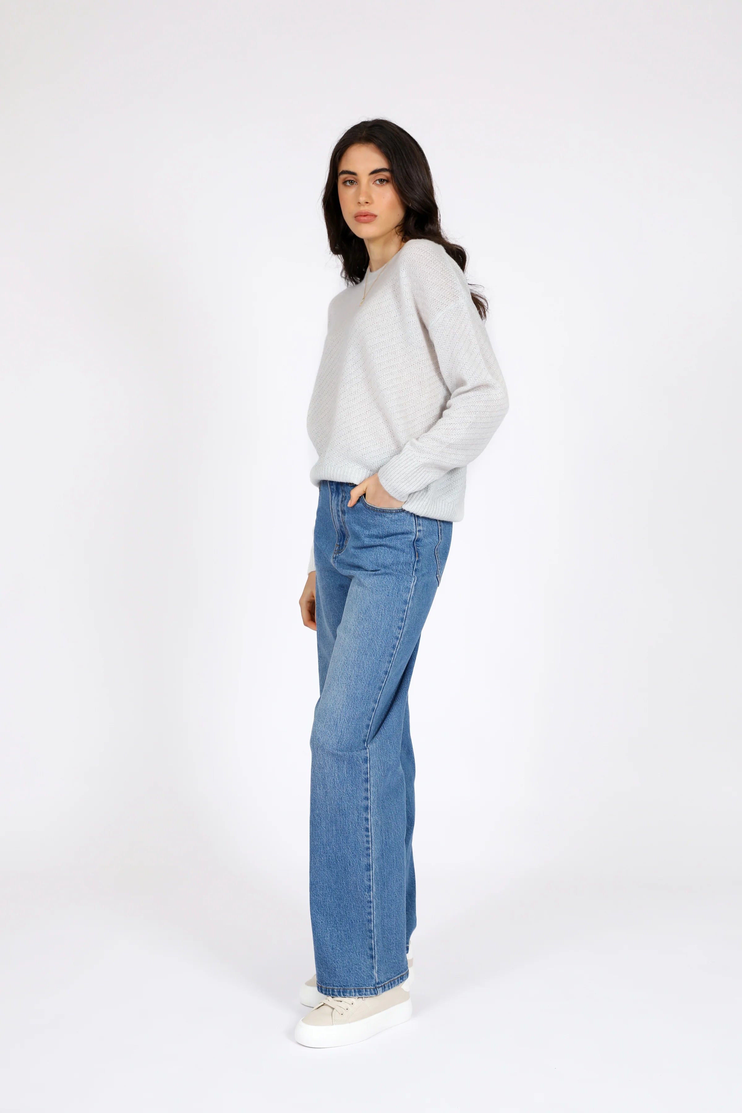 Elevate your everyday wardrobe with the Celeste Crew Knit in Ice. Crafted from a luxurious blend of wool, Tencel, and cashmere, this lightweight knit feels effortlessly cosy while maintaining a soft, slightly sheer texture. The diagonal stripe knit structure adds subtle interest, complemented by the wide ribbed crew neckline, cuffs, and hem. Wear it as a light layer on its own or layer up as the temperature drops for versatile, year-round style.