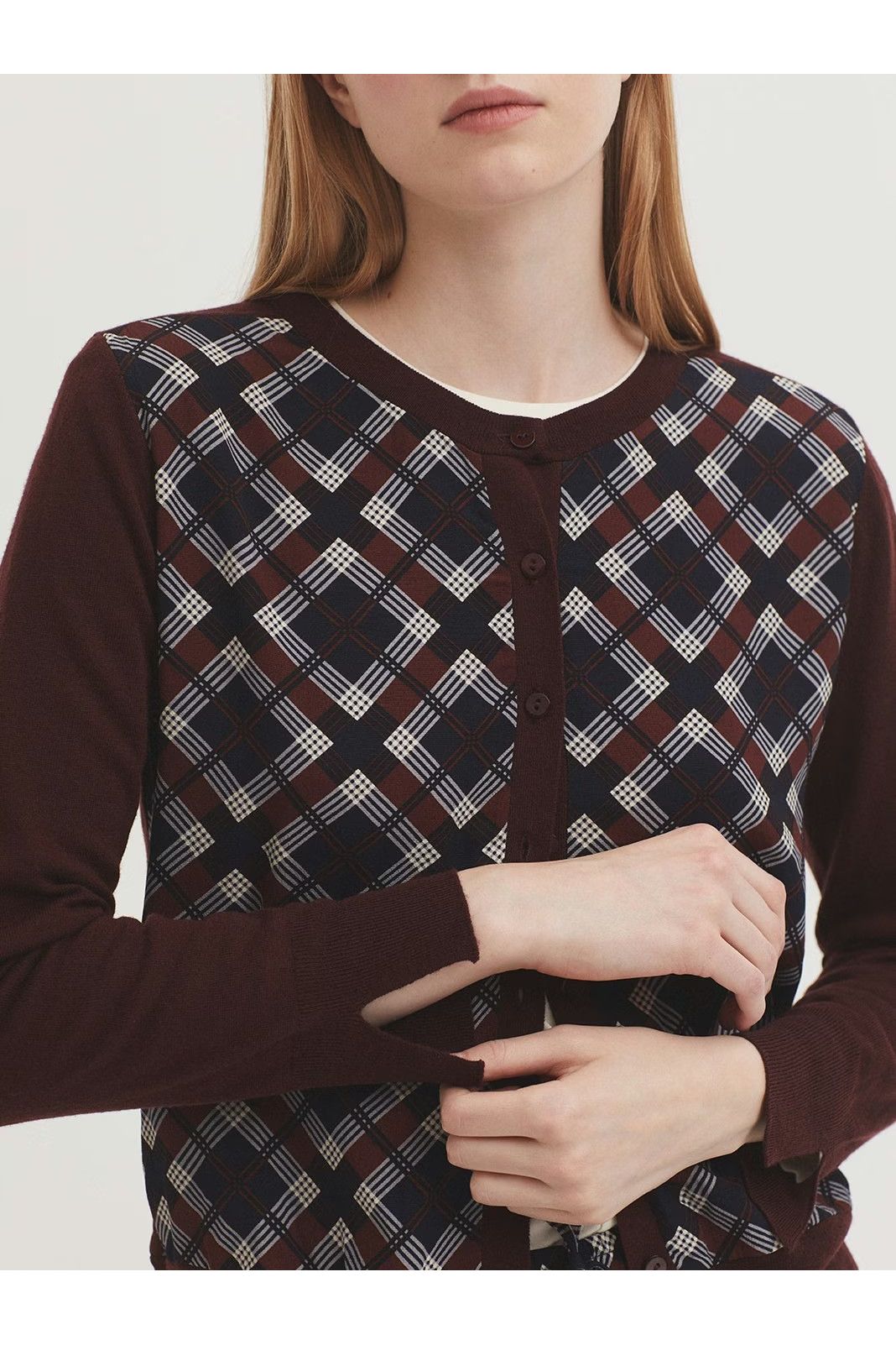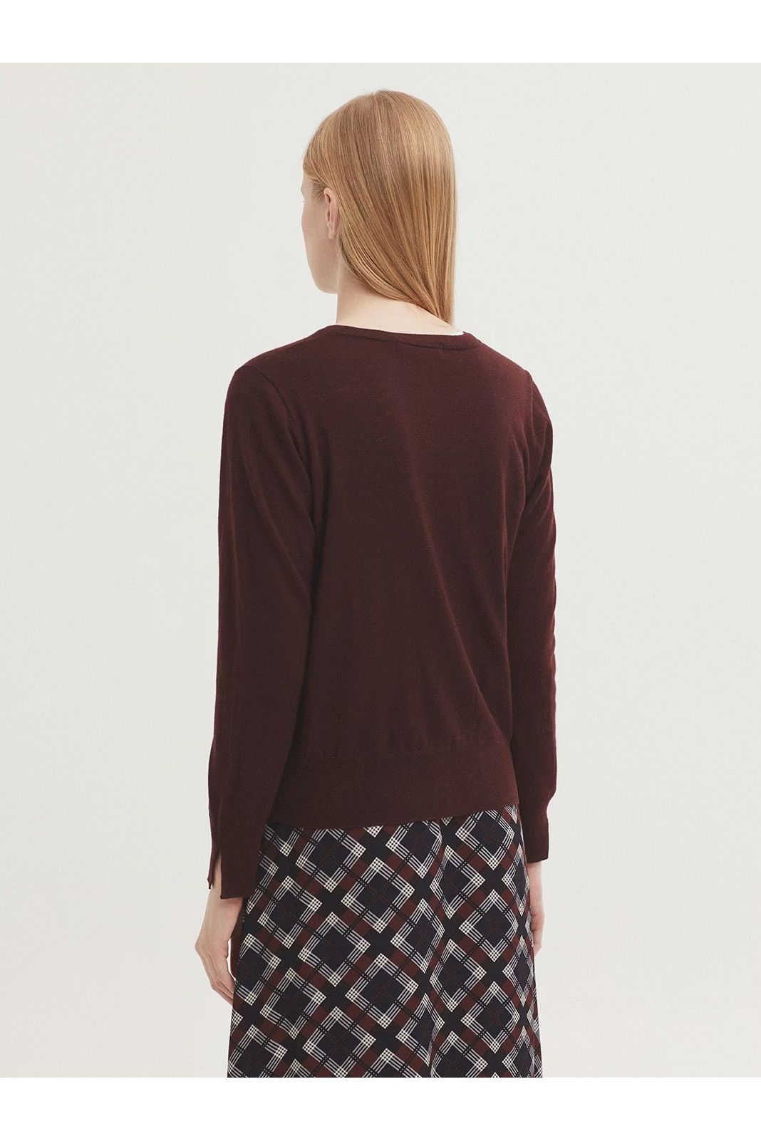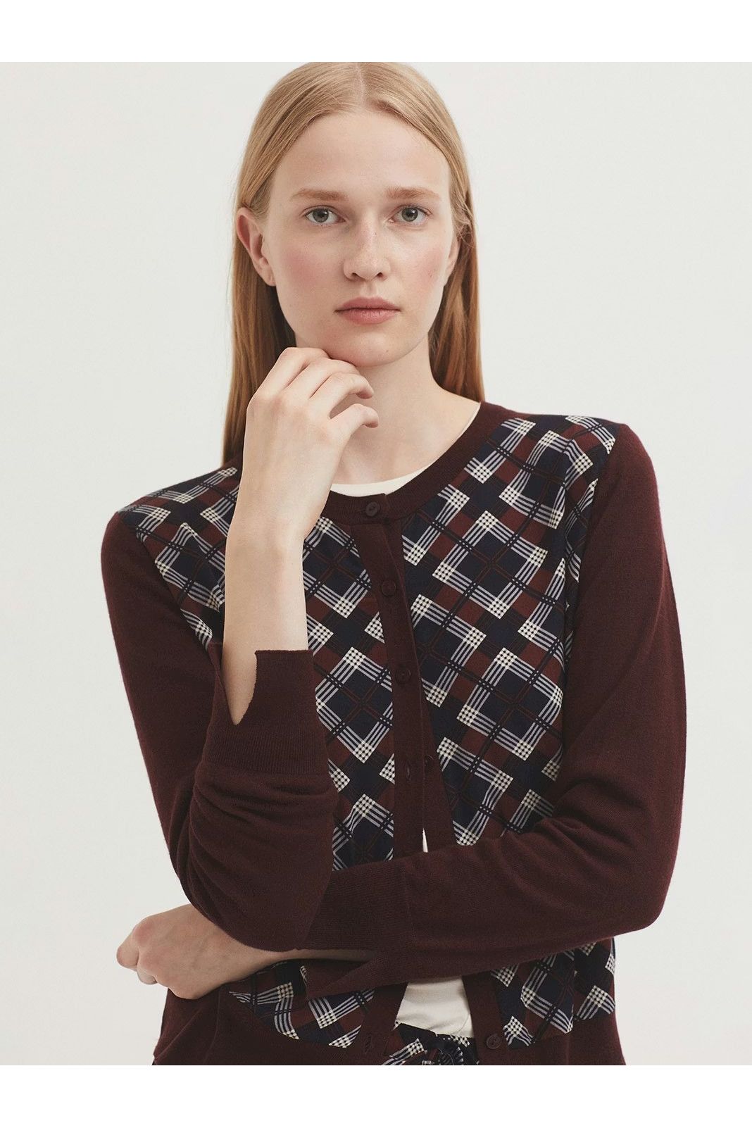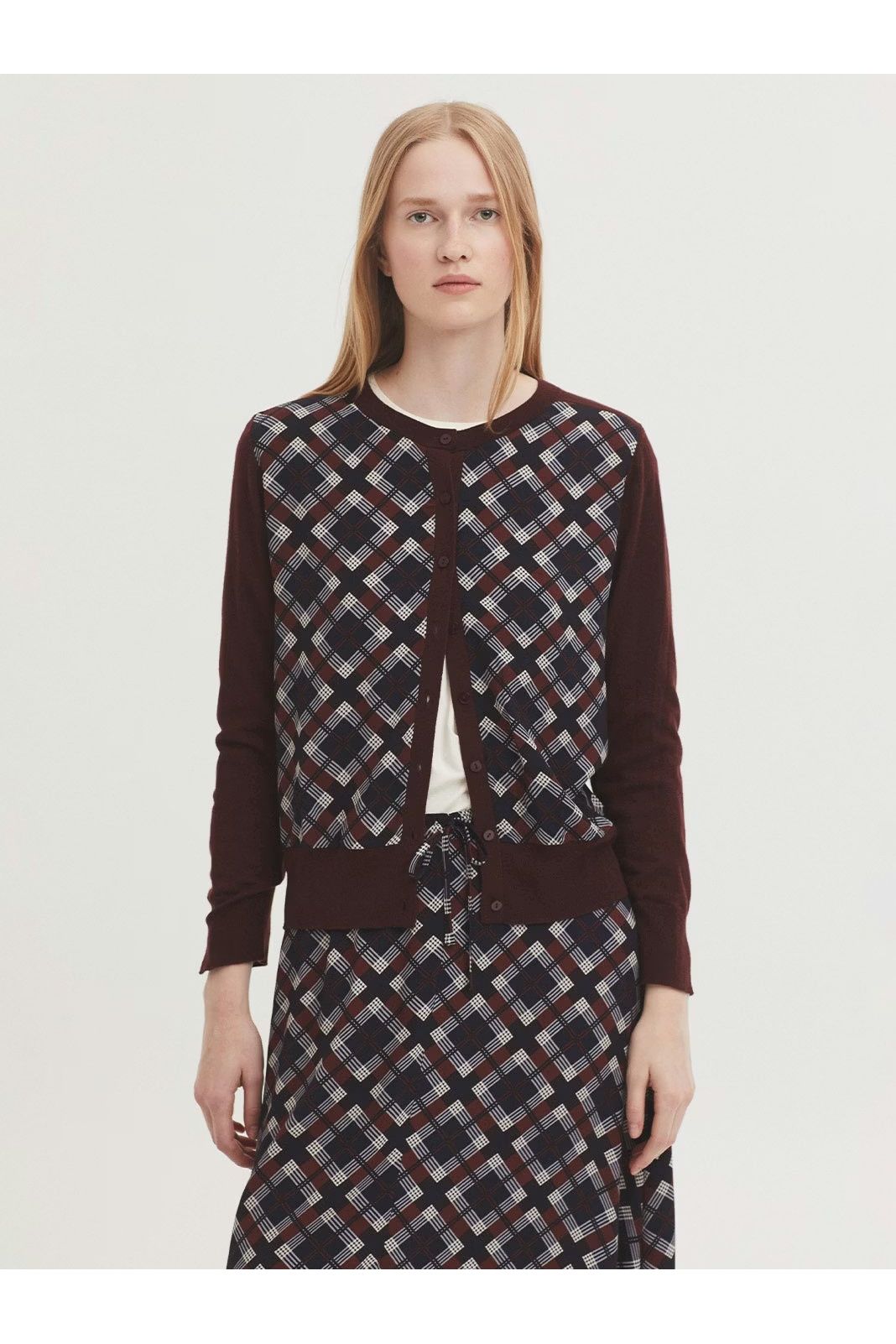 Checked cardigan in merino wool-cashmere blend. Round neck, centre button front, long sleeves and ribbed finish.