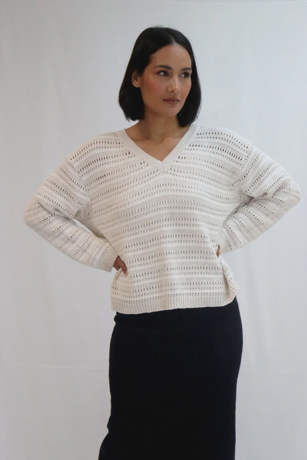 The Tatano Trellis Knit is a relaxed V-neck sweater designed in a warm rust hue with soft peony pink stripes. Crafted in an airy open-stitch knit, it offers a breathable, lightweight feel that’s perfect for layering across seasons. The easy, slouchy fit and long sleeves bring comfort and ease, while the textured stripe pattern adds a subtle point of difference to your everyday wardrobe. Pair it with denim for casual days, or style it with skirts and tailoring to dress it up.