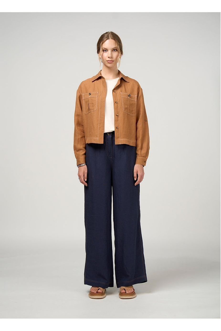 Cropped Jacket in a linen blend, with front pockets, featuring contrast twin needle detailing, and adjustable sleeves with a hidden tab.