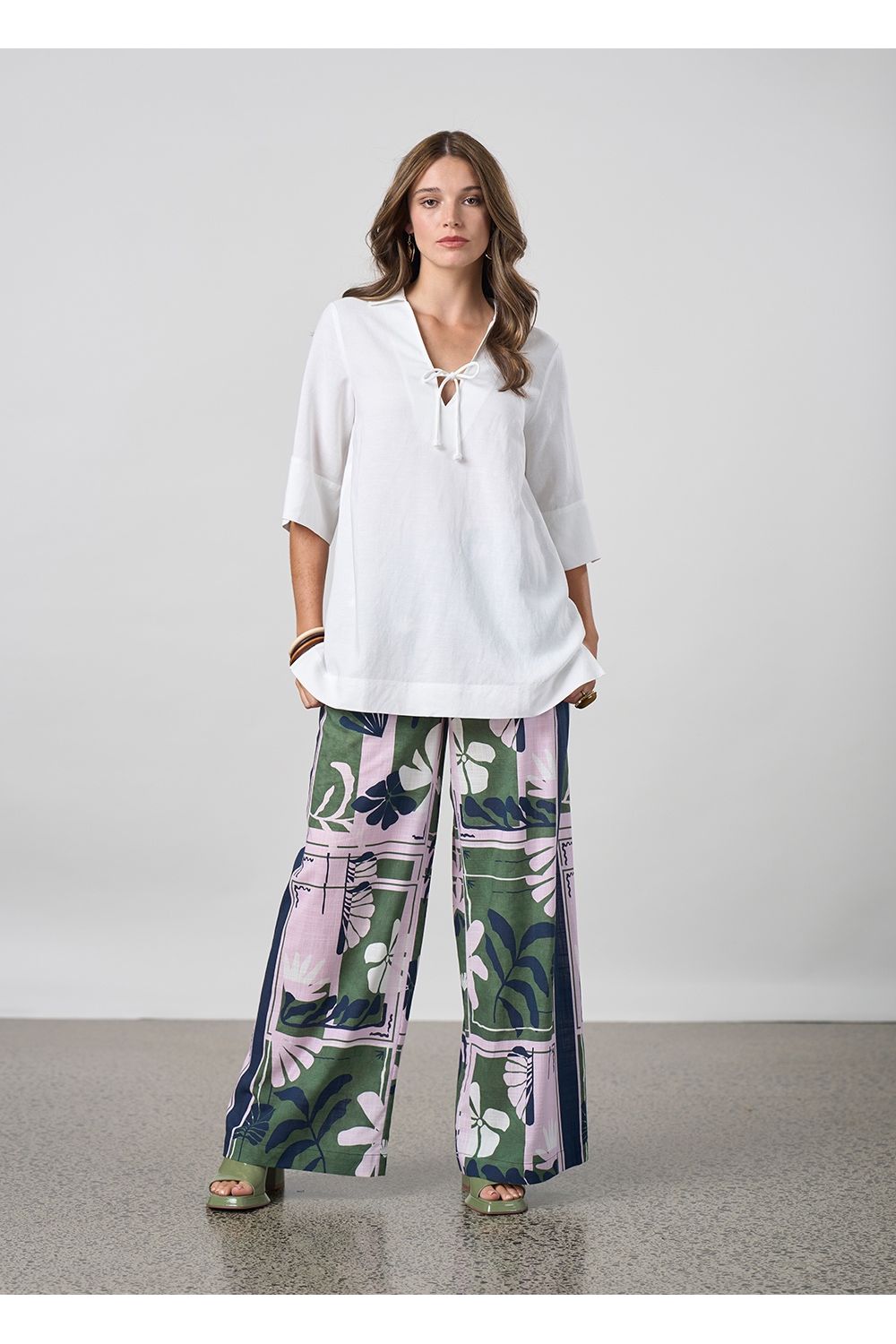 Printed, wide leg pant with a flat front and a waist tie through channel for a perfect fit. Featuring contrast side panel detailing. Functional pockets.