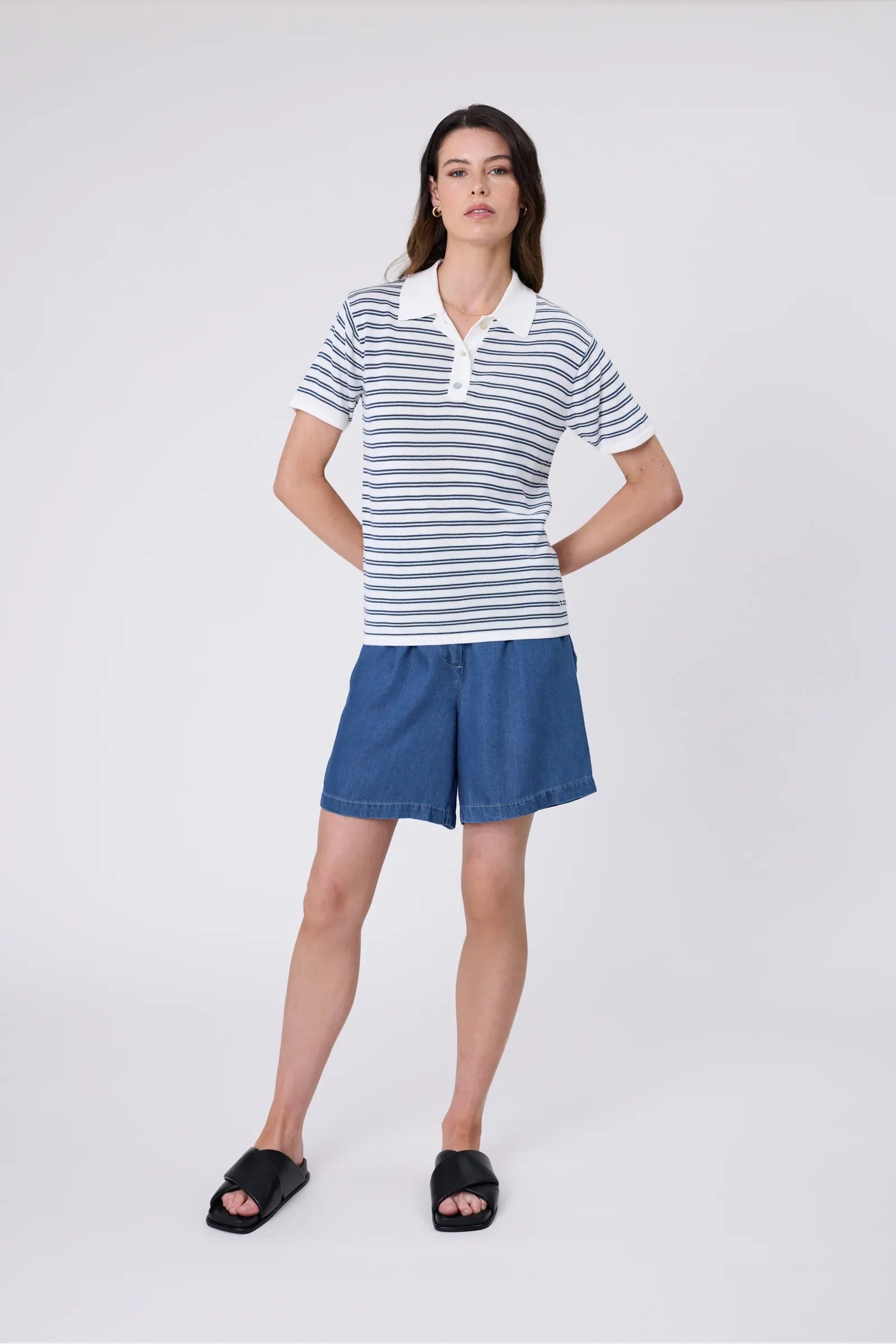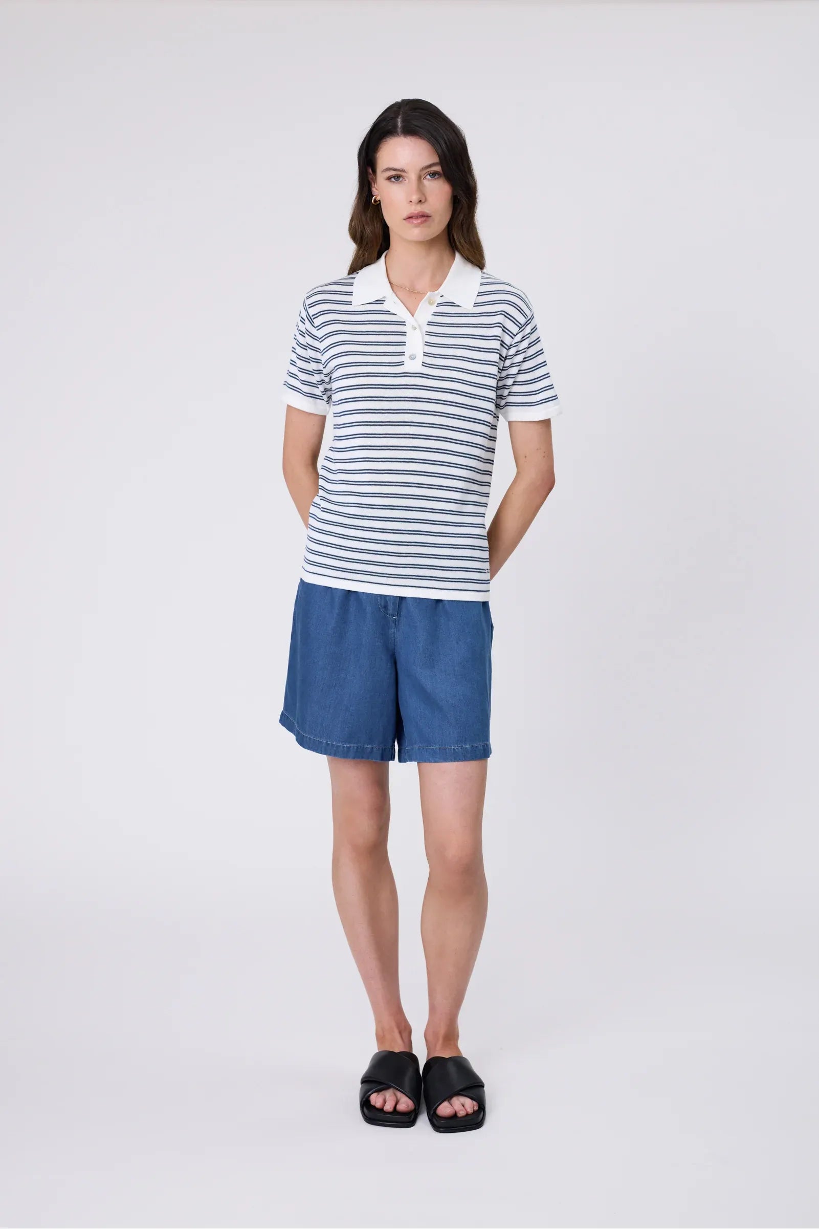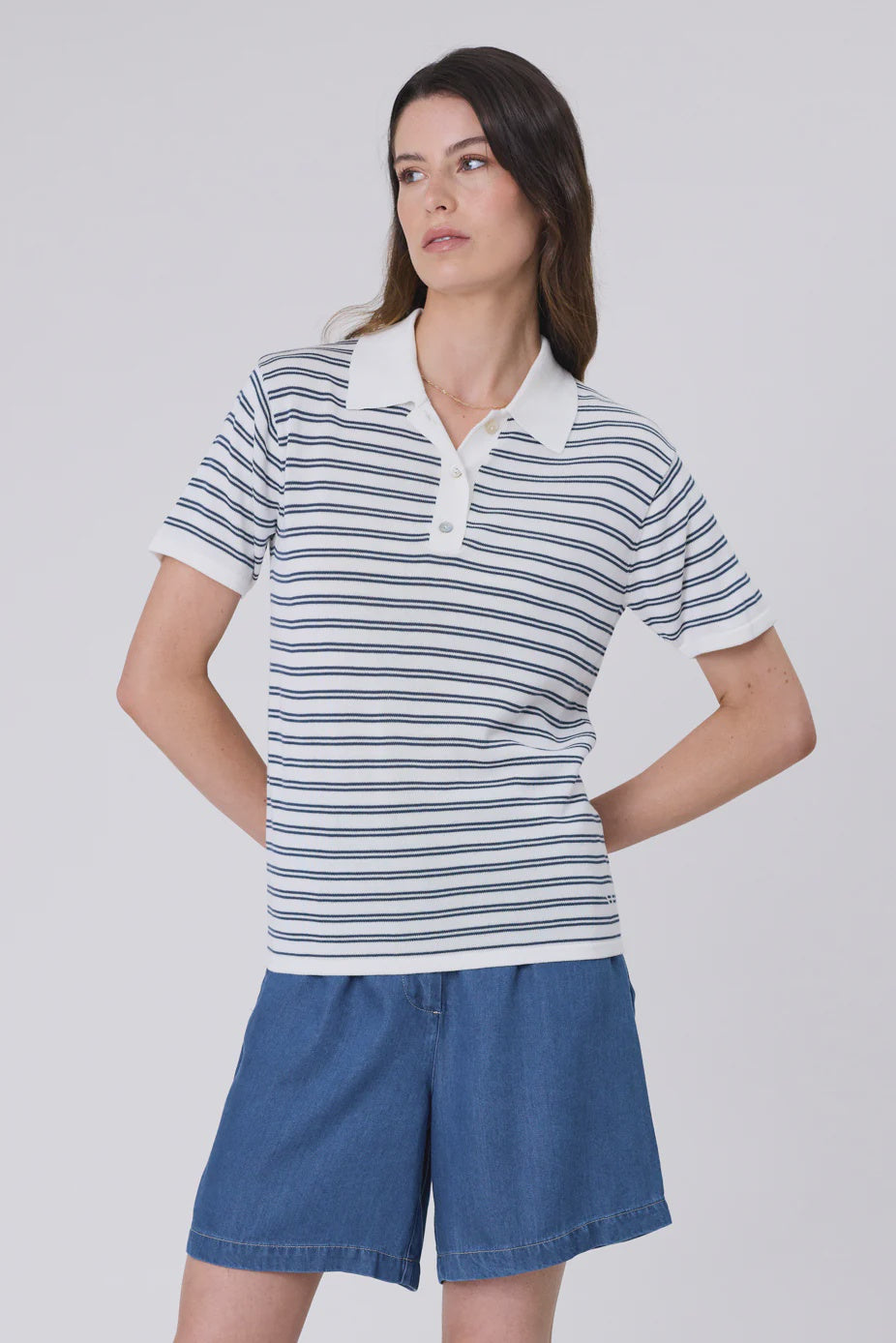 The Chime Knit Polo in Indigo Stripe is a modern take on a timeless favourite, crafted in a custom stripe knit with an ivory base and indigo blue accents. Made from a premium cotton-modal blend, it combines the strength and breathability of cotton with the silky softness and drape of modal, resulting in a lightweight, durable yarn that feels luxuriously smooth against the skin. Designed with a relaxed fit, short sleeves, a neat quarter placket and shell buttons, it strikes the perfect balance between casual and refined. Wear with your favourite Marlow Denim for an elevated everyday look.