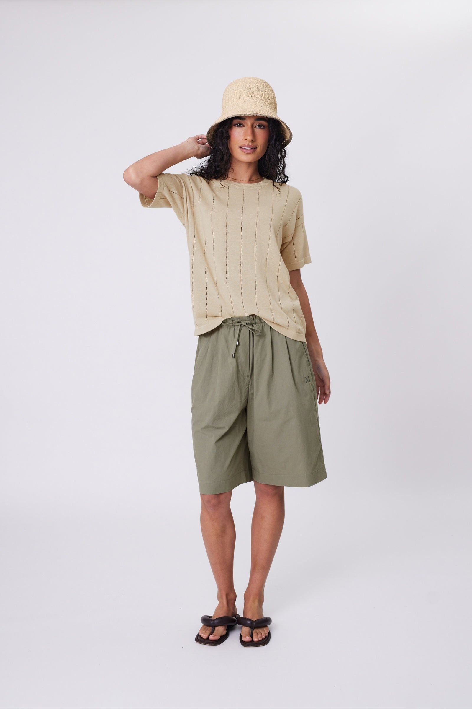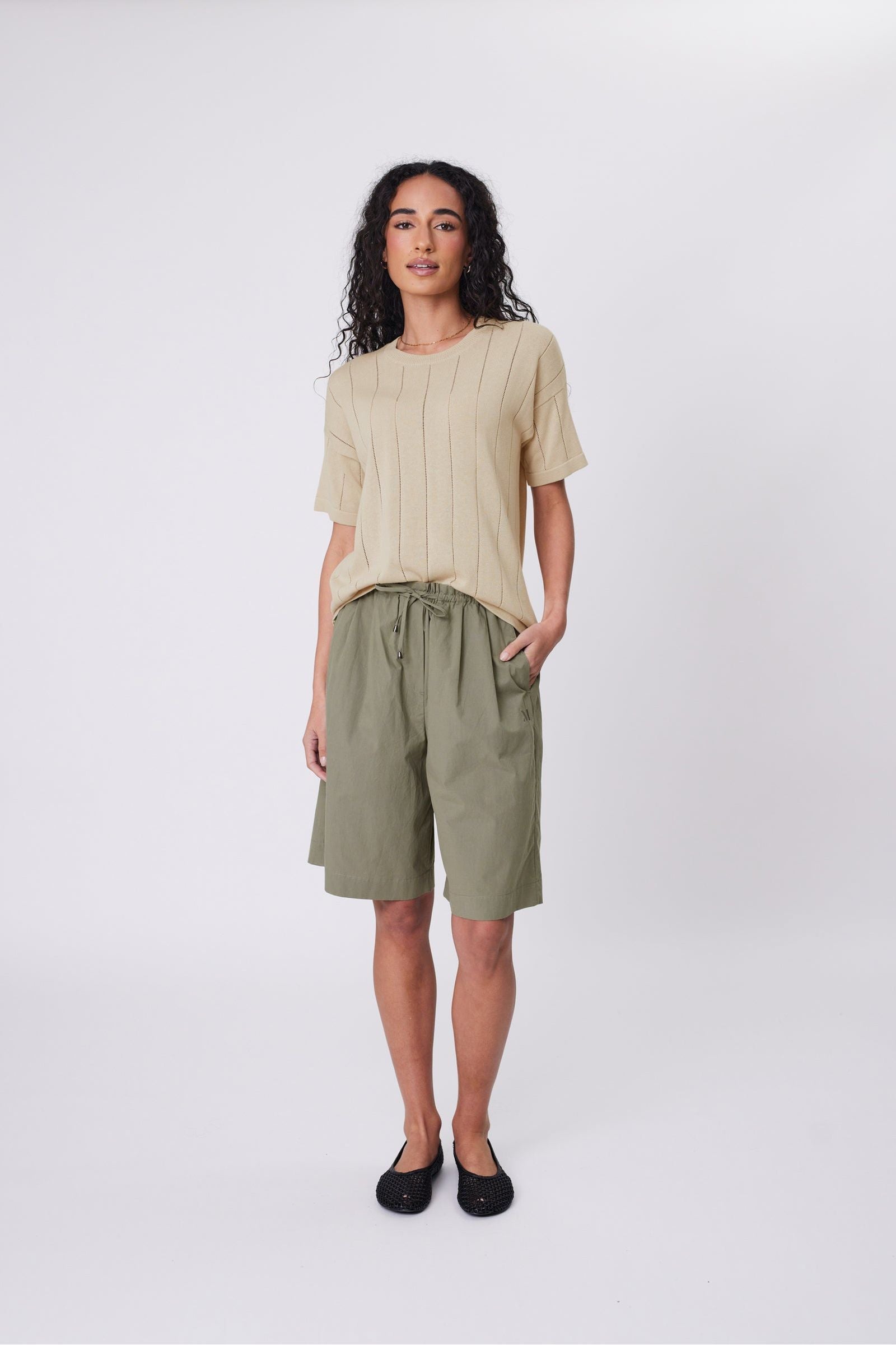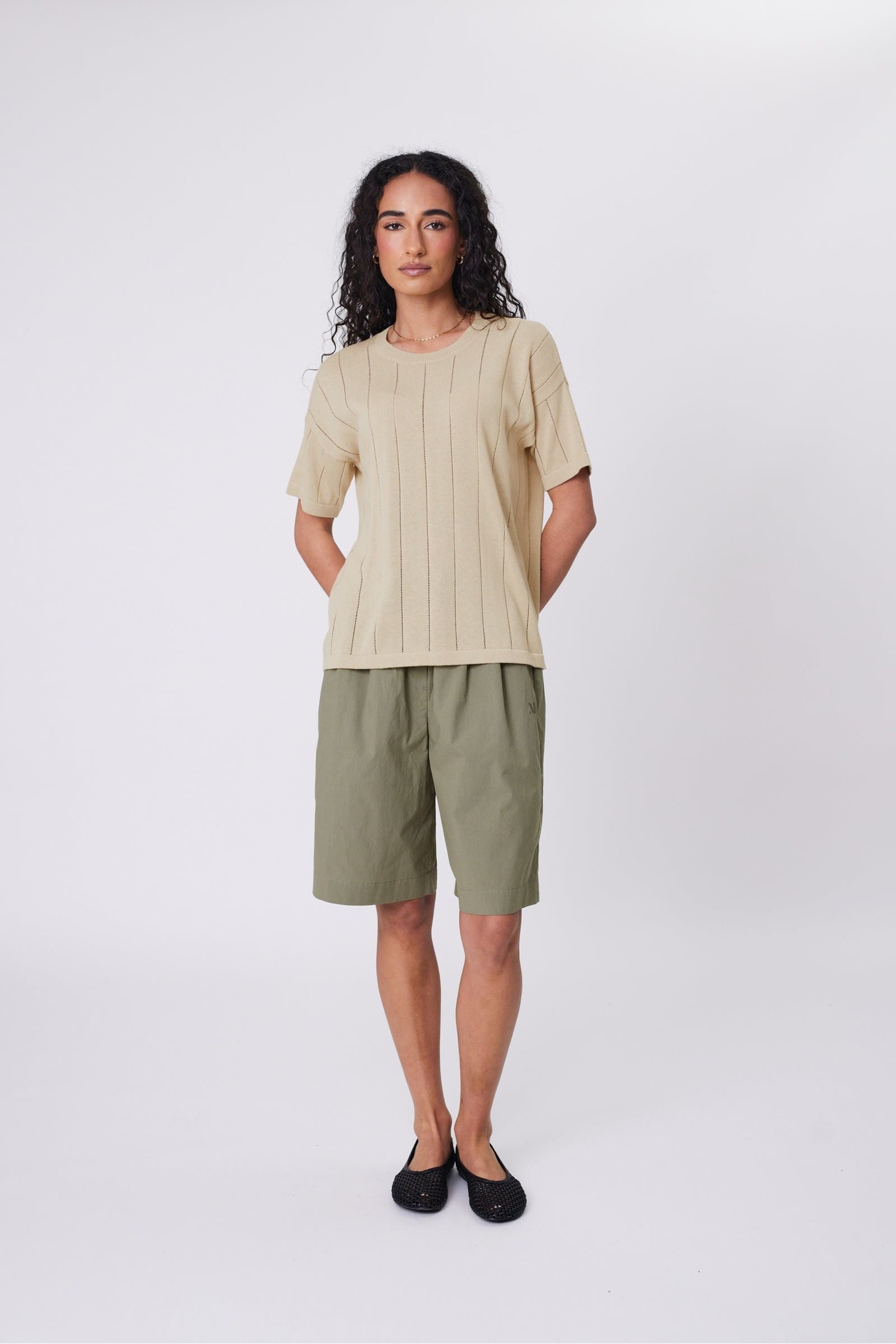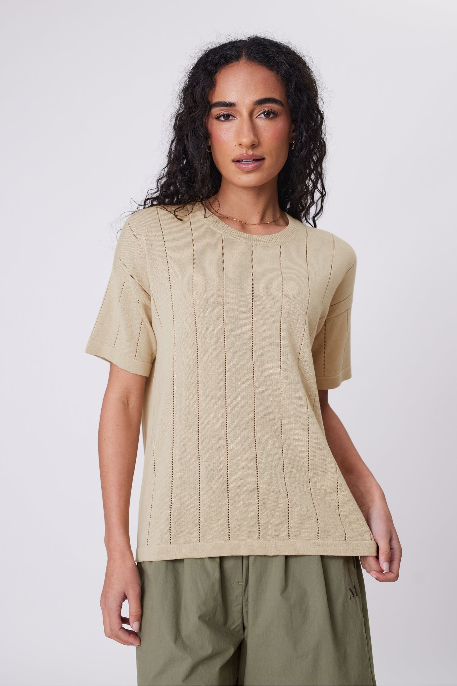 Based on a best-selling silhouette, the Ember Knit Tee is sure to become a new favourite. This knit tee features an easy, relaxed silhouette, with dropped shoulders and a boxy cut. Crafted from 100% cotton yarn for softness and breathability, and knitted in a pointelle stripe knit design for added texture. An elevated alternative to a classic tee, it’s easy to style up or down, whether with a pair of shorts or layered under a blazer for work.