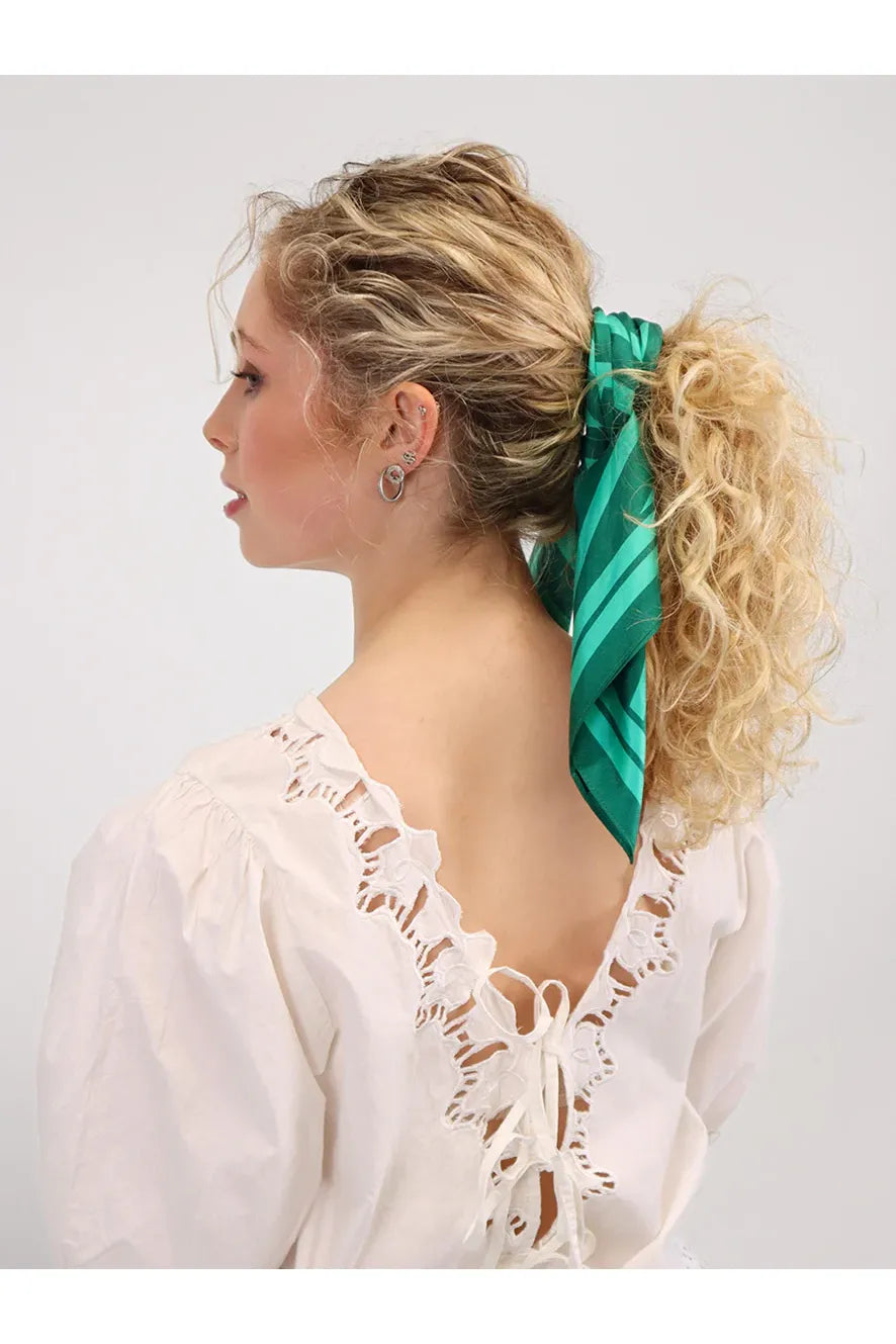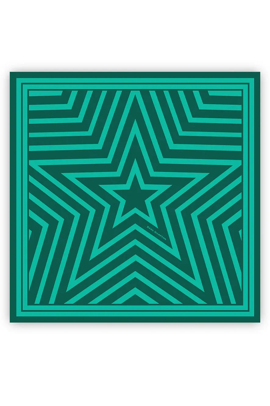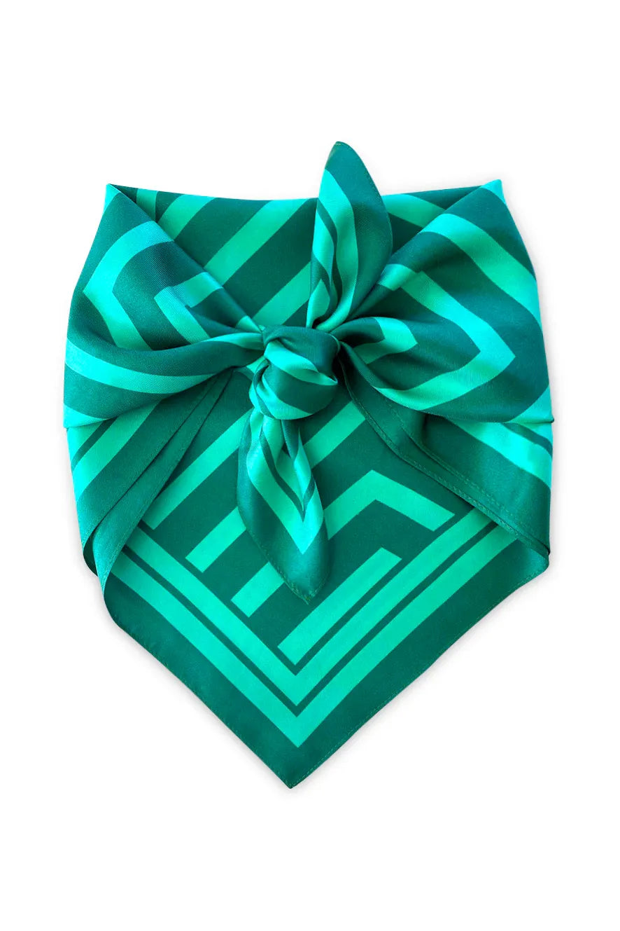 The Quane is a striking green silk petite scarf, featuring a classic star pattern that creates the illusion of stripes.