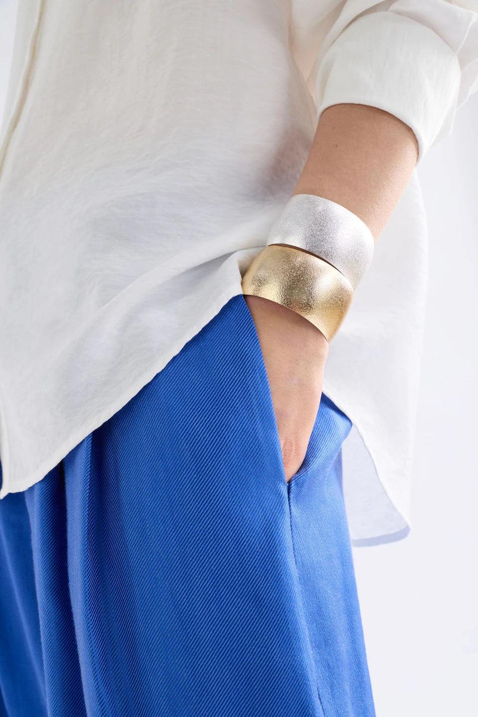 The Detta Bangle is a classic wide cuff style with a surface texture effect that reflects light in interesting ways, creating a subtle sparkle effect. This simple shaped design's unique textural element adds a touch of shine to day and evening looks, while the open-ended design allows for size adjustability. Coordinate with matching Detta Hoop Earring in classic Silver and Gold colourways.