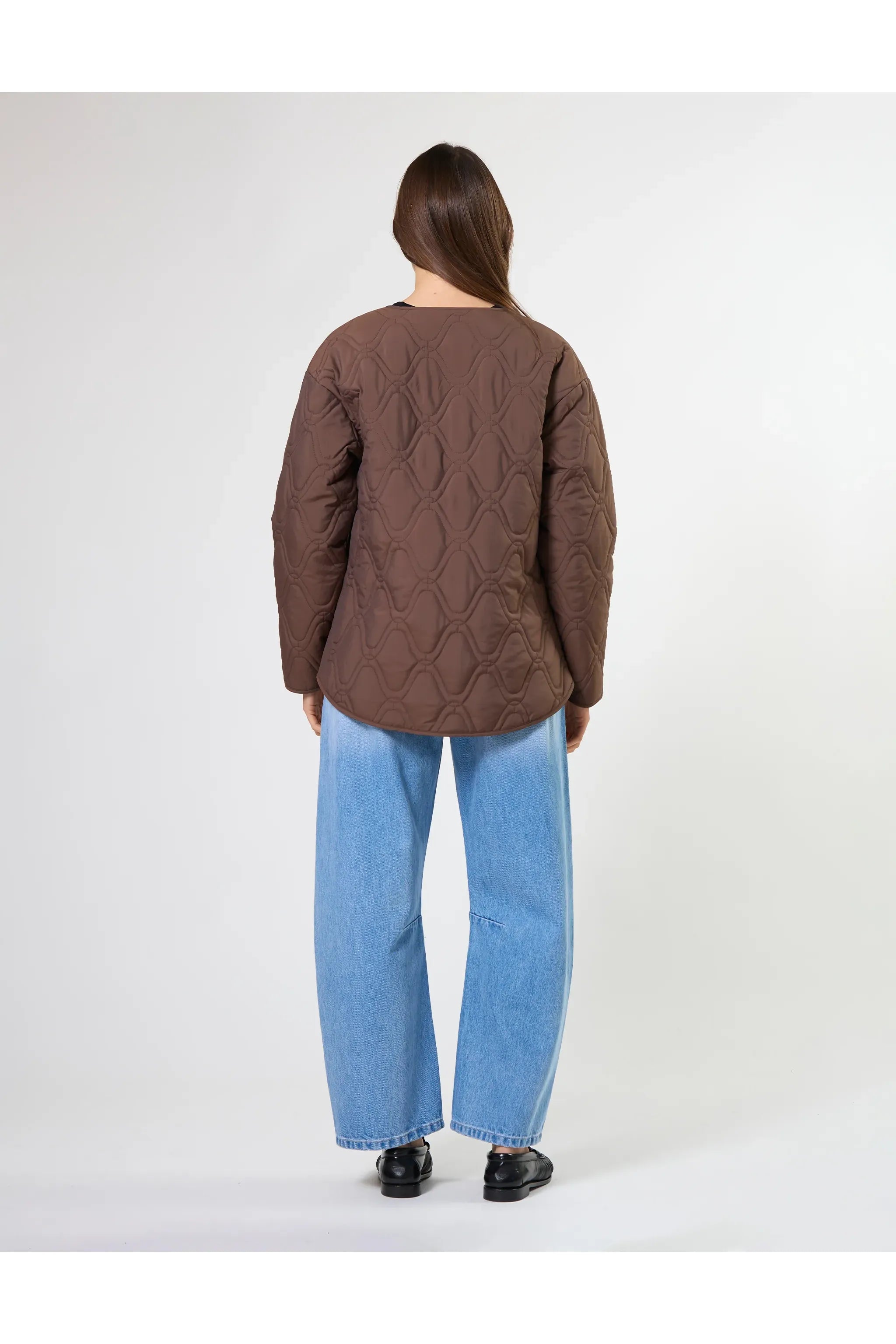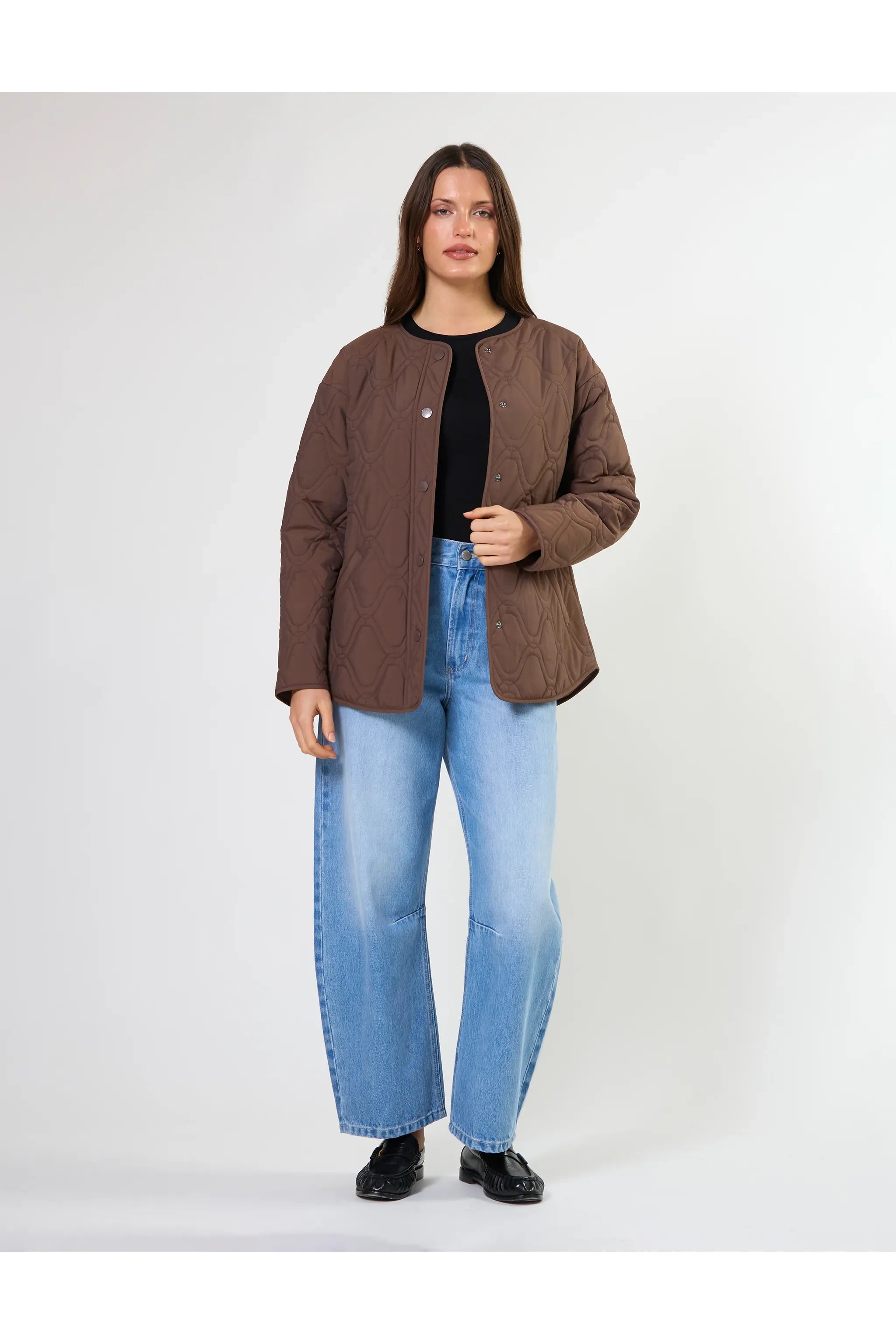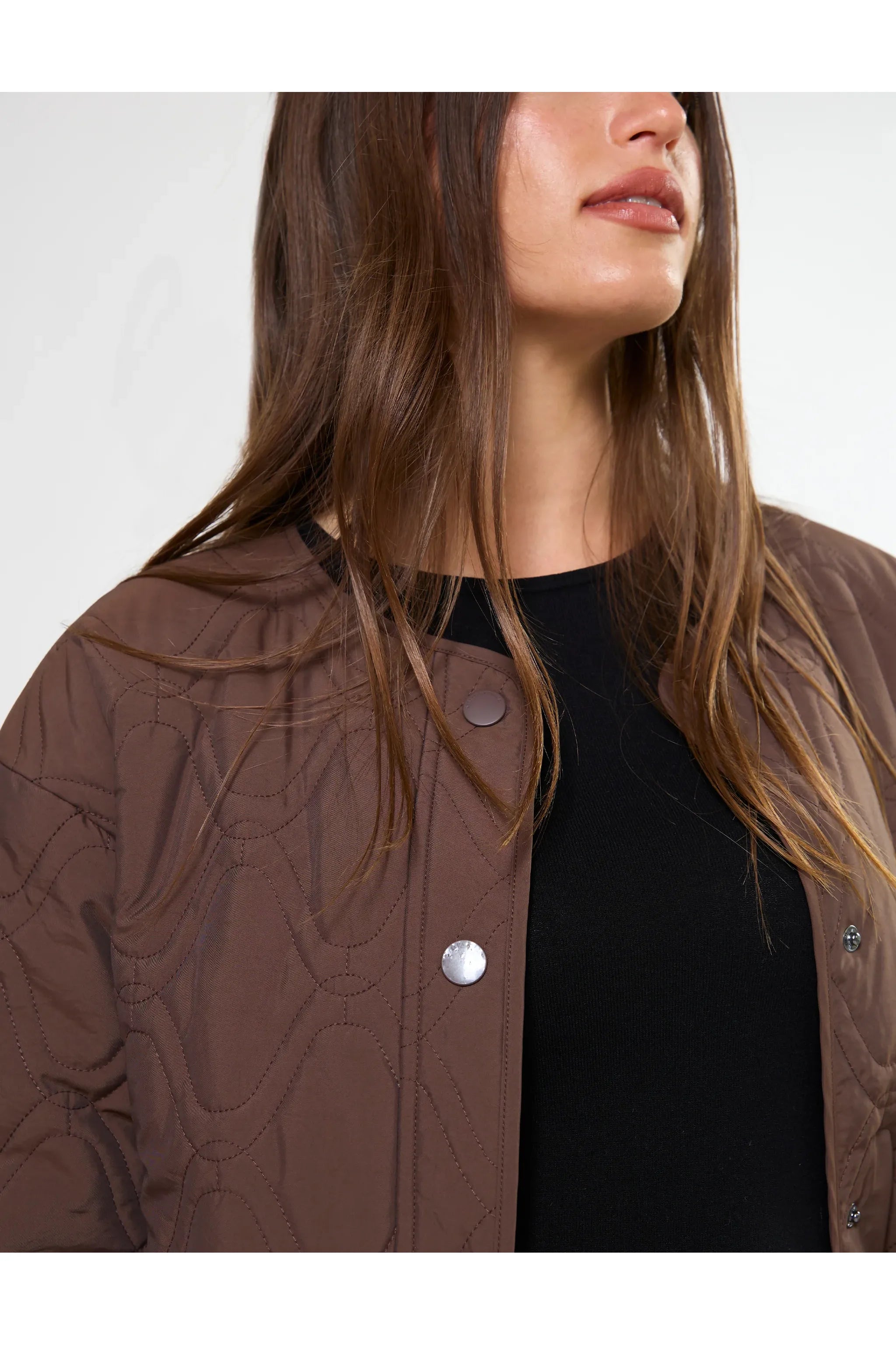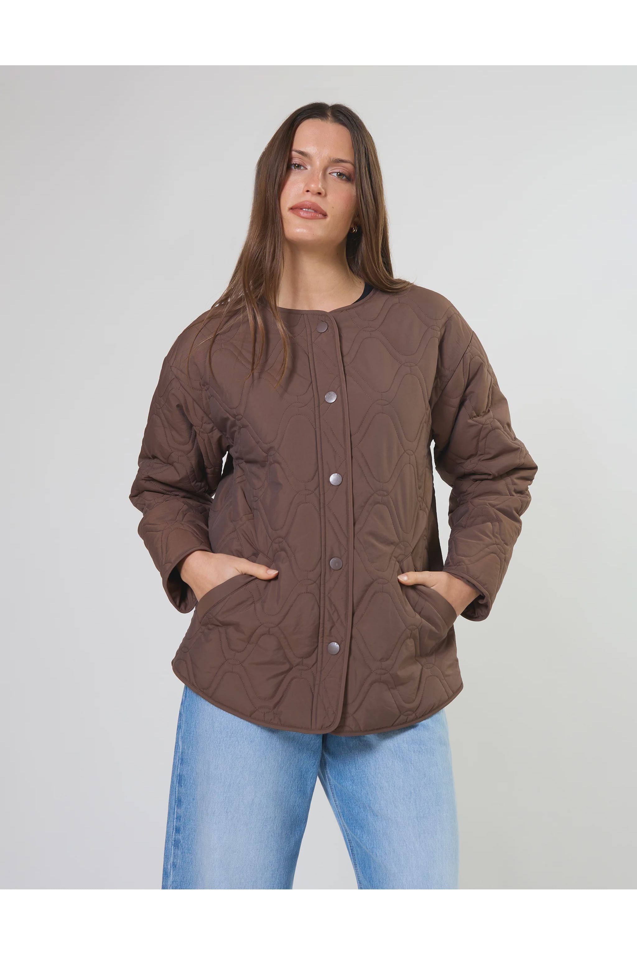 Crew neck collarless jacket with front snap stud fastening. All over embroidery design with lightweight padding.