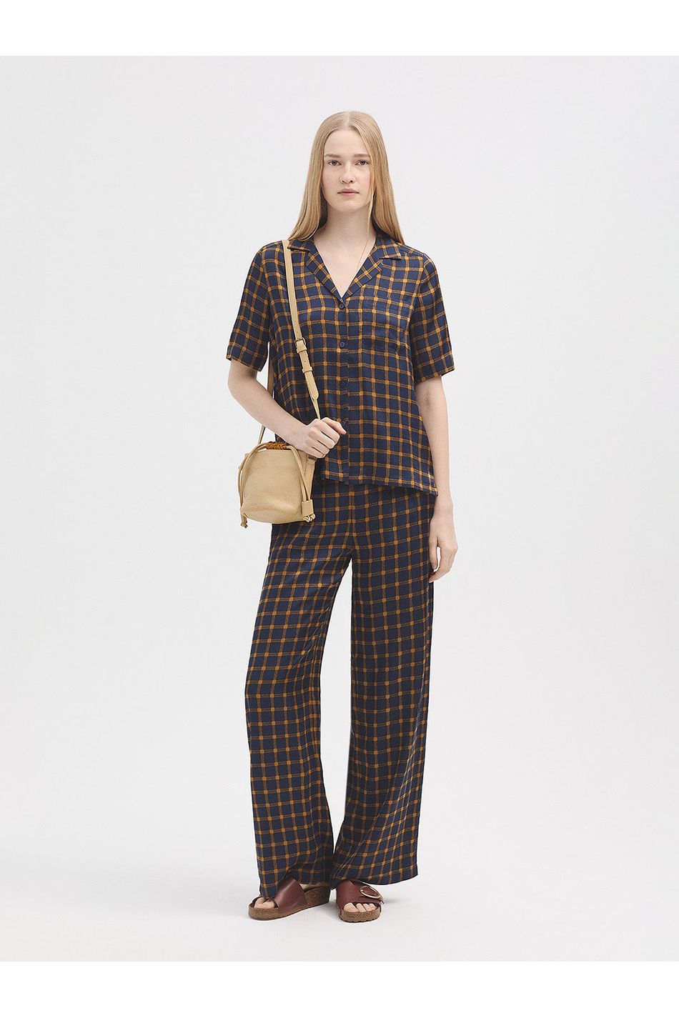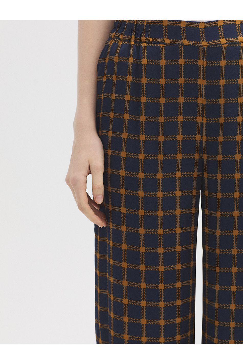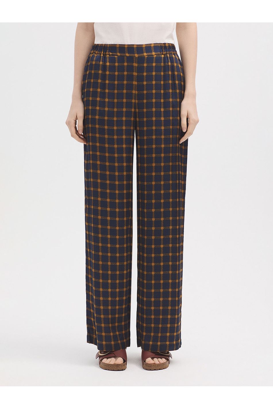 These fluid satin trousers showcase the vibrant Garden Checks print, featuring a wide-leg silhouette and side slash pockets. Designed for comfort with a concealed elasticated waistband at the sides for a smooth, flexible fit.