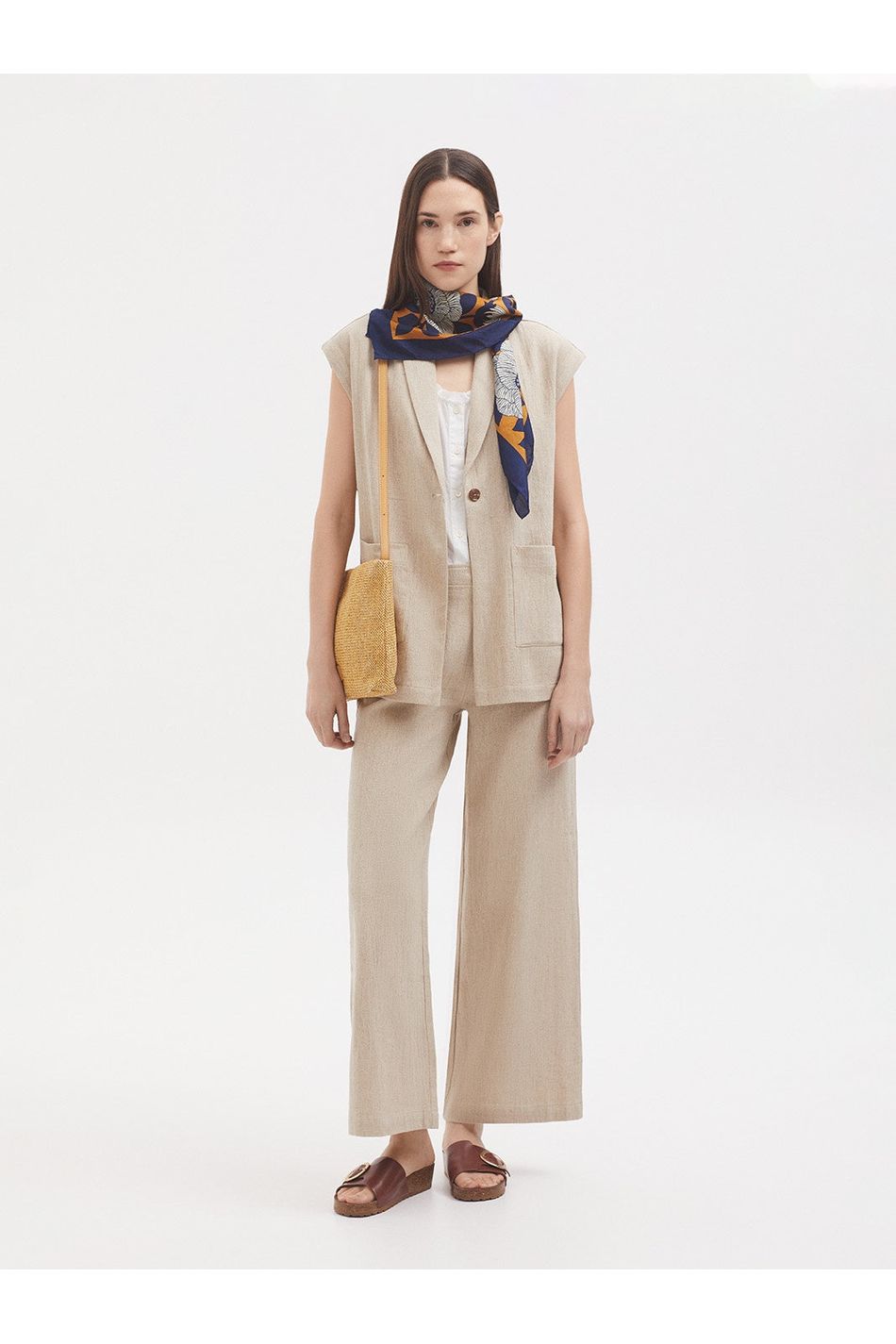 Crafted from a sustainable linen and cotton blend, these wide-leg trousers feature front pockets, coconut button details, and a discreet side seam zip for a clean, tailored look.