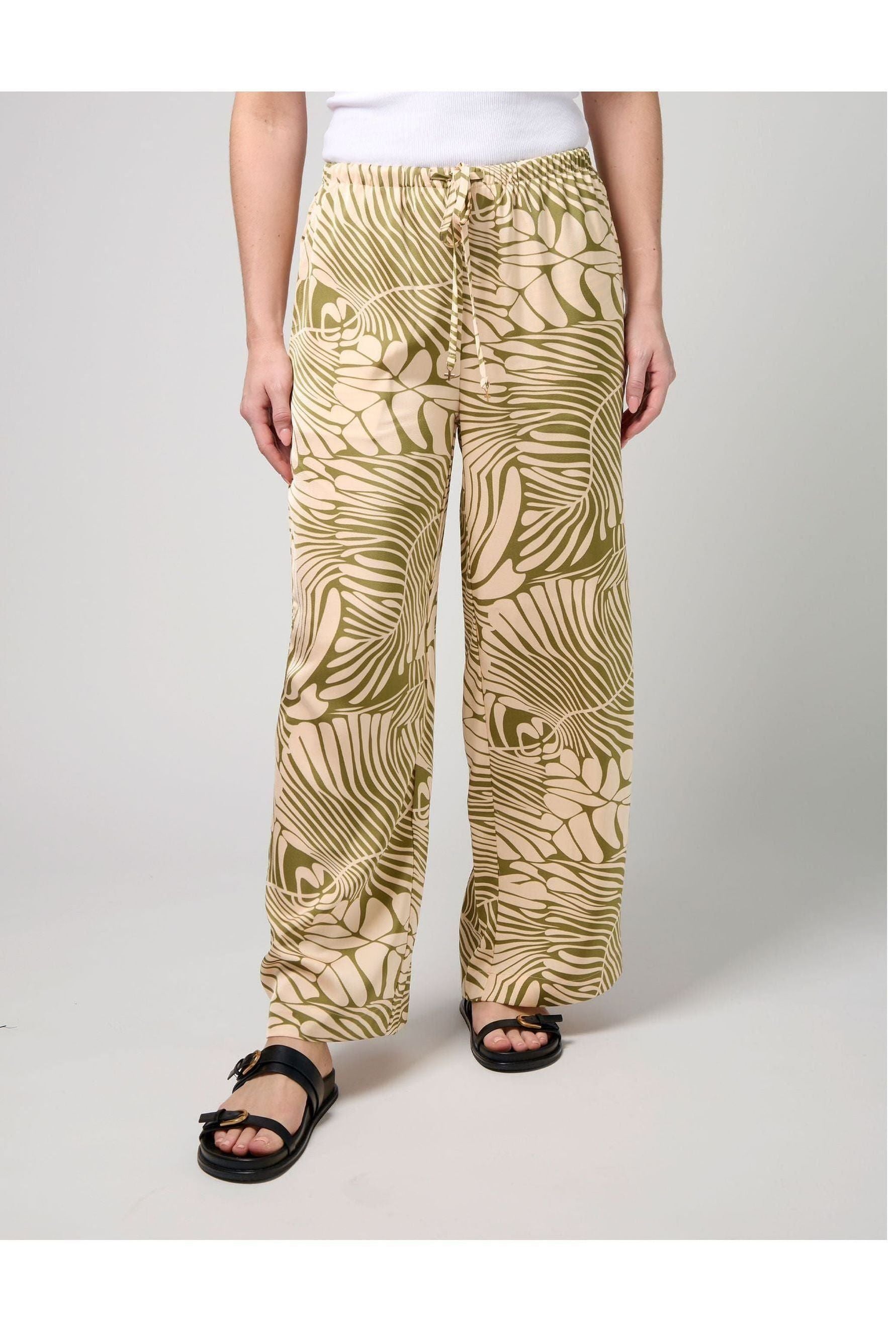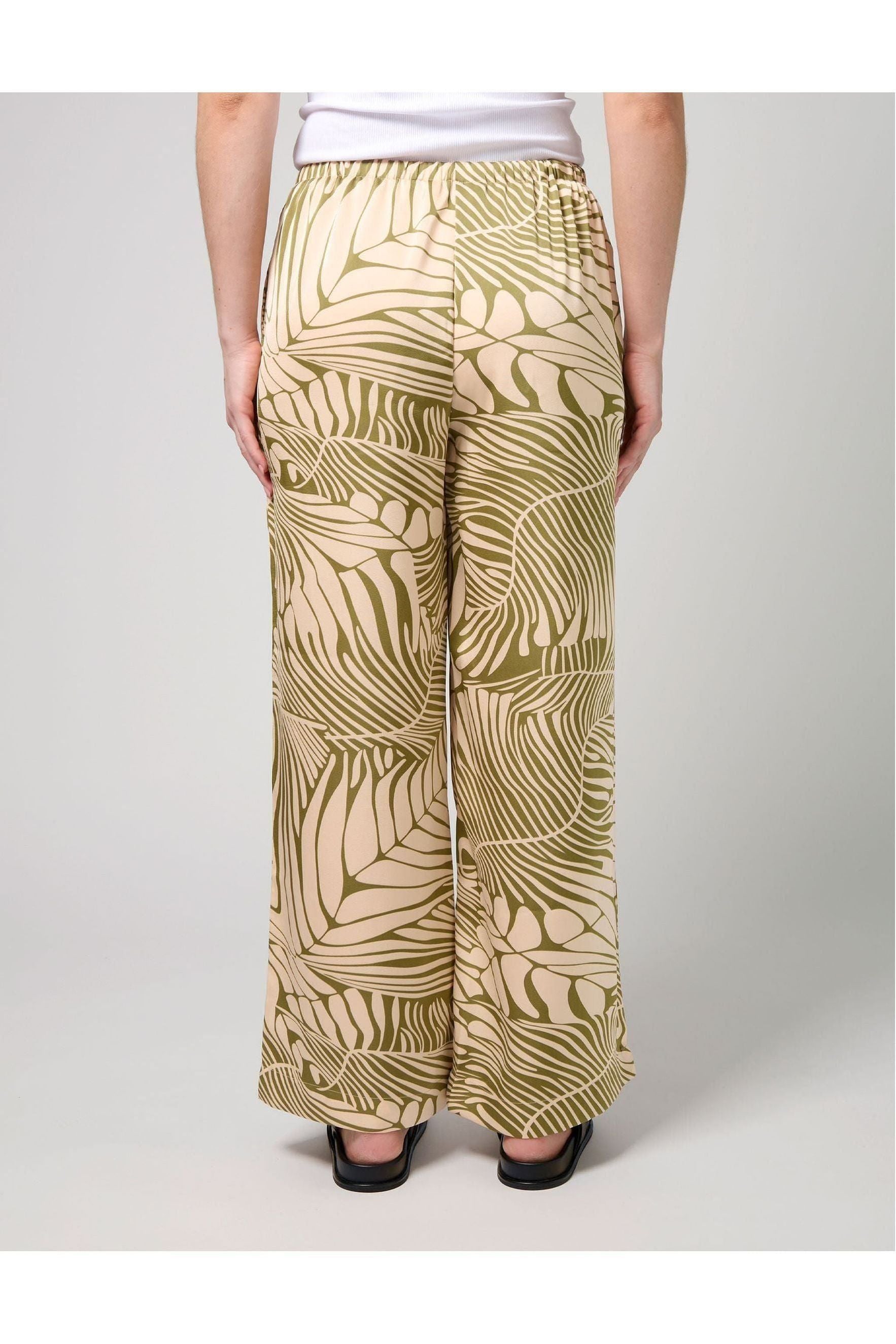 Effortless style meets all-day comfort with the Alanis Pant in a signature Monte Verde print. Crafted from 100% polyester, these lightweight, wide-leg pants feature a breezy silhouette and an elasticated waistband with an adjustable drawstring for a perfect fit. The tropical green leaf print on a soft beige base adds a fresh, relaxed vibe to any outfit.