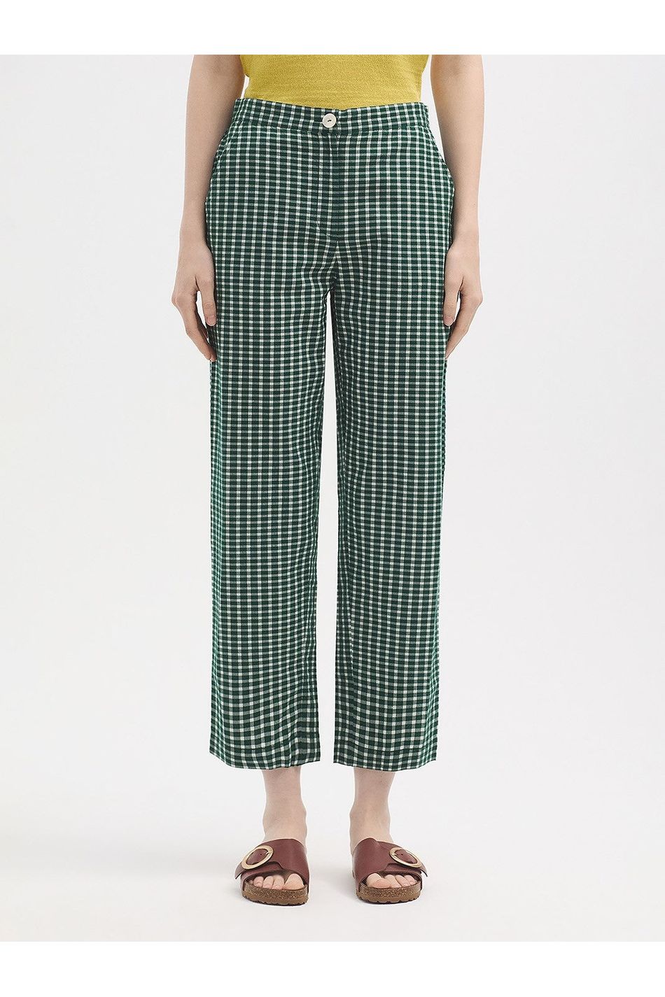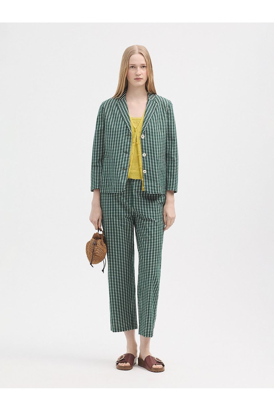 Made from sustainable cotton with a touch of polyester, these seersucker checked trousers feature a straight-leg silhouette, slash pockets, and a front fastening with a mother-of-pearl button and zip. The concealed elasticated back ensures a comfortable, flexible fit.