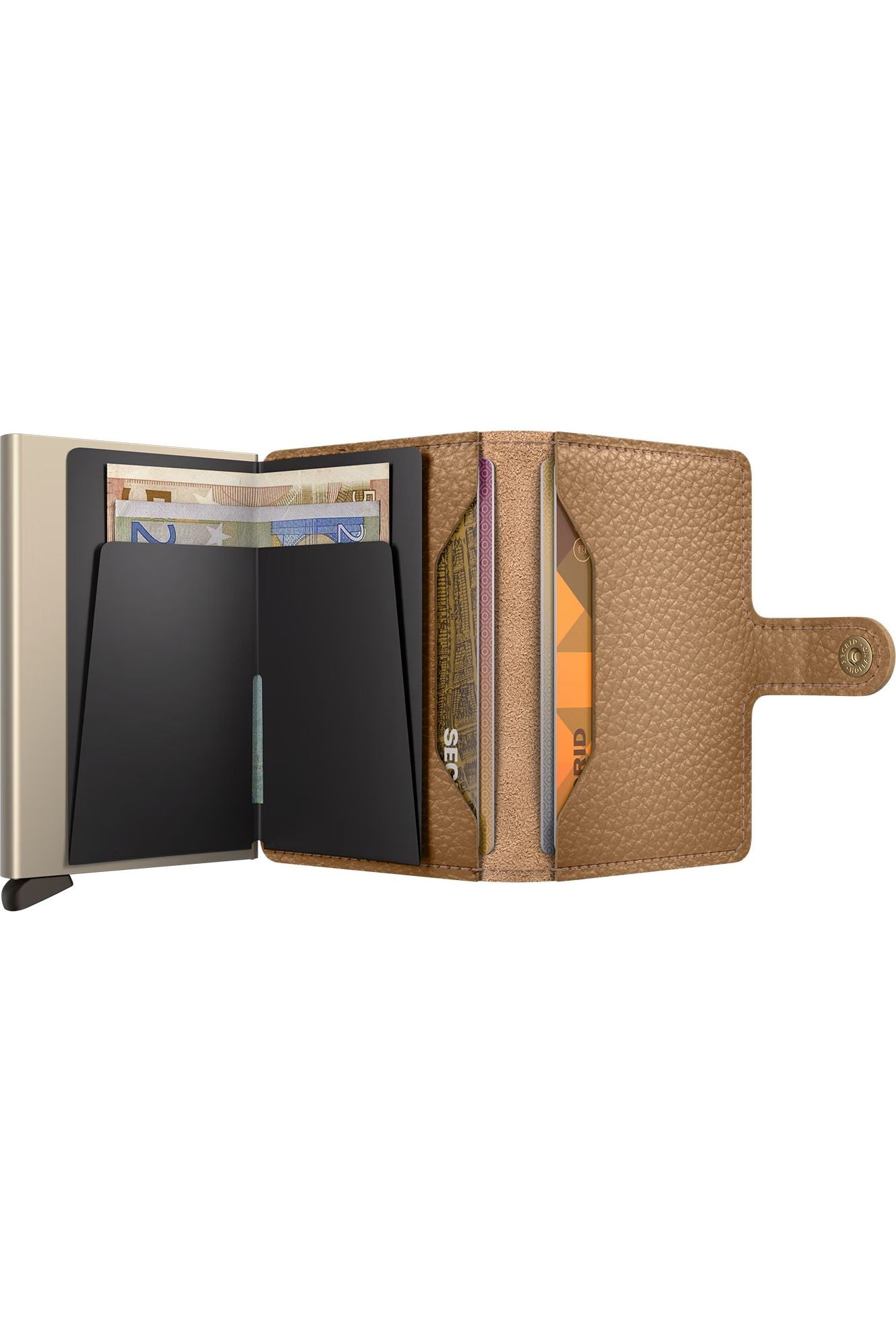 The exterior holds banknotes, receipts and cards. At the same time, the aluminium Cardprotector allows you to slide out cards with one simple motion and protects them from bending, breaking and unwanted wireless communication.