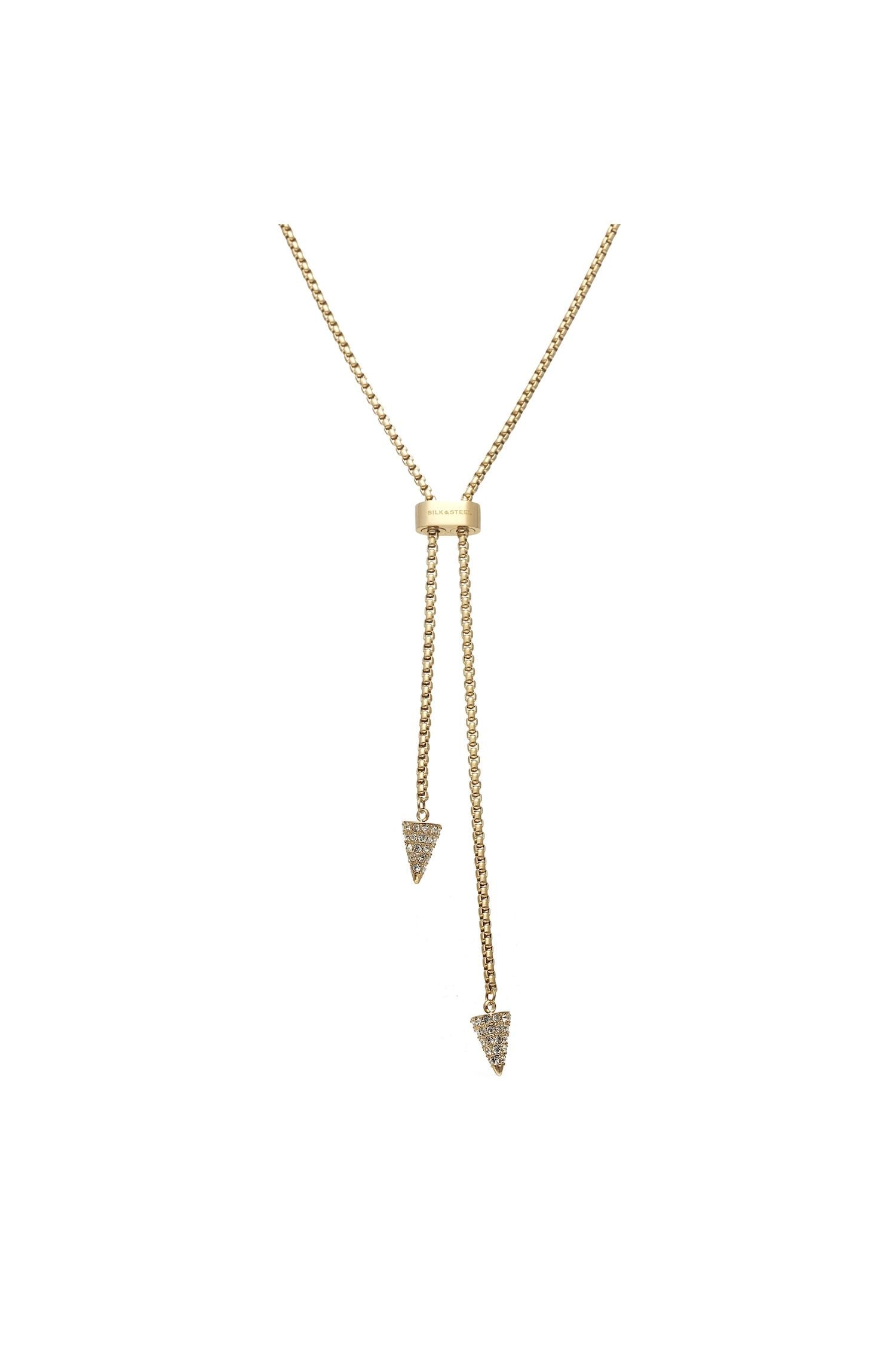 Toggle lariat box chain necklace with cubic zircnoia spike pendants in 14k gold-plated stainless steel or silver stainless steel.