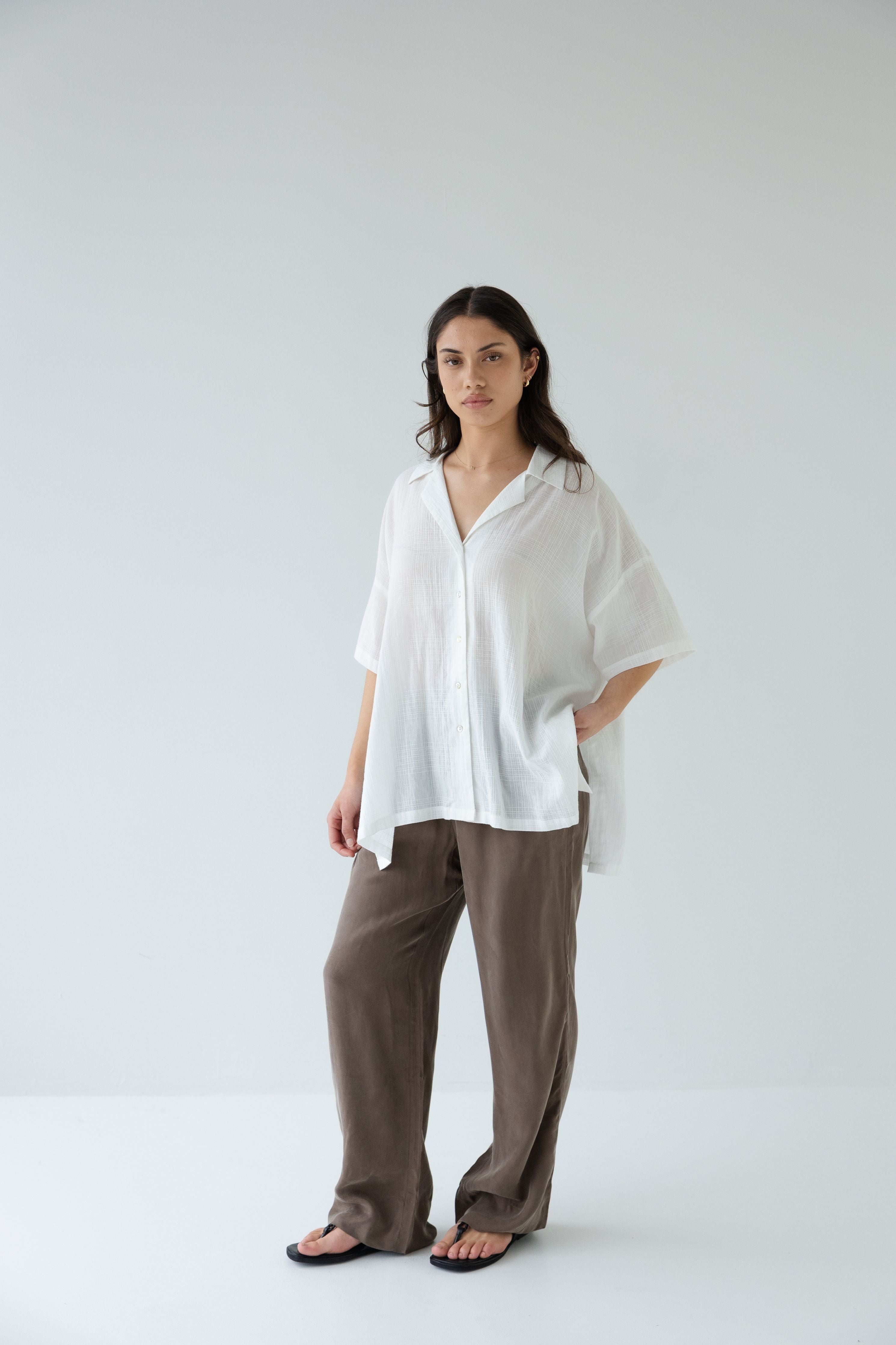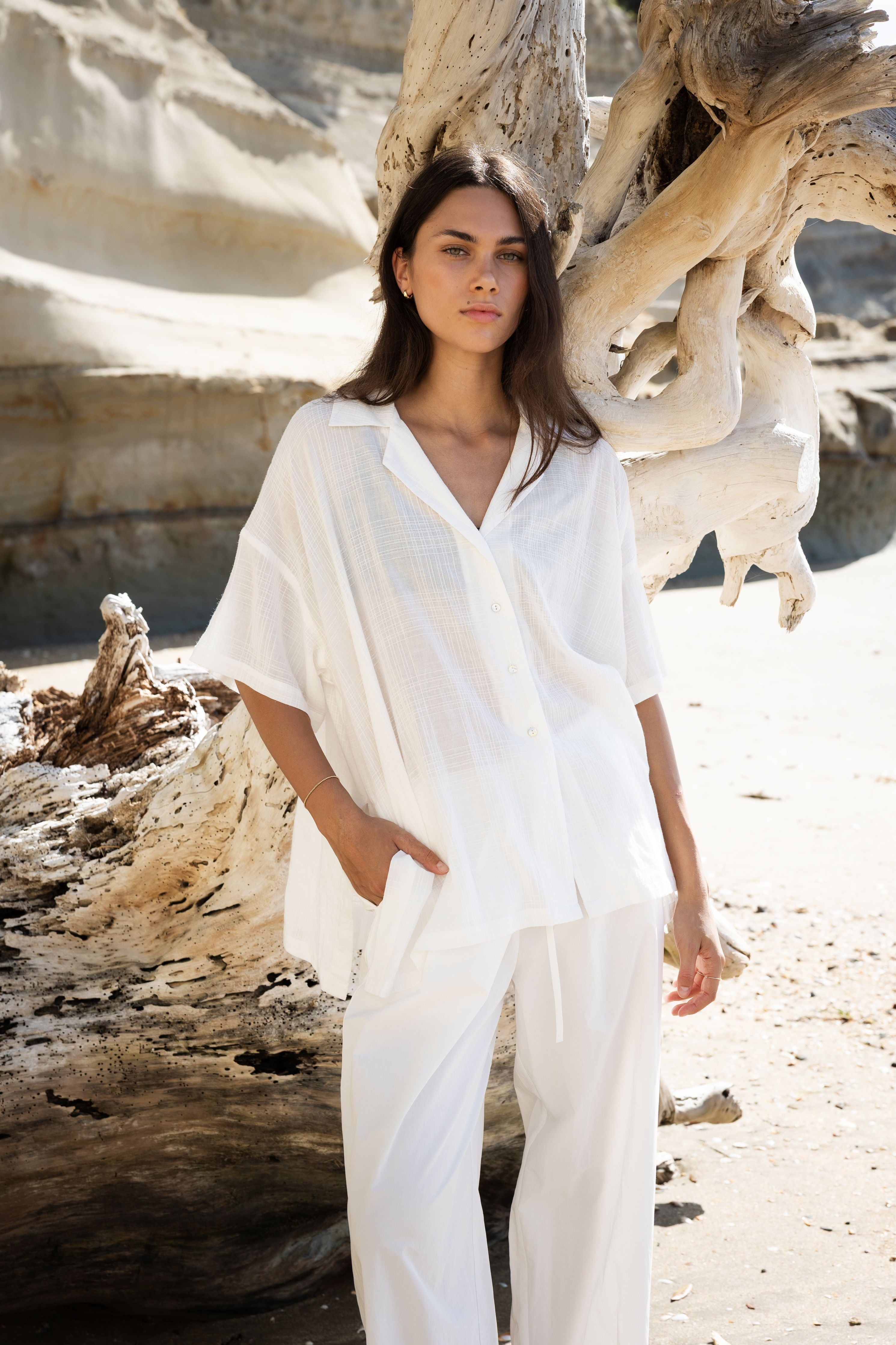Easy wear shirt, on & off the beach. Collar & lapel details, button down at the front & side splits. Wear with swim, cotton pants or denim.