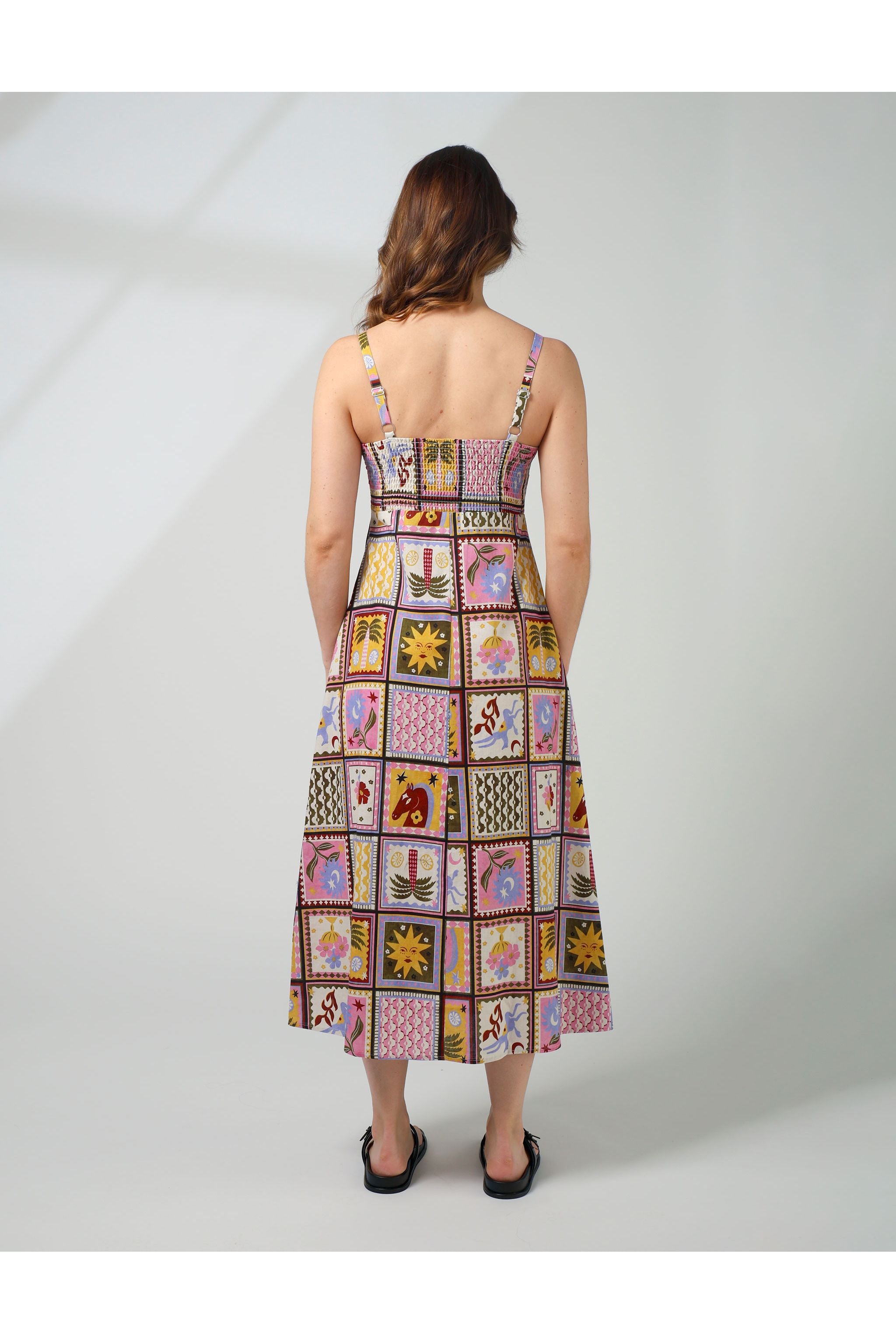 The Jude Dress is a warm-weather staple designed with a straight-across bodice and gentle waist definition for a flattering silhouette. Falling to a midi length, the skirt has a slight fullness that moves with ease. Made from a breathable blend of cotton and linen, it’s perfect for sun-soaked days. The vibrant multi-coloured print—featuring pink, khaki, mustard yellow, white, and cornflower blue—evokes memories of Moroccan markets and summer escapes.