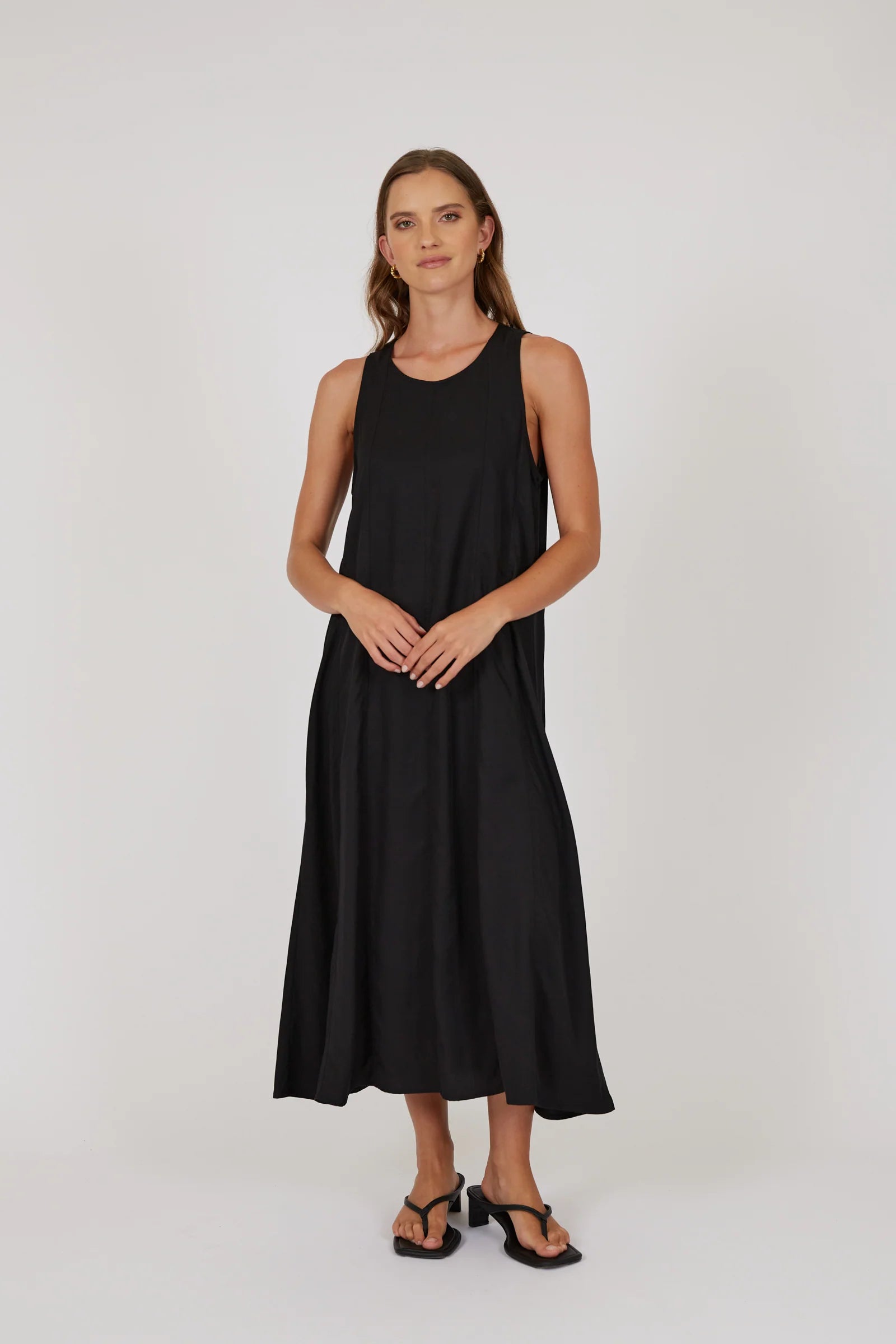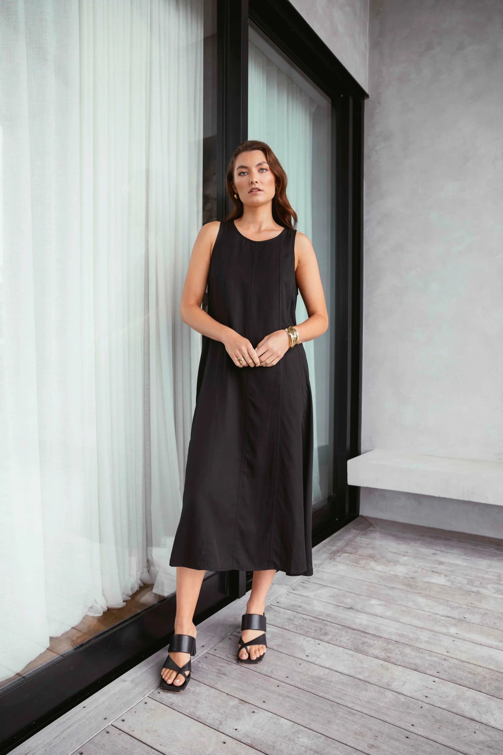 The Palma Dress is your effortlessly polished summer staple - relaxed, flowy, and designed to drape beautifully with every step. Crafted from 100% Tencel for a soft, silky feel, this midi-to-maxi style moves seamlessly from day to night. The sleeveless design and crew neckline create a clean, modern look, while the back keyhole closure and statement fabric bow add a refined touch. Style with slides and a raffia bag for brunch, or elevate with heeled sandals and a clutch for event season.