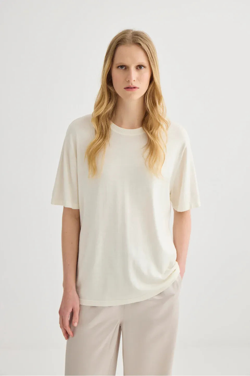 Short Sleeve Silk Blend Knit Tee | Cream