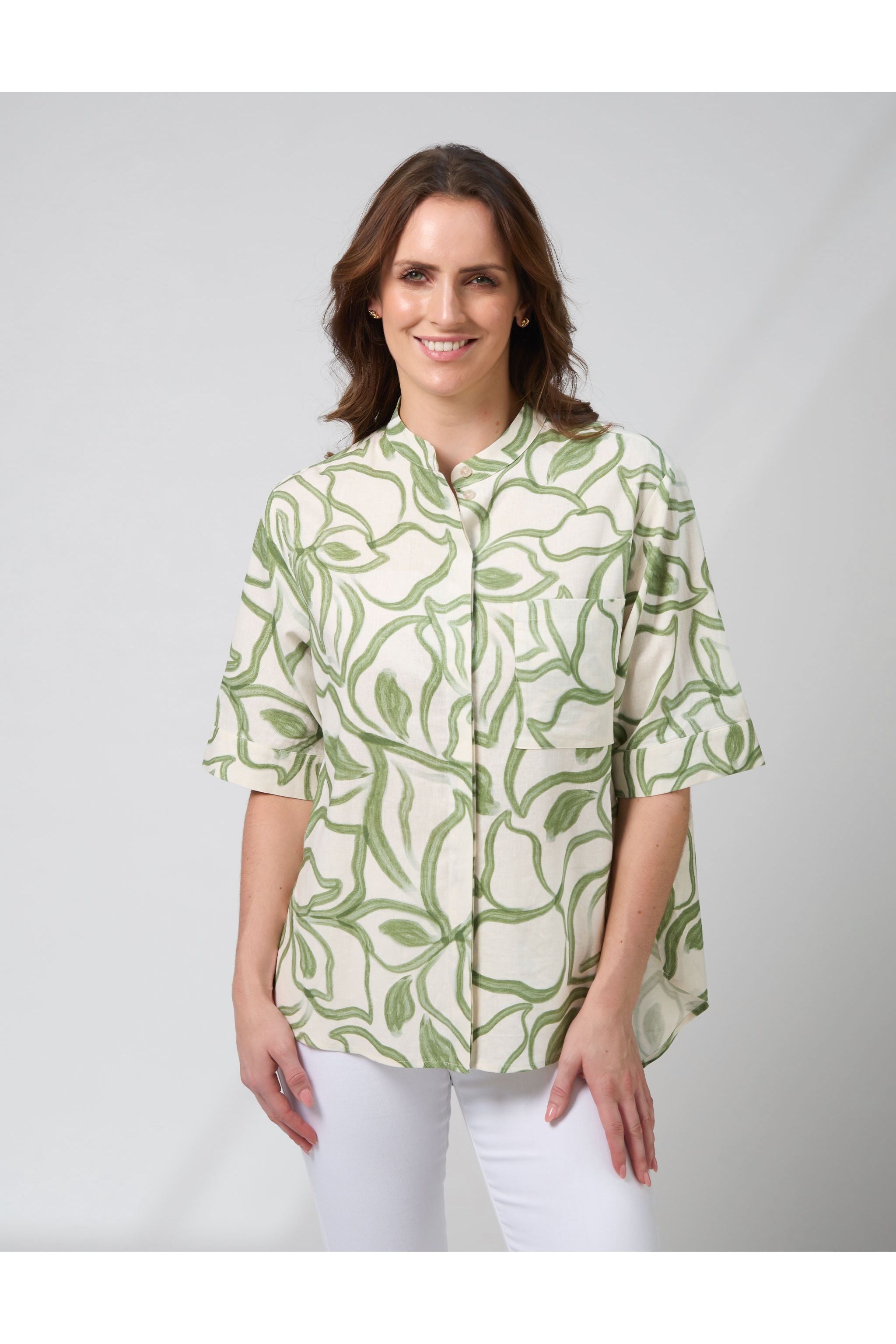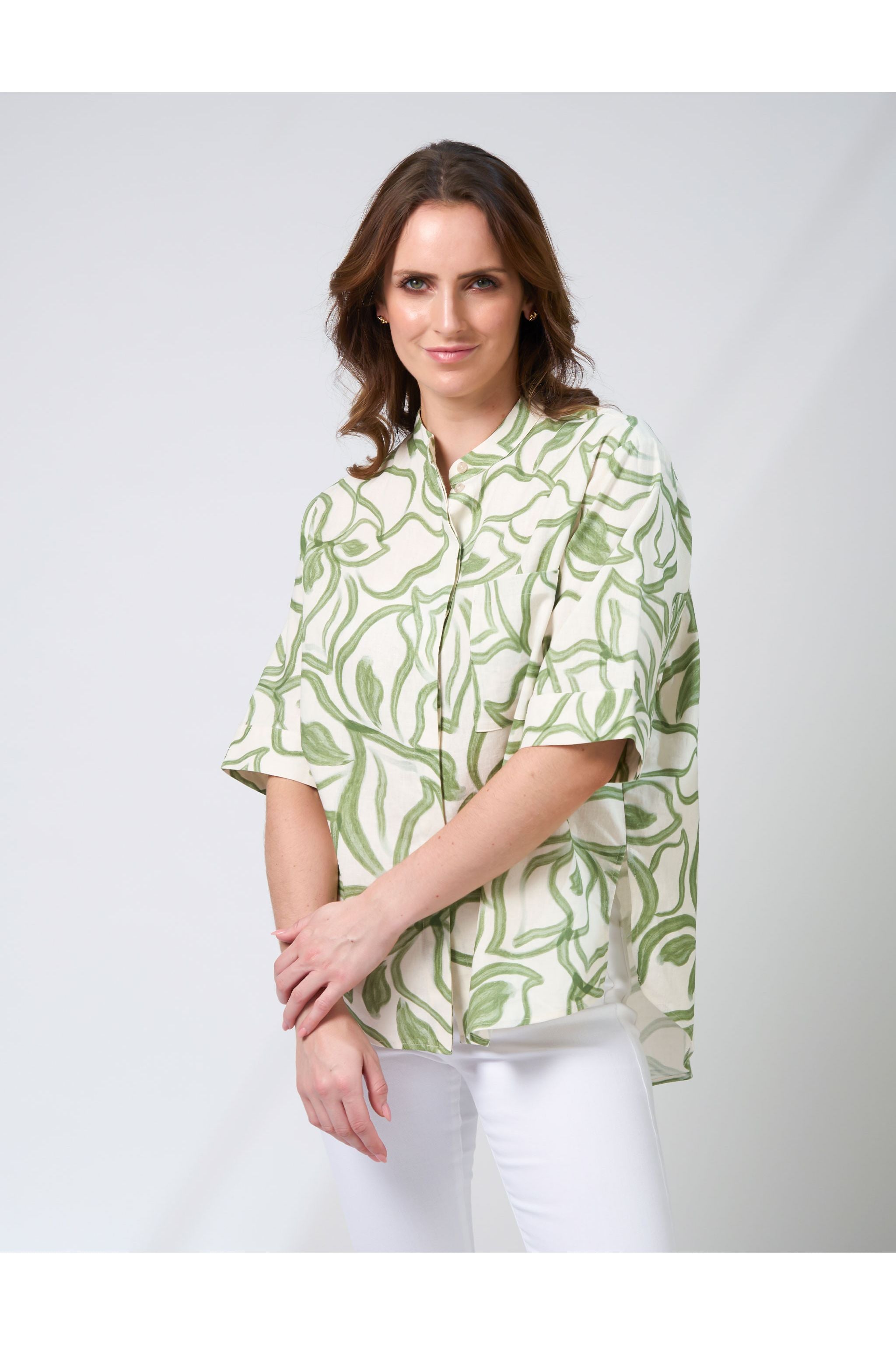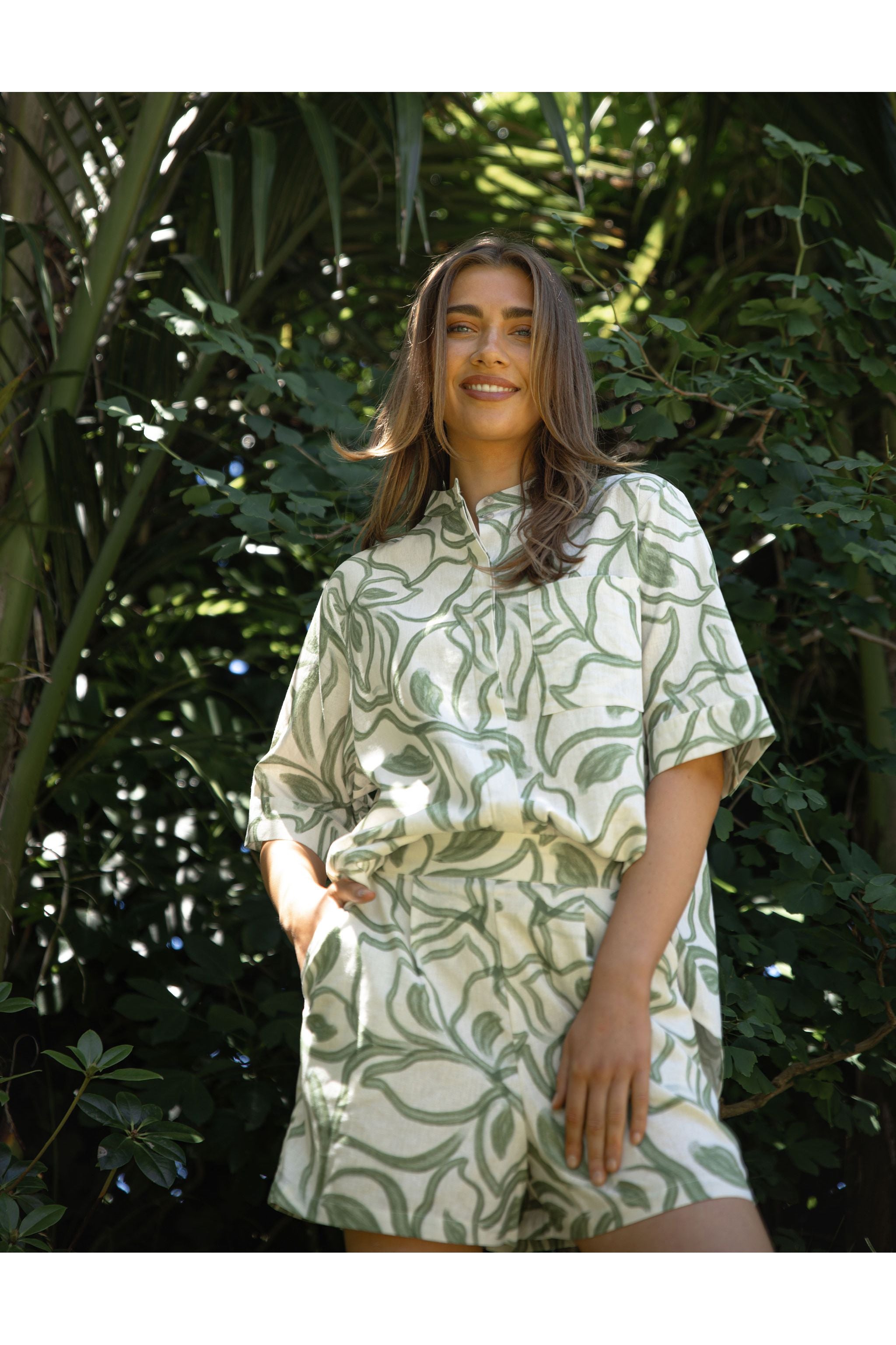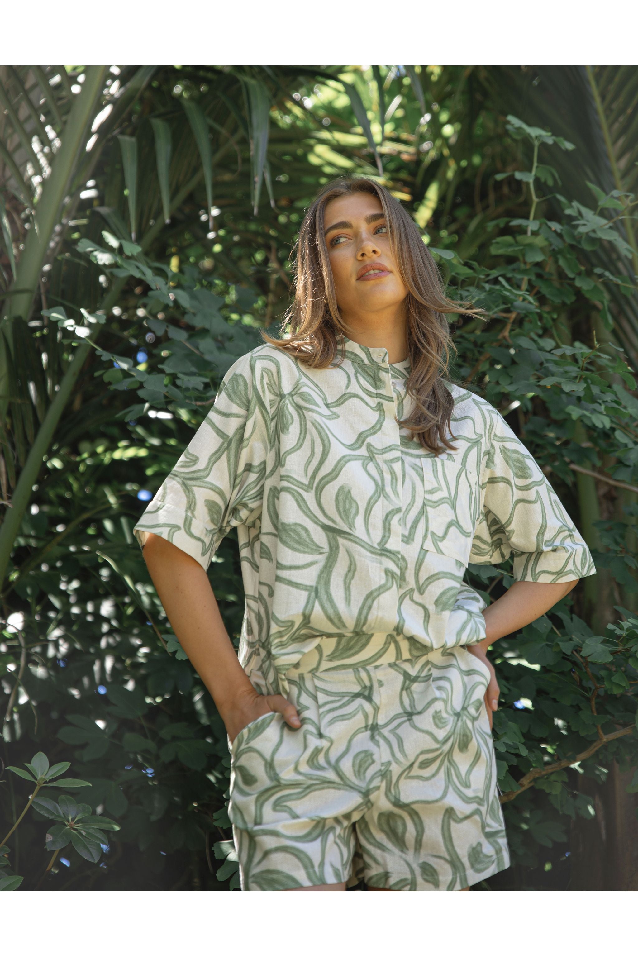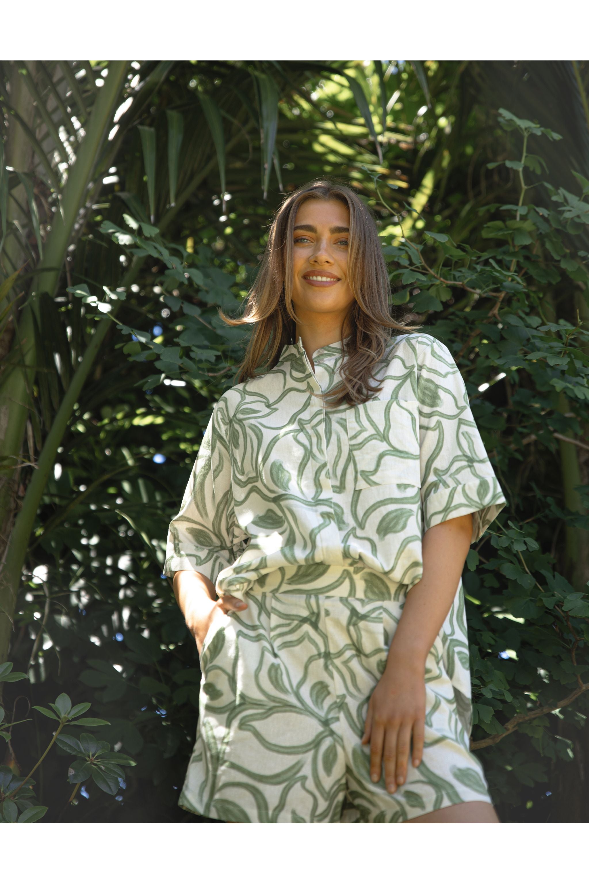 A lightweight button-up in airy linen mix, finished with a painterly green leaf print for a fresh summer feel. Relaxed through the body with short sleeves and a neat collar, it’s designed to be worn tucked, tied, or left loose for effortless styling. Pair with the matching Mila Shorts for an easy set, or mix back with denim and neutrals.
