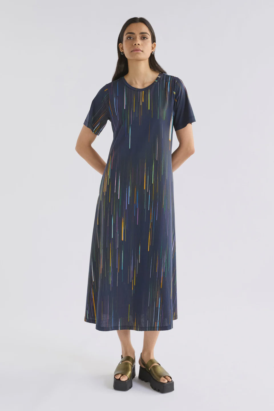 A new iteration of Elk's stretch jersey t-shirt dresses, the Mekko Dress features the striking and sophisticated Alinea Print of abstracted light streaks on a classic navy background. Slightly fitted in the bust, flowing into a relaxed A-line silhouette. This short-sleeved t-shirt dress has boxy sleeves and classic crew neckline. Crafted from soft, stretchy organic cotton jersey, this classic dress can be taken from work to weekend effortlessly with just a change in accessories