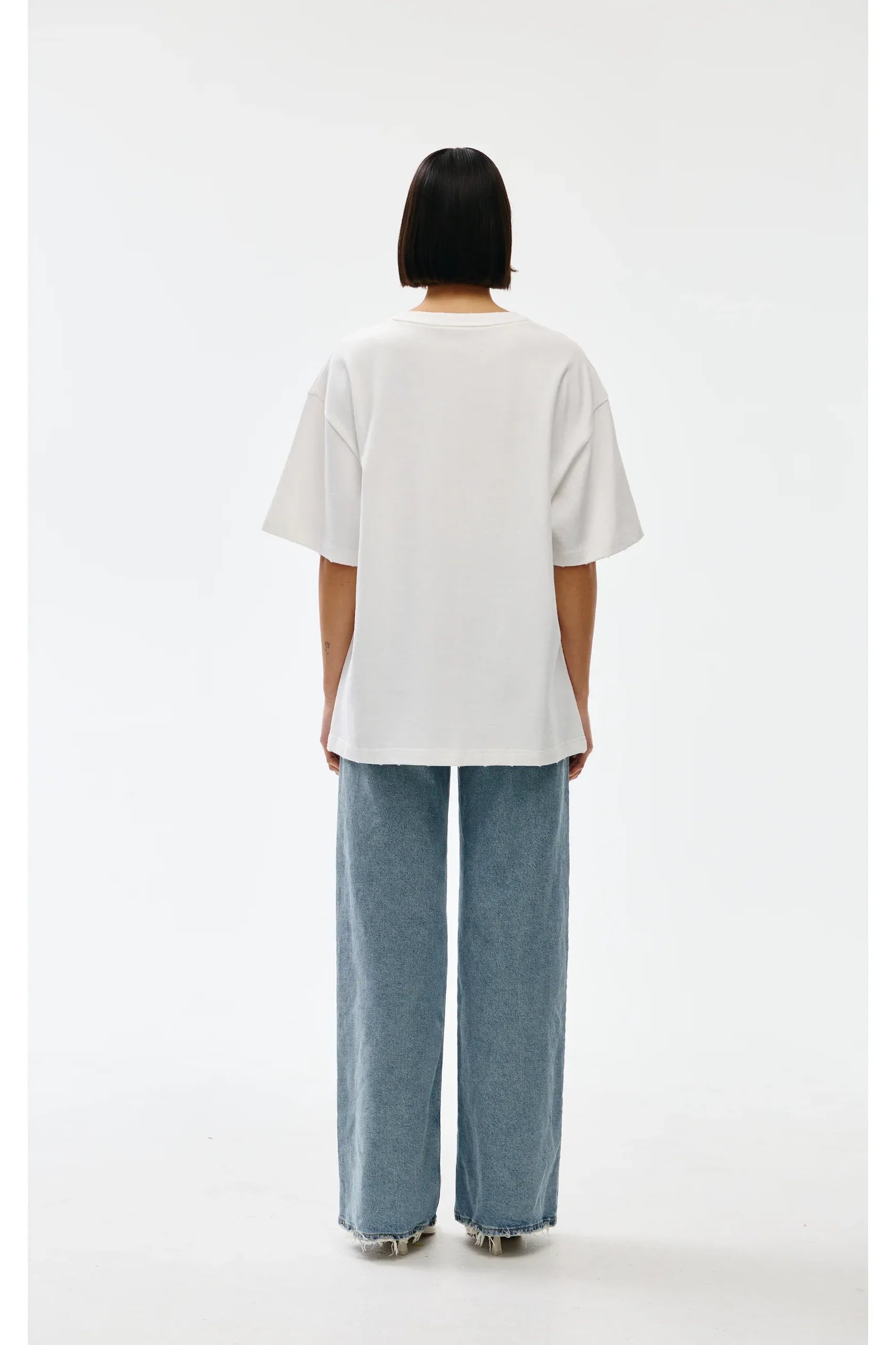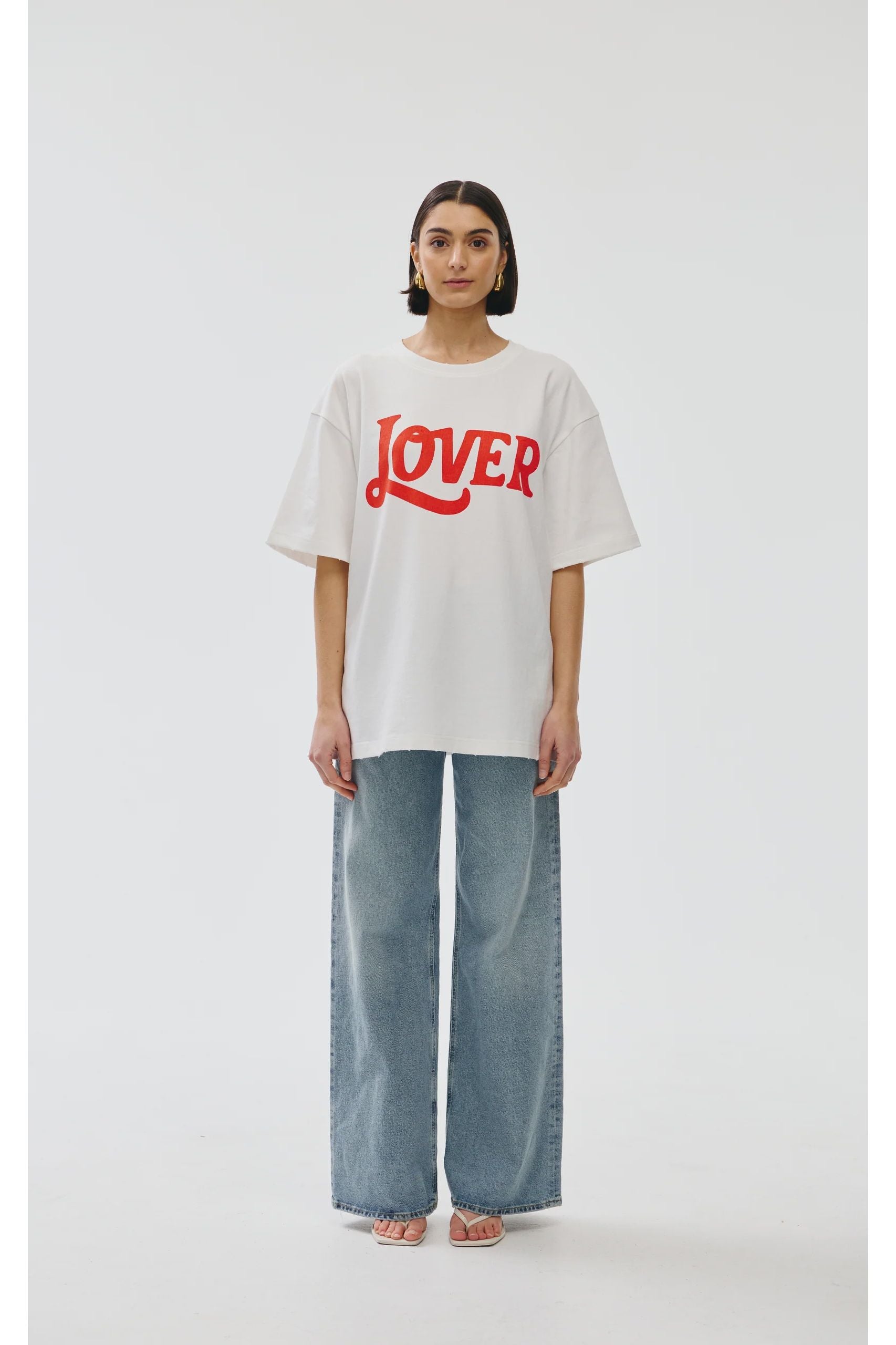 The Lover Tee White is a classic oversized fit tee, made from quality cotton. Designed with a relaxed, boxy silhouette, featuring subtle distressed detailing along the neckline, sleeves and hem and bold Lover printed in vibrant red.