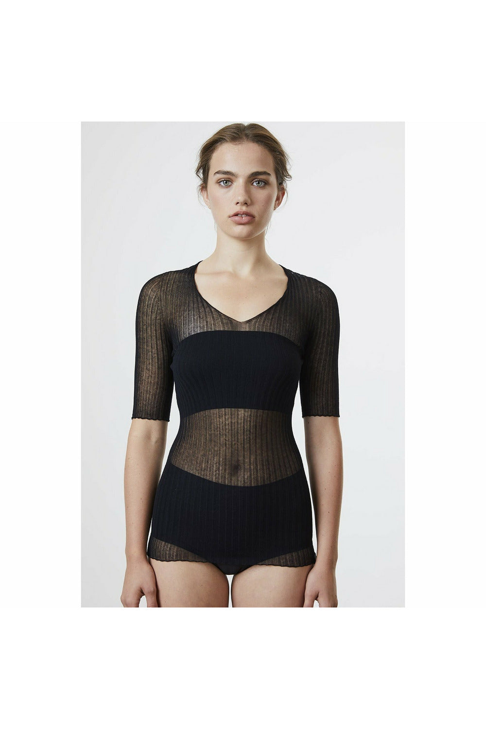 A superfine and extremely lightweight long sleeve V neck top. This all-over sheer ribbed knit has been crafted with zero-waste from Supima Cotton. Wear it under a garment or simply on it's own.