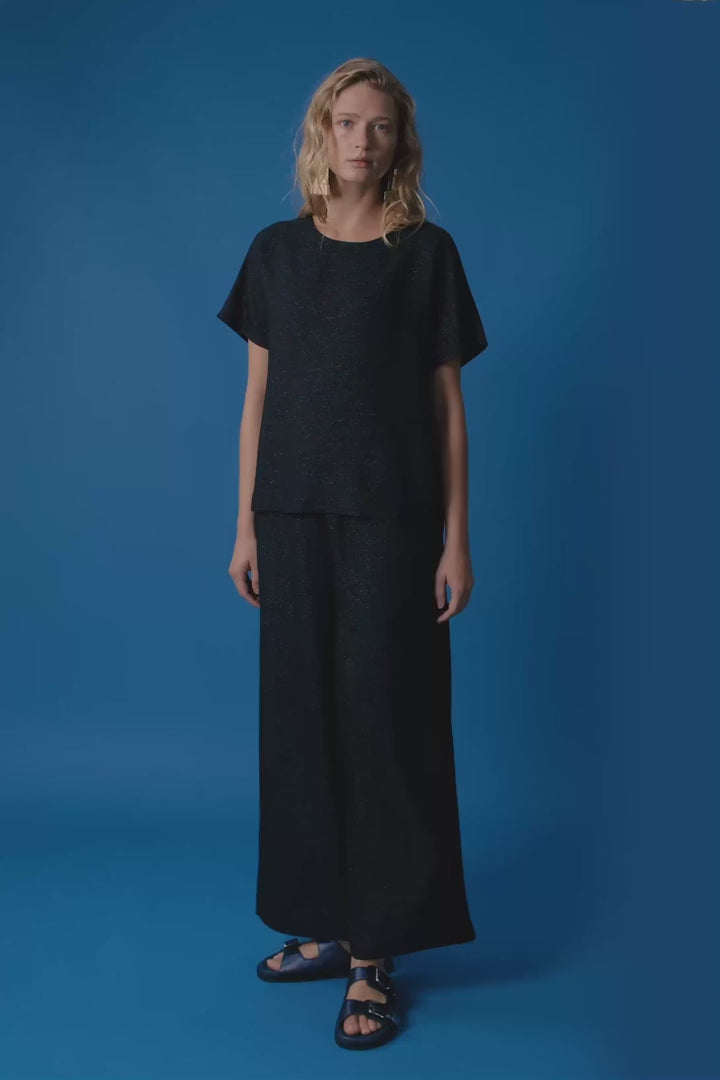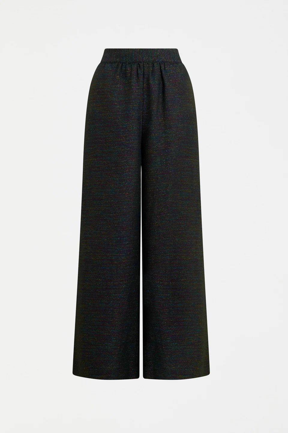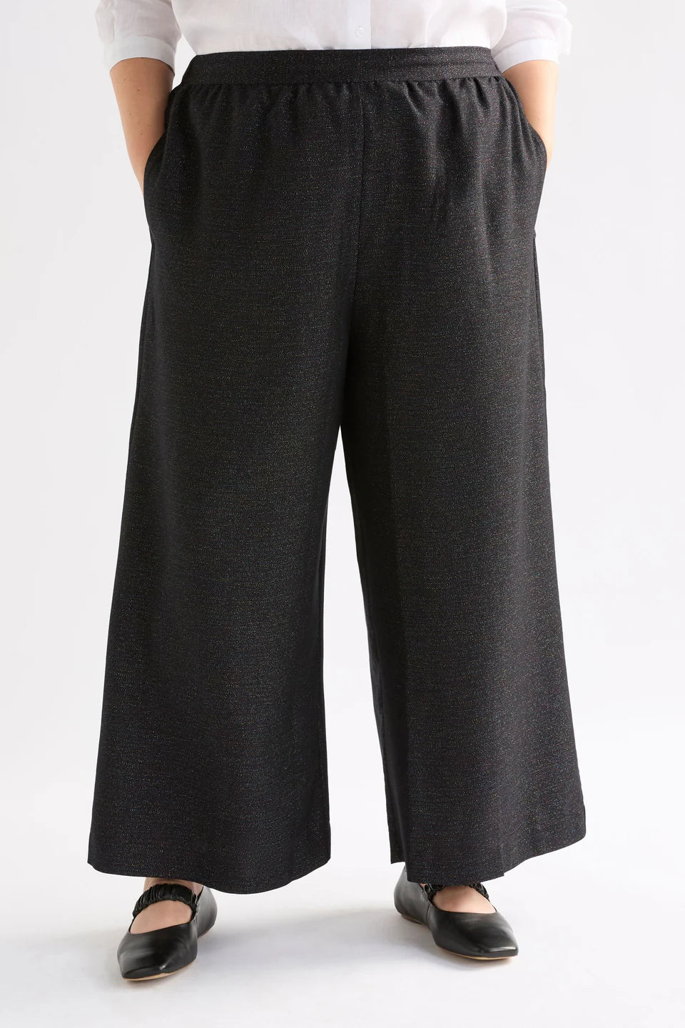 Add some subtle evening sparkle to your outfits with the Tulle Pant. These full-length, wide leg pants are crafted from a lightweight LENZING™ ECOVERO™ viscose blend with a metallic Lurex thread throughout, creating multi-coloured metallic shine and soft fluid drape. Finished with an internal drawstring tie with elasticated back and soft gathers providing an adjustable fit. Style with the coordinating Tulle Top for a glamourous coordinated look or with more simple tops for day-to-day outfitting.