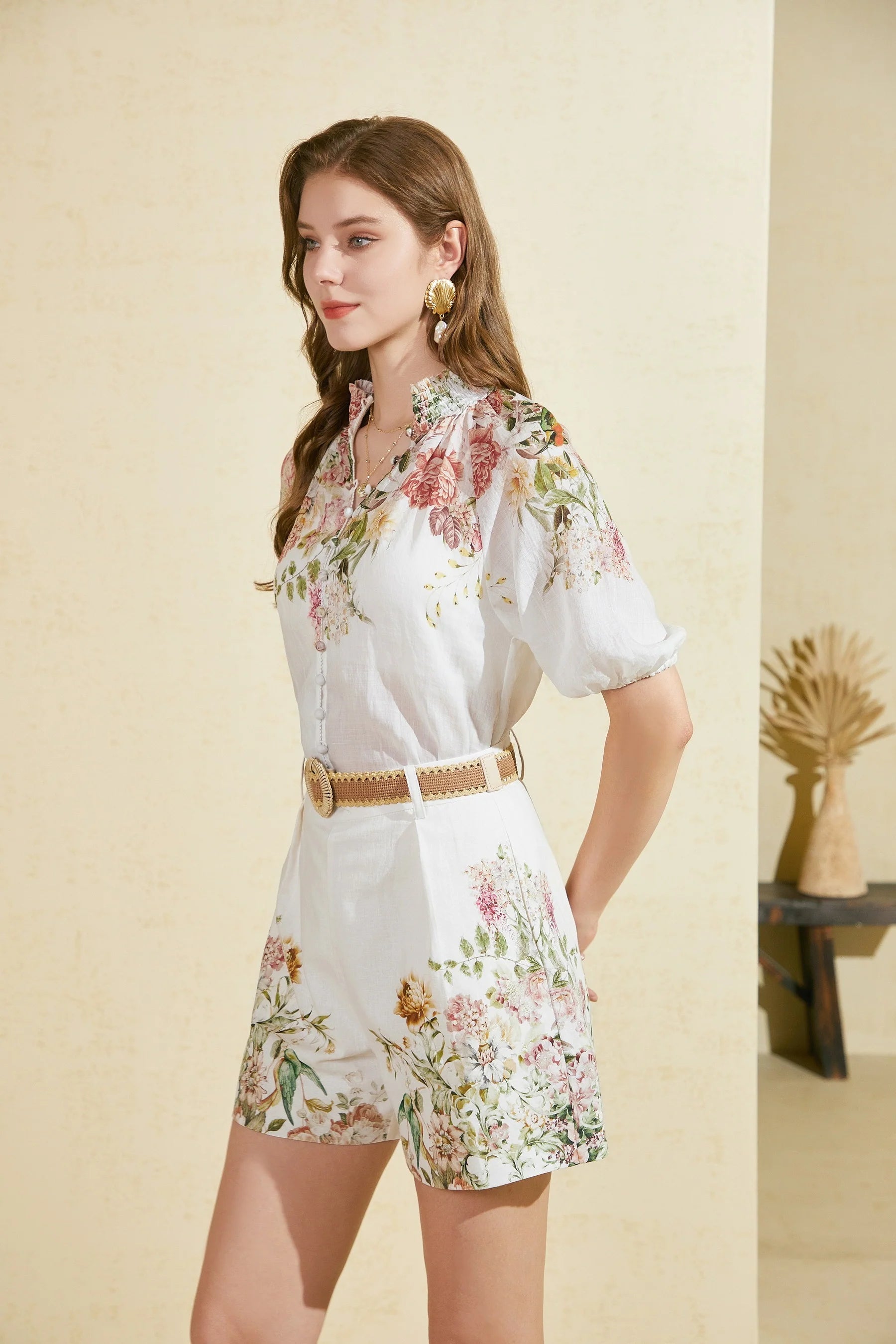 Nathan shorts are predominantly ivory or soft white, offering a clean, refined backdrop that accentuates the intricate print and natural texture of the tencel-linen fabric. A vivid, botanical garden scene blooms along the hem and side panels of the shorts. Lush florals in muted hues of yellow, rose pink, and soft peach with verdant green foliage. Charming birds in gentle shades of teal and green with golden accents perched delicately among the flowers.