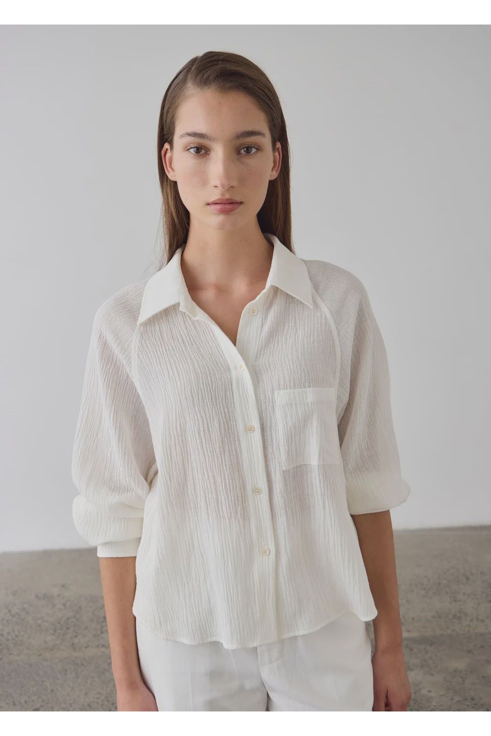 Soft structure meets everyday ease. This woman's raglan sleeve shirt is cut from a textured cotton-linen blend in off white, giving it a light, breathable feel with just the right amount of shape. The full raglan sleeve creates a soft, billowy silhouette, balanced by a clean front and single chest pocket.
