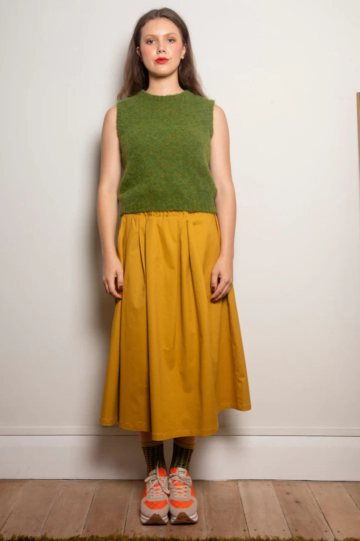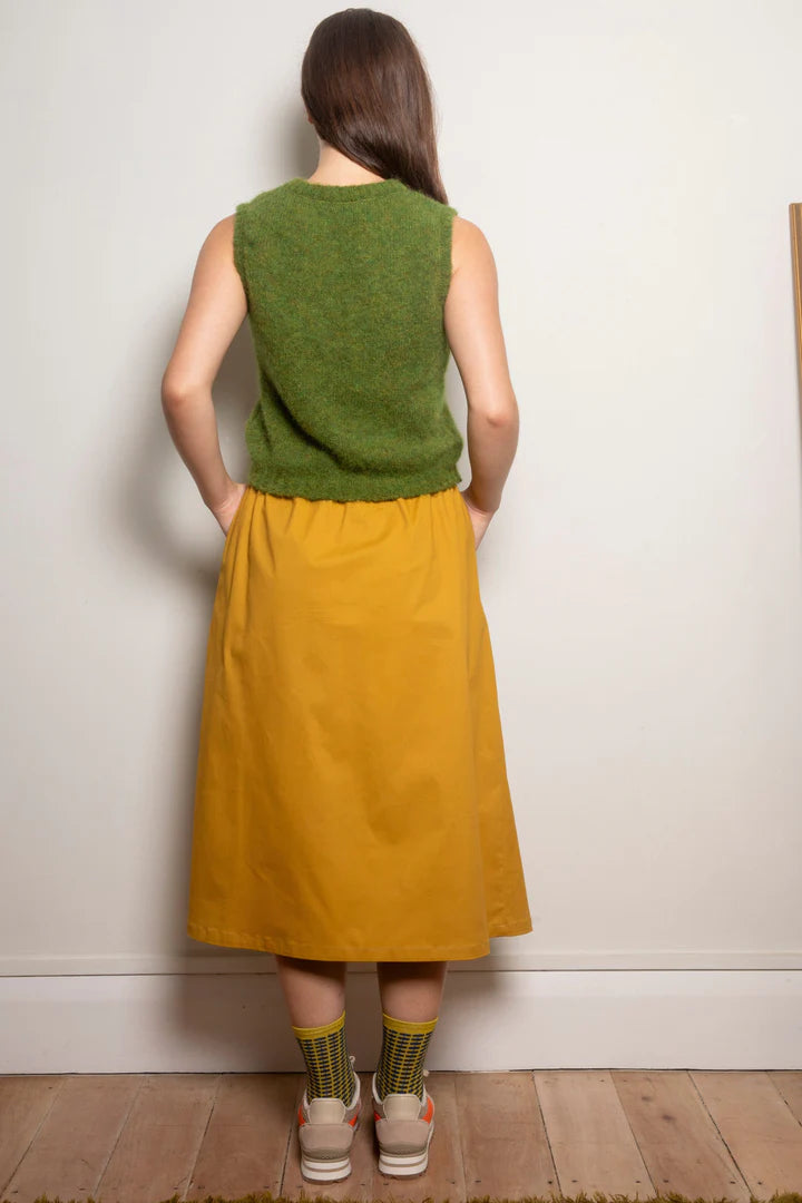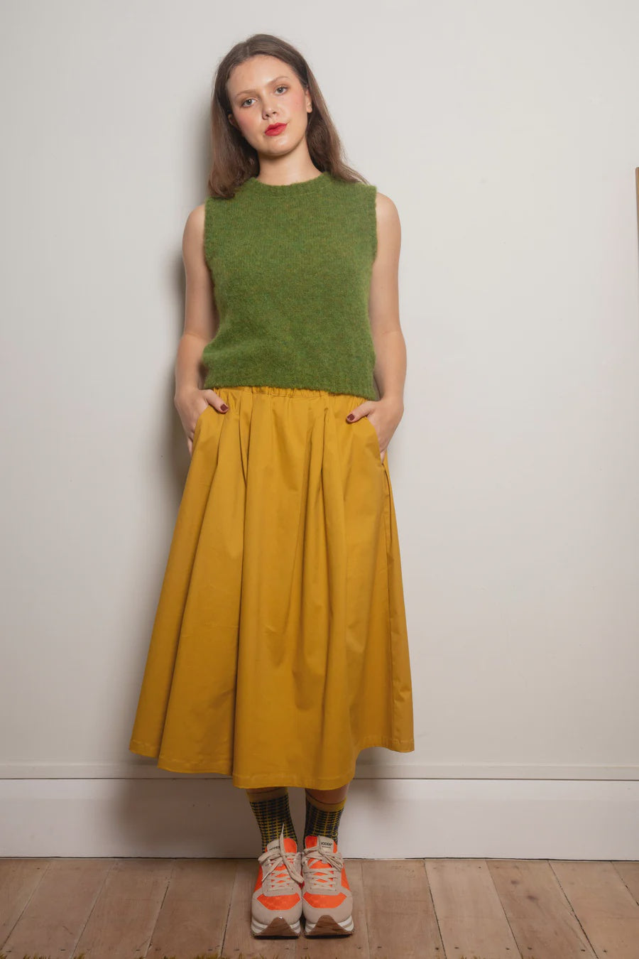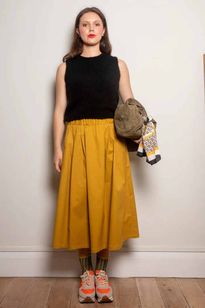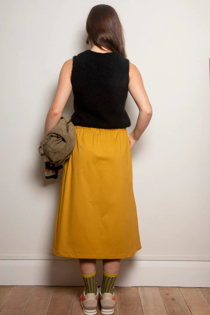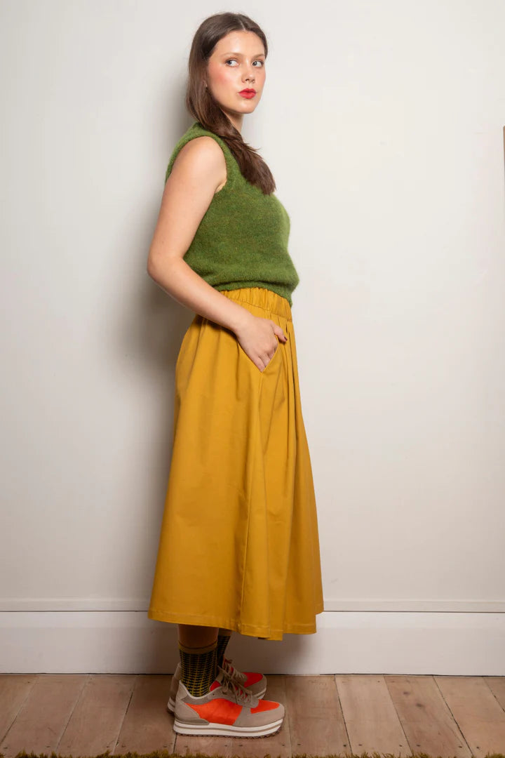 The Dalston Sapphire Skirt in vibrant saffron is a midi-length style with a wide comfortable elastic waistband and front side pockets. Its flattering front pleats are designed to lie smoothly across the tummy and subtly to the sides. A seasonal offering the Sapphire Skirt is the skirt you will wear on repeat.