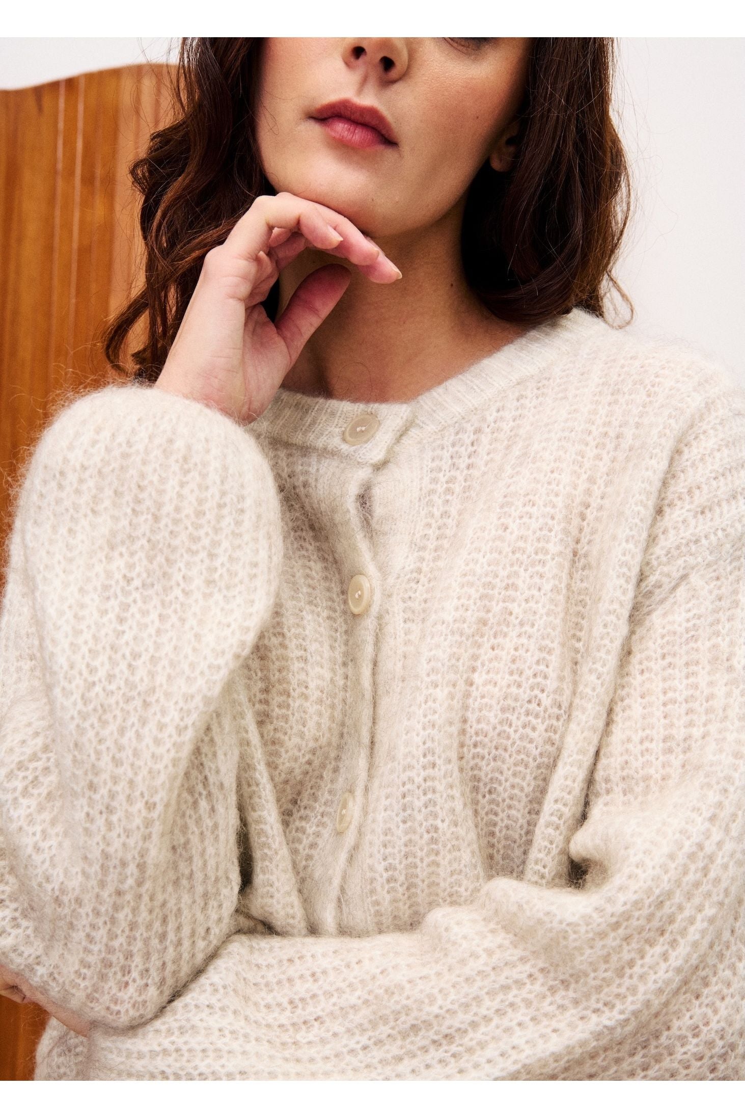 Soft texture meets everyday ease in the Miano Cardi. Knitted in a cosy wool and mohair blend, it offers warmth without heaviness, while the clean round neckline and simple button front keep the silhouette refined and versatile.