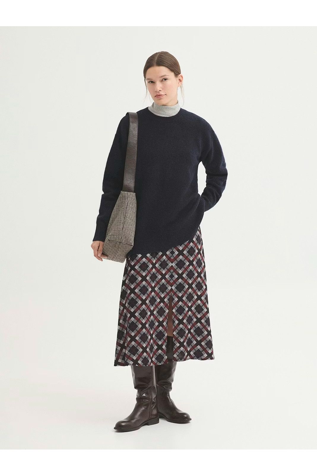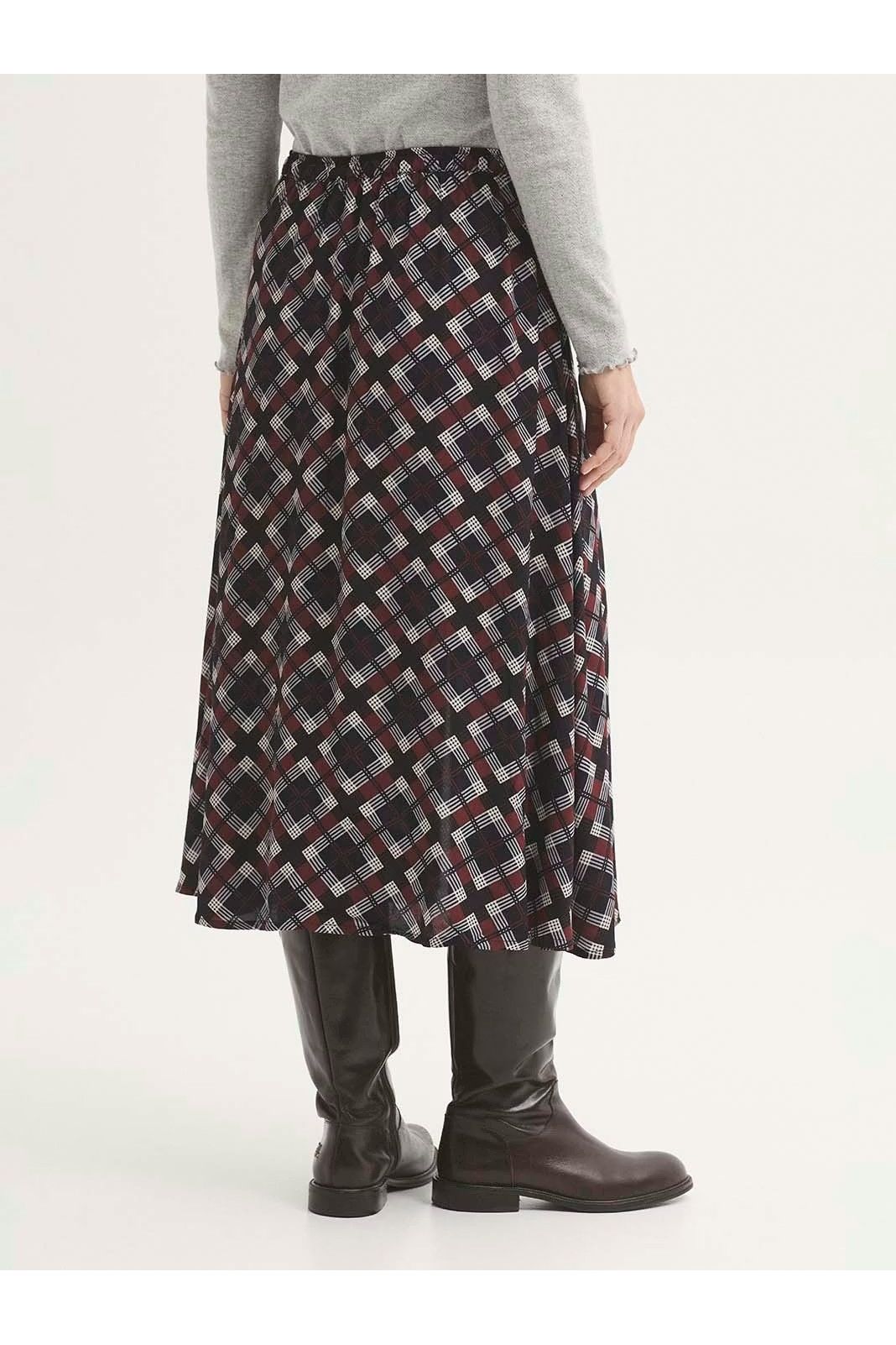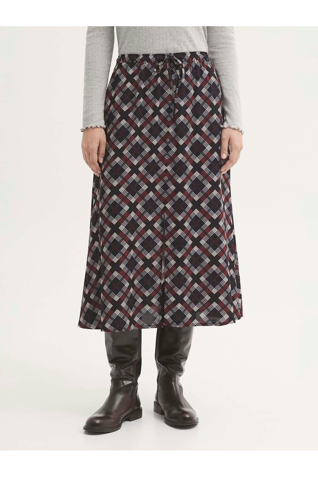 A flared skirt crafted in soft viscose crêpe with a subtle checkered print. Designed with a concealed elasticated waistband and self-fabric tie for an easy, comfortable fit. Finished with a front hem slit for effortless movement.